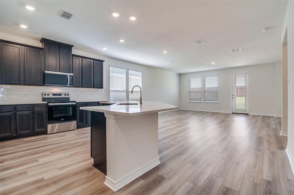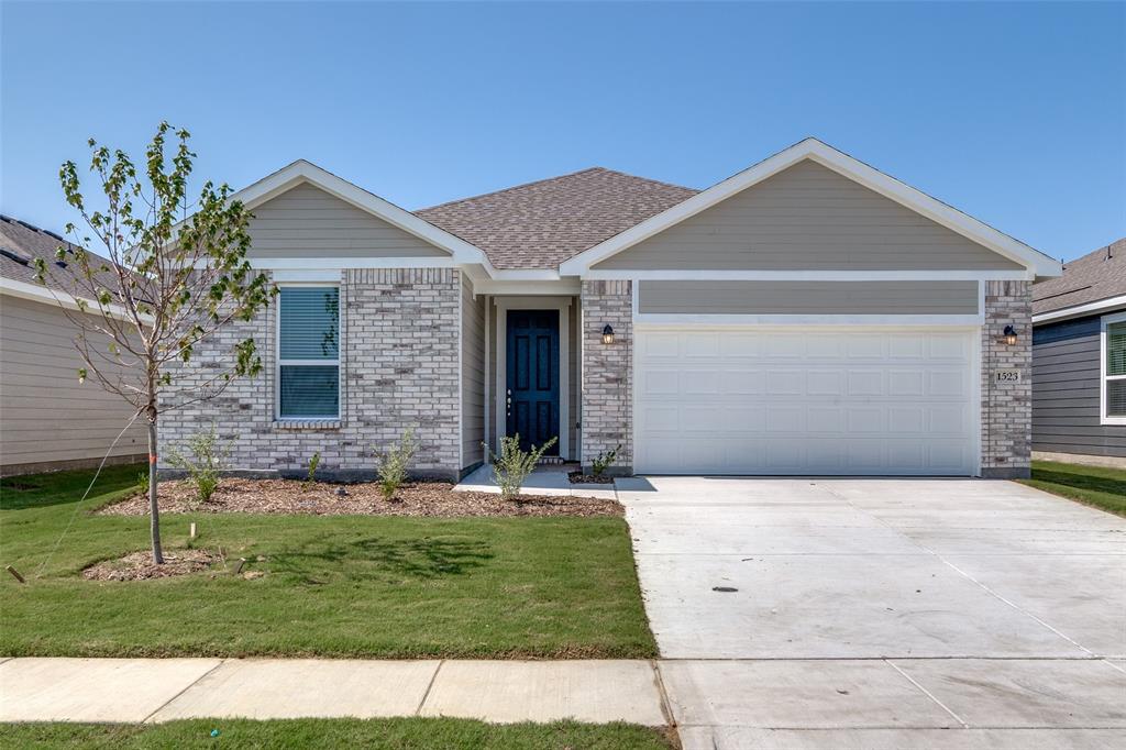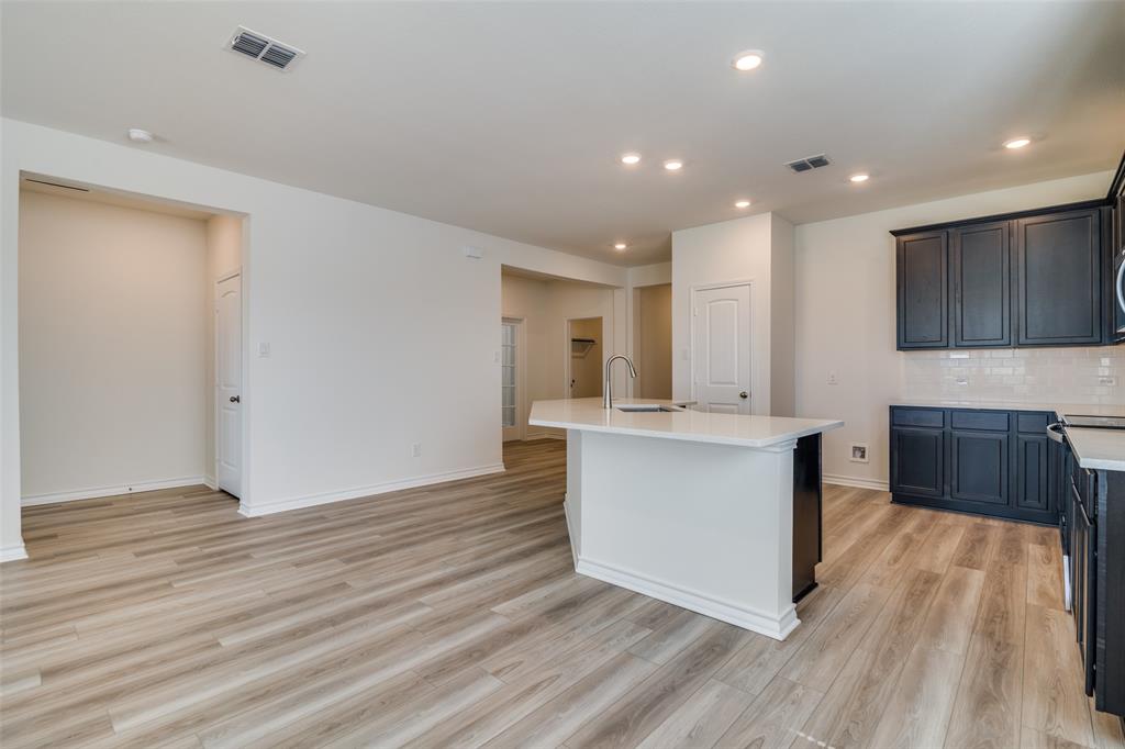 Discover the ease of one-story living in this KB Home featuring a 2-car garage and a versatile den with doors. The kitchen boasts stainless steel appliances, a breakfast bar, quartz countertops, and a decorative tile backsplash. The primary bath offers a raised vanity, quartz countertops, and a tub-shower with a tile surround. Enjoy the outdoors with a covered patio and automatic full sprinkler system. Delight in decorative touches like USB ports, 2-inch cordless blinds, and a Kwikset smartkey entry. Experience comfort and convenience in every detail of this home.