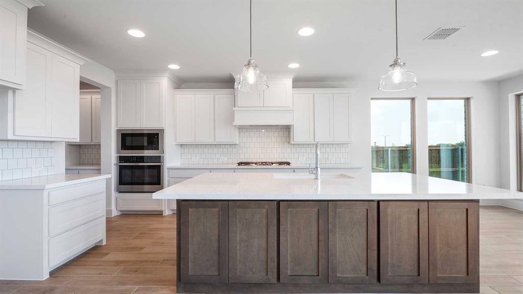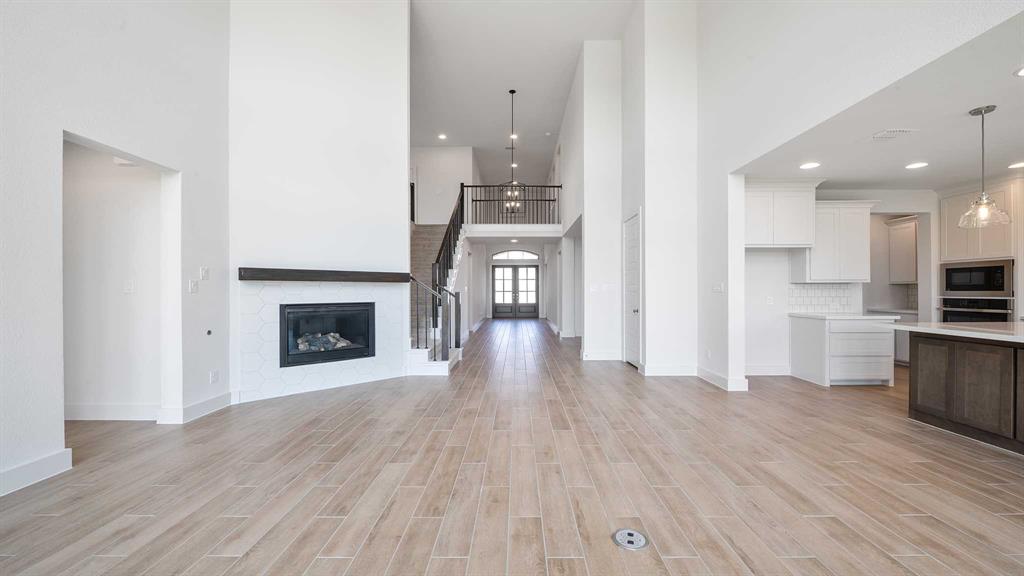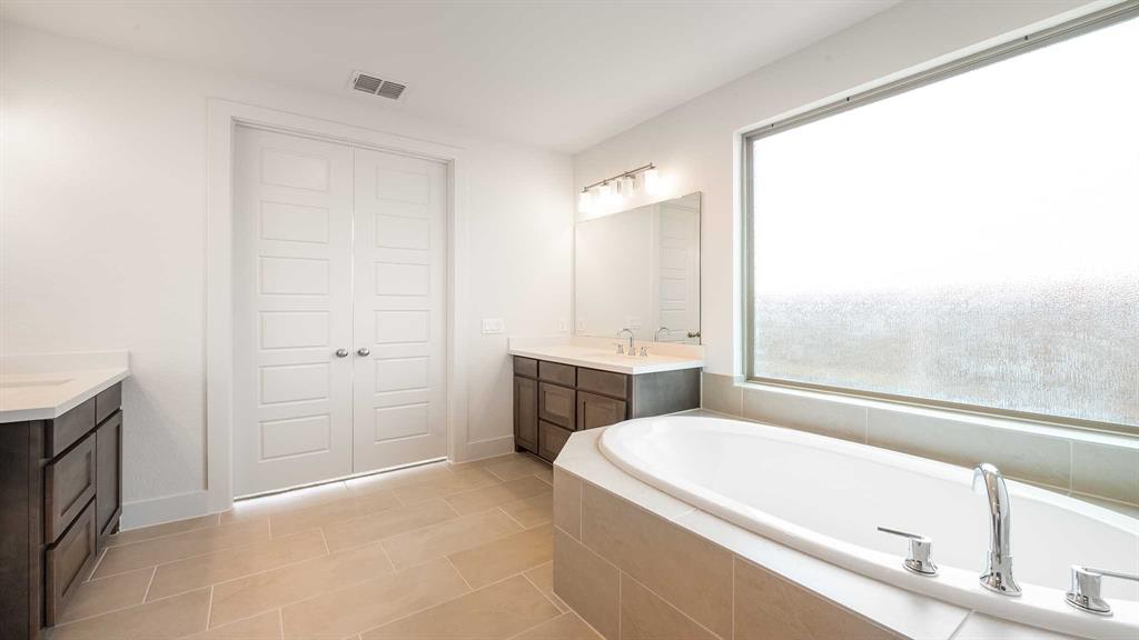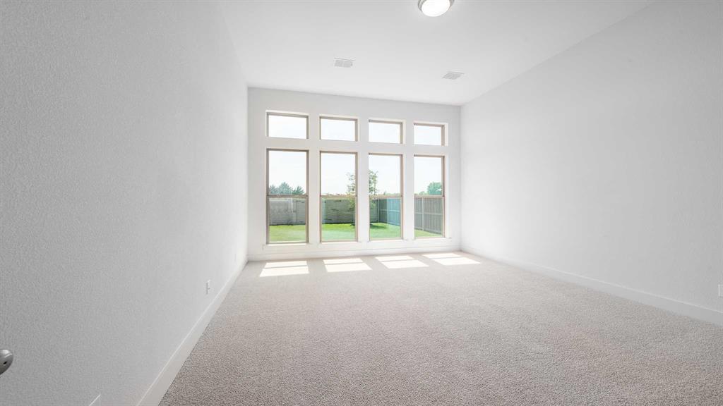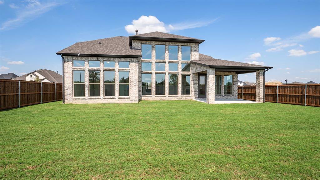 Home office with French doors set at two-story entry. Formal dining room across from staircase. Two-story family room opens to kitchen and morning area. Family room features a wood mantel fireplace and wall of windows. Kitchen features deep walk-in pantry, Butler's pantry, 5-burner gas cooktop and large island with built-in seating space. First-floor primary suite includes bedroom with wall of windows. Double doors lead to primary bath with dual vanities, garden tub, separate glass-enclosed shower and two walk-in closets. An additional bedroom is downstairs. A game room, media room and secondary bedrooms are upstairs. Covered backyard patio. Mud room off three-car garage.