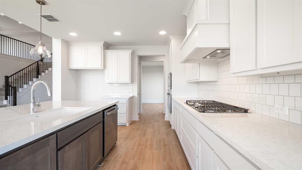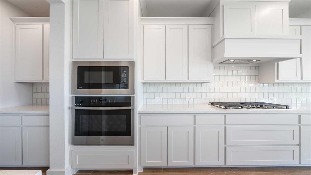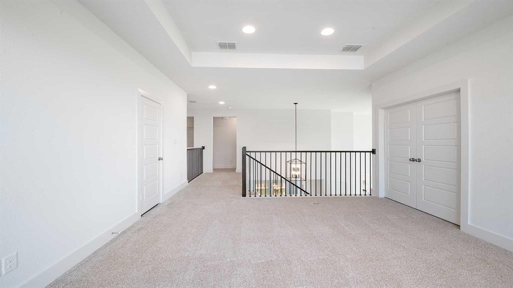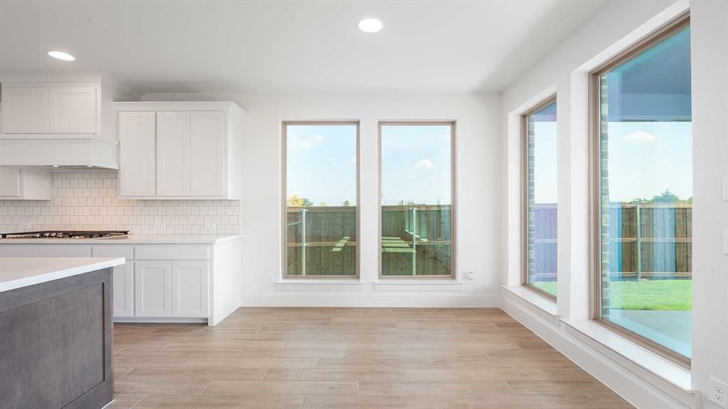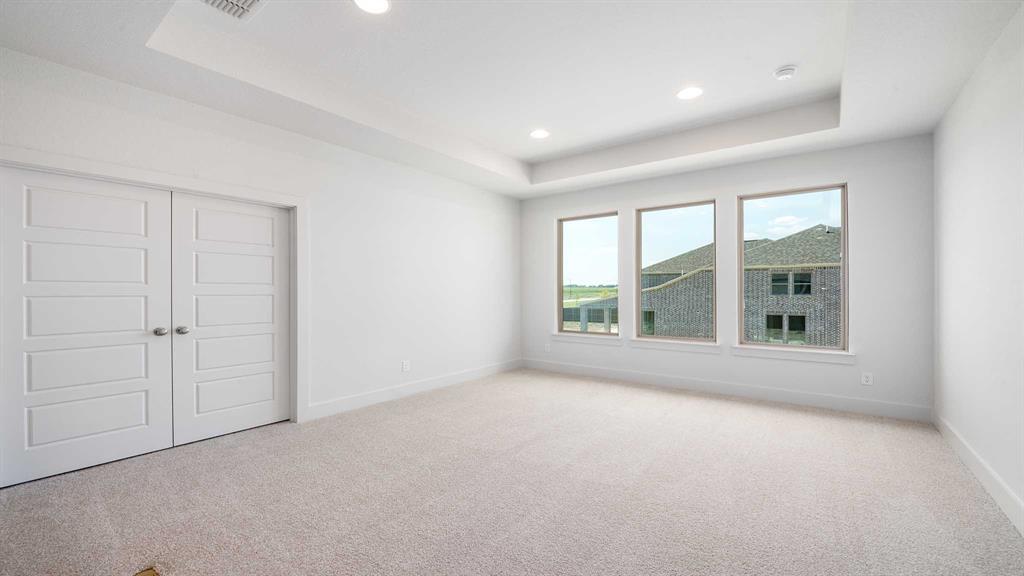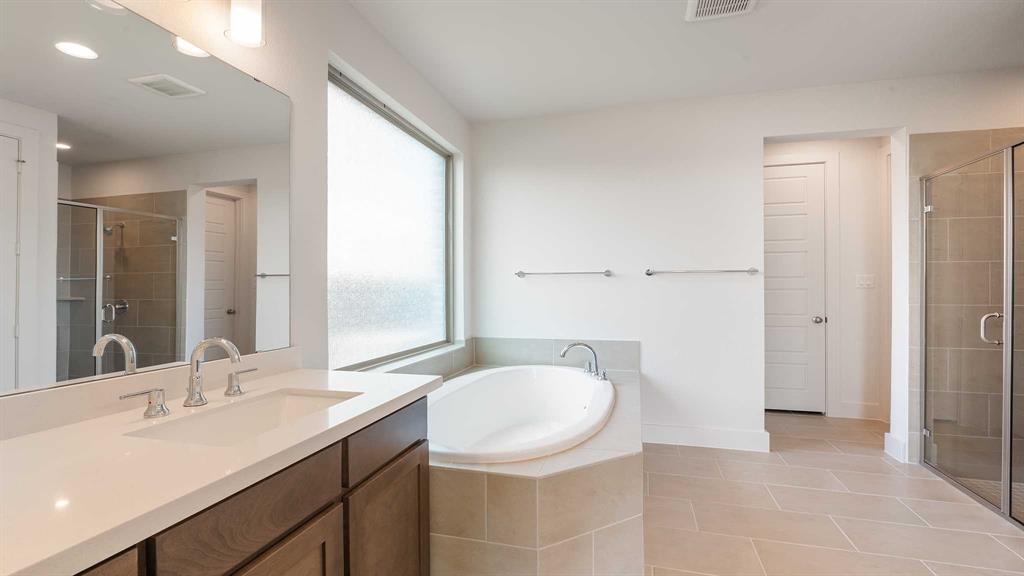 Home office with French doors set at two-story entry. Formal dining room across from staircase. Two-story family room opens to kitchen and morning area. Family room features a wood mantel fireplace and wall of windows. Kitchen features deep walk-in pantry, Butler's pantry, 5-burner gas cooktop and large island with built-in seating space. First-floor primary suite includes bedroom with wall of windows. Double doors lead to primary bath with dual vanities, garden tub, separate glass-enclosed shower and two walk-in closets. An additional bedroom is downstairs. A game room, media room and secondary bedrooms are upstairs. Covered backyard patio. Mud room off three-car garage.