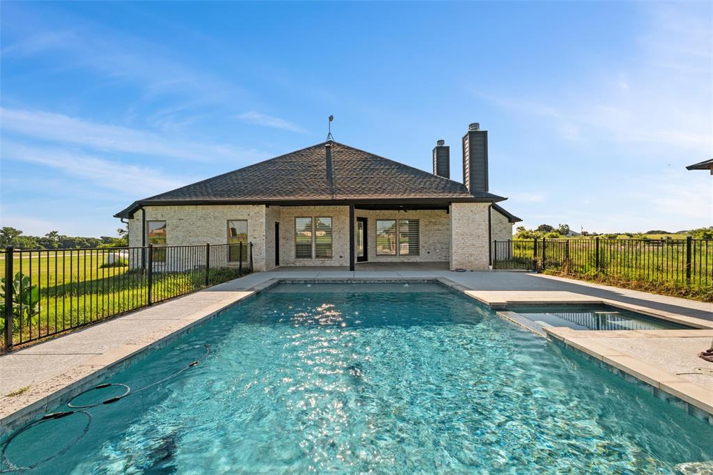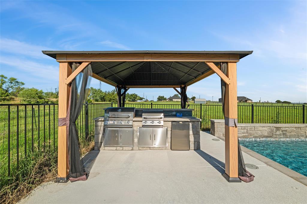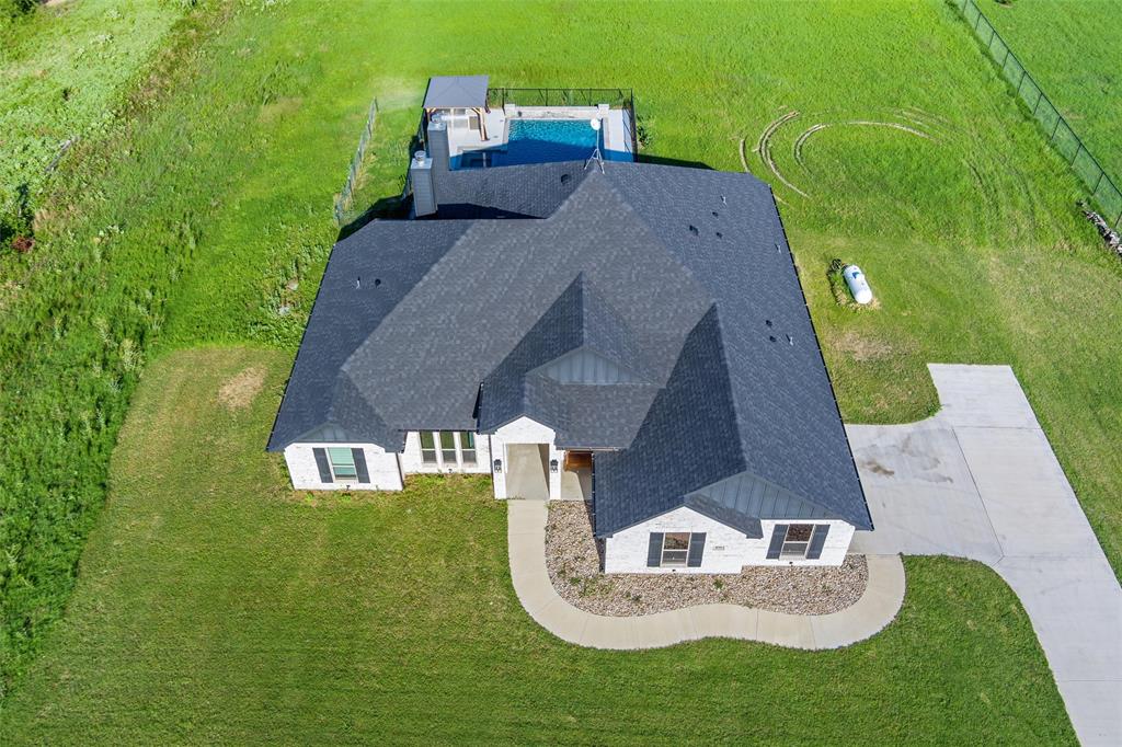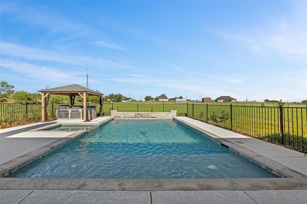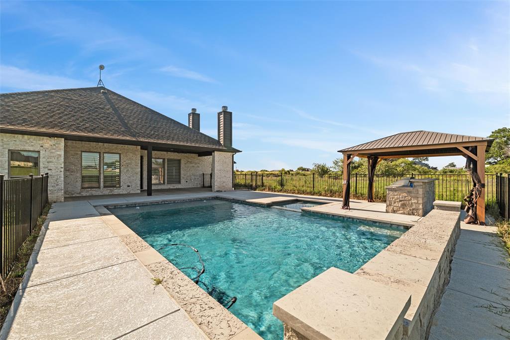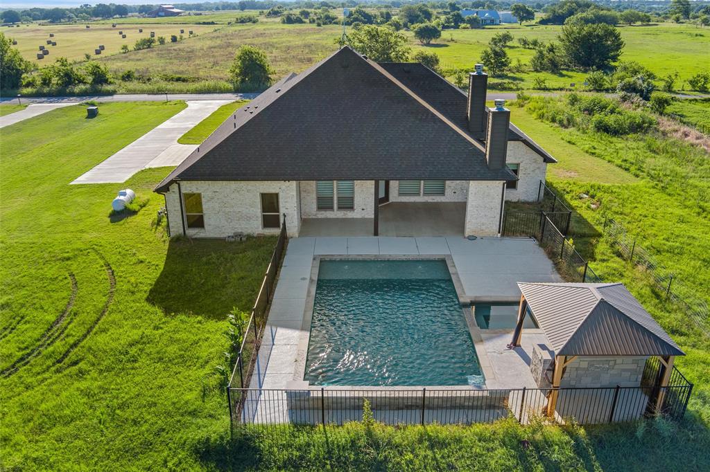 Priced to sell, this property has it all! Built in 2021 this modern farmhouse style custom home on 1.8 acres is ready for its new owner! vacation in your own backyard with this incredible in ground pool which features a waterfall and built in spa! HUGE covered patio with wood burning fireplace! In addition to the large patio this dream property also has a cabana with an outdoor kitchen & bar! Built in stainless steel fridge, grill & griddle ALL INCLUDED in the Cabana! Large windows in the back of the home allow you to step inside the front door & see straight to your backyard oasis. High ceilings & custom molding define the home's grand, architectural features. UPGRADES GALORE in this kitchen including premium quartz countertops, custom wood vent hood, sleek glass cooktop, oven tower, shaker style wood cabinetry with trimmed out island, pot drawers, additional cabinetry on seating side of island, farm sink, custom glass pantry door and a built-in trash drawer. Retreat to this luxurious primary suite, with private patio access also boasting a spa-inspired en-suite bathroom complete with double vanities, an oversized glass shower with a built-in seat, and a separate toilet room for ultimate privacy and functionality. Even the secondary bath has lots of upgrades-like the fully tiled shower-tub, thick granite countertop, wood framed mirror and built in overhead cabinets. The laundry room is conveniently located off of the large primary closet! Split floorplan with an open kitchen and living room in the middle. Great storage space throughout with ample closets in each room plus several hall closets and a custom mud bench coming in from the garage. Speaking of garage, if you are looking for a hobby space the garage has an extra ~9'x6' area in the back. NO HOA! Low taxes being outside of the city limits (2024 tax rate 1.2393% from Realist Report)! Easy to maintain xeriscape beds ready for your touch! This is a perfect place to enjoy outside in every season!