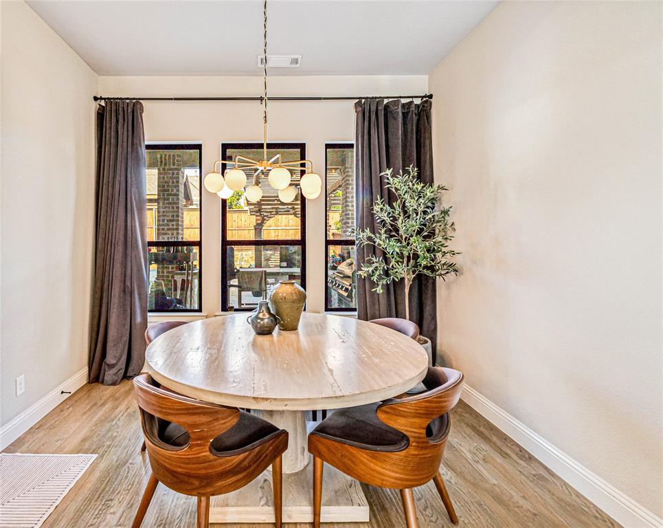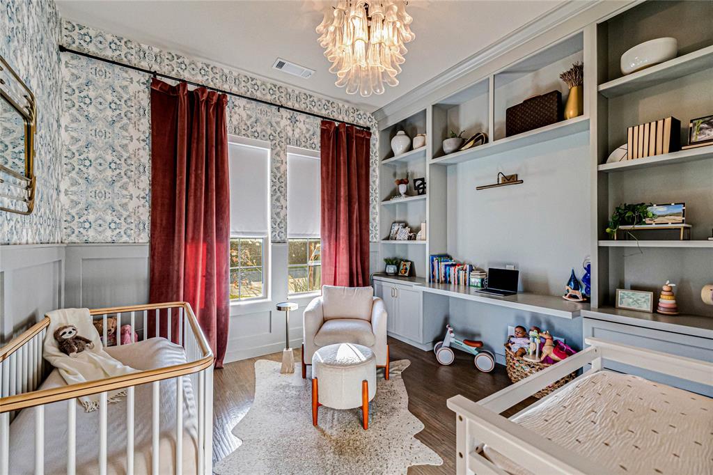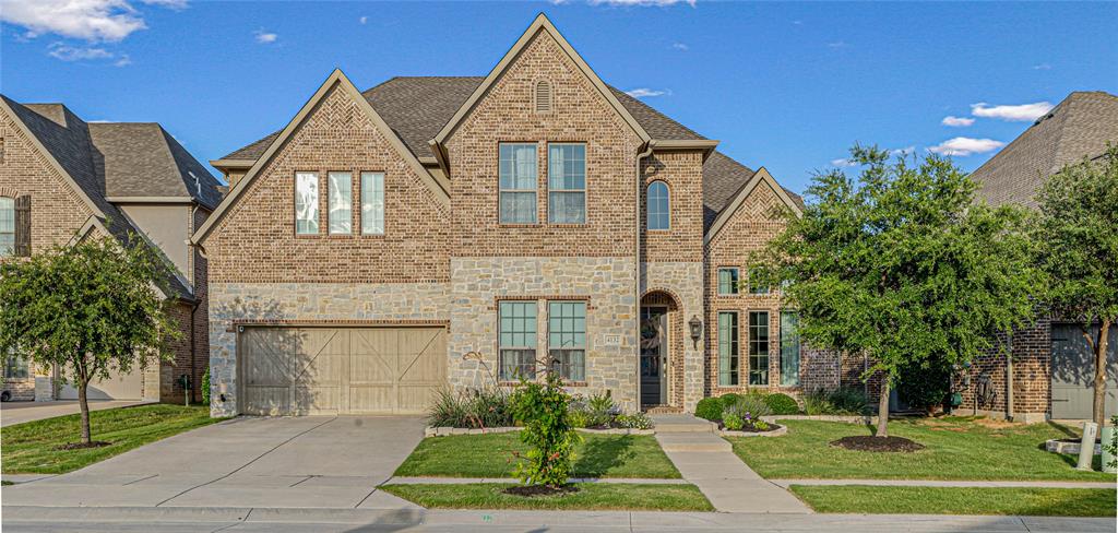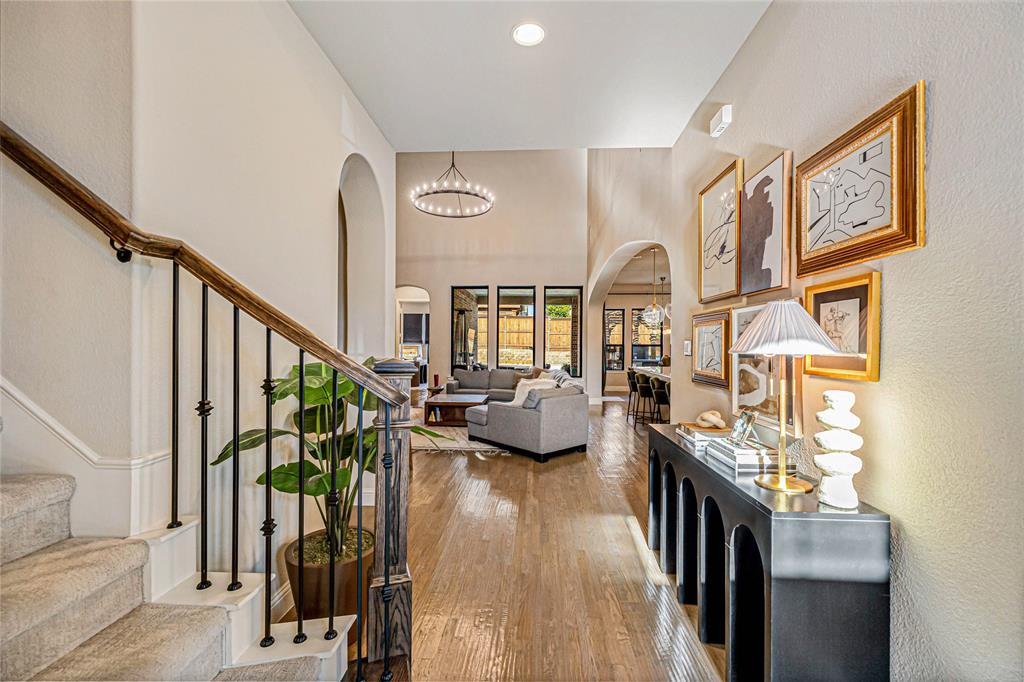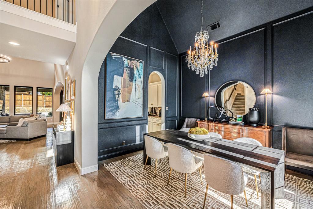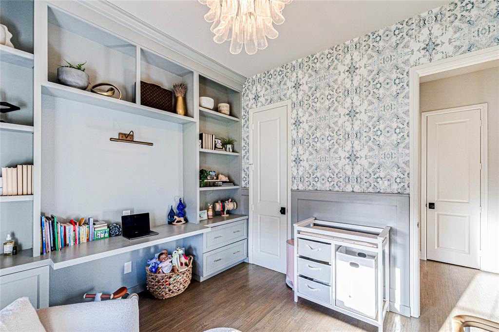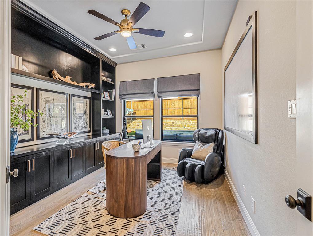 Built by Britton Homes and located in Celina’s desirable Light Farms – Hazel neighborhood, this beautifully updated home combines timeless architectural details with modern upgrades. Graceful interior archways and nailed-down hardwood floors create a warm, inviting atmosphere throughout the main level. The layout includes a dedicated office with custom built-ins and a flexible downstairs secondary bedroom featuring its own built-in workspace and designer wallpaper—ideal for guests or a second home office.