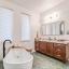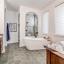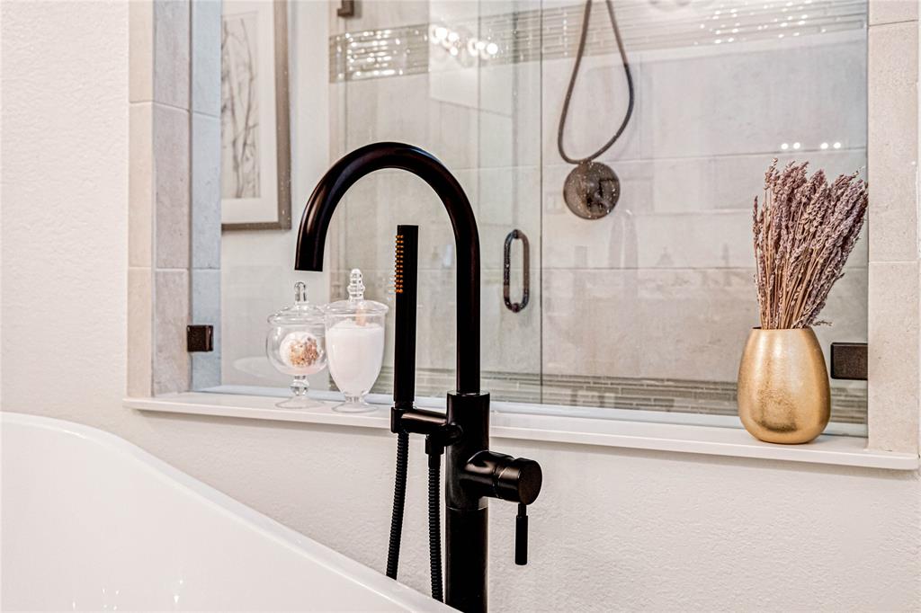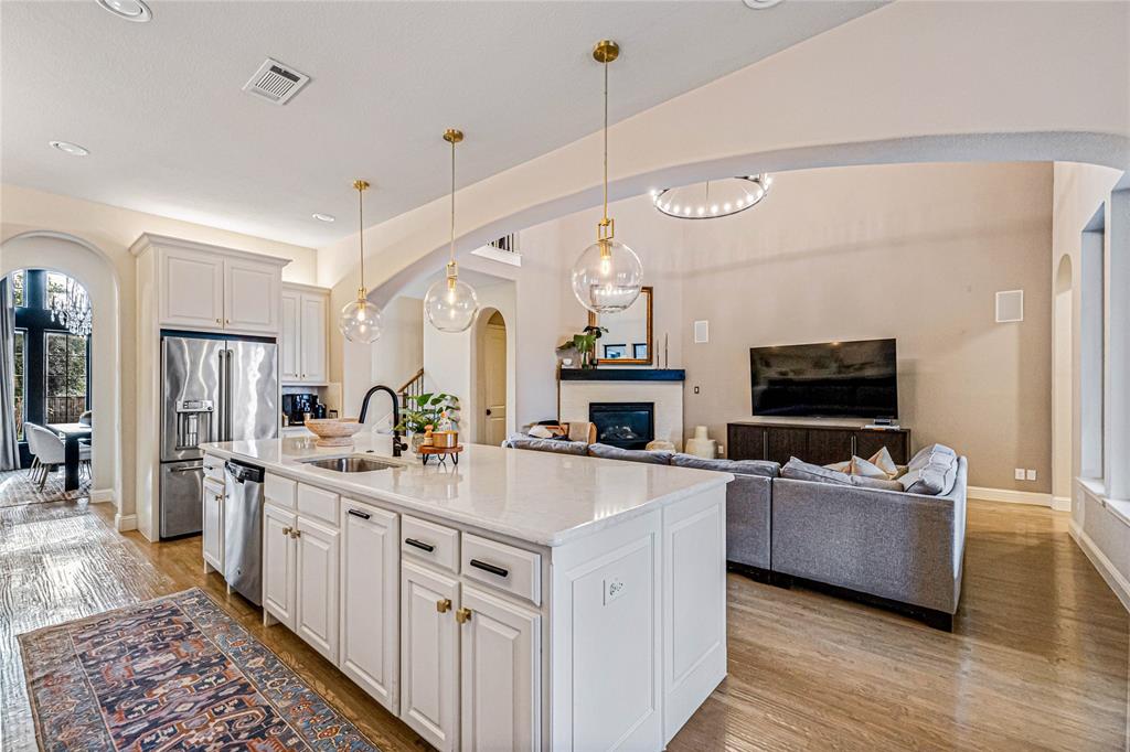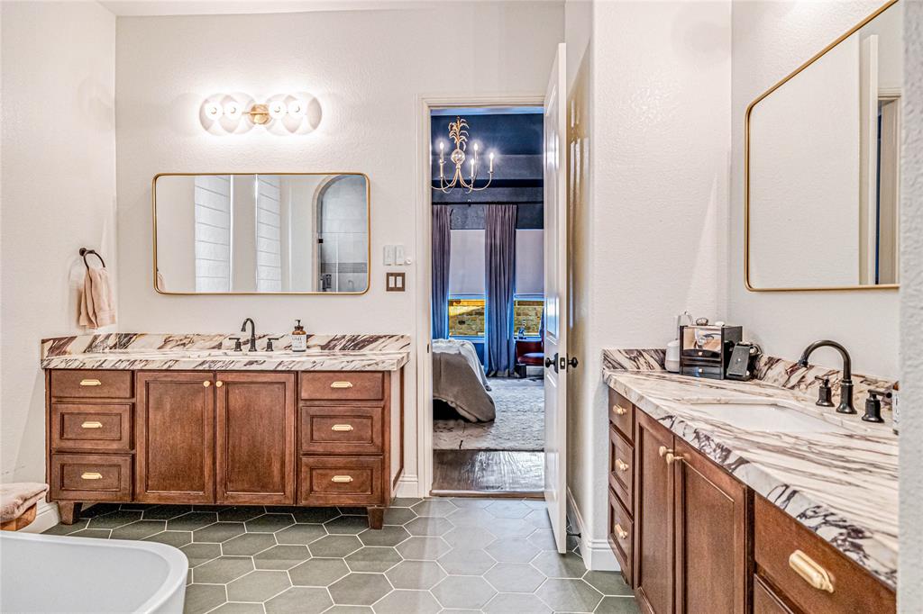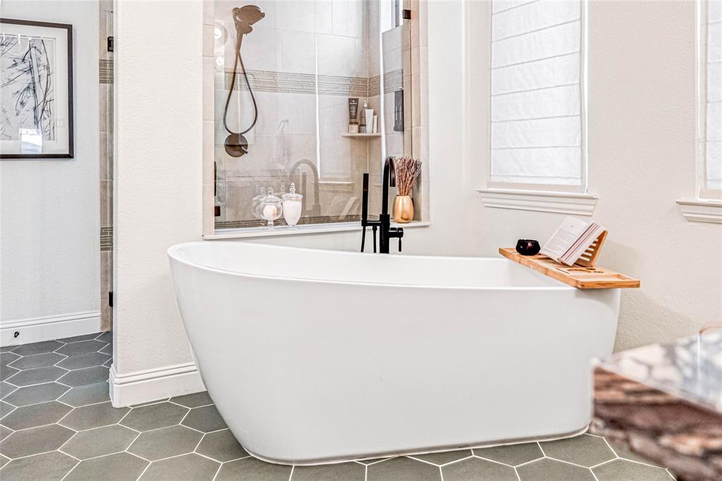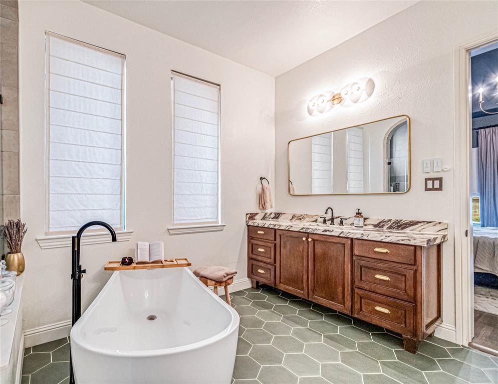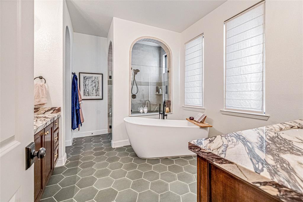 The chef’s kitchen impresses with quartz countertops, custom cabinetry, and double ovens. The primary suite offers wood floors, a custom closet, and a completely remodeled bathroom with dual vanities and a freestanding soaking tub.