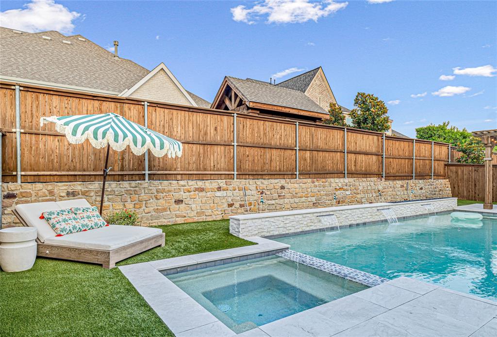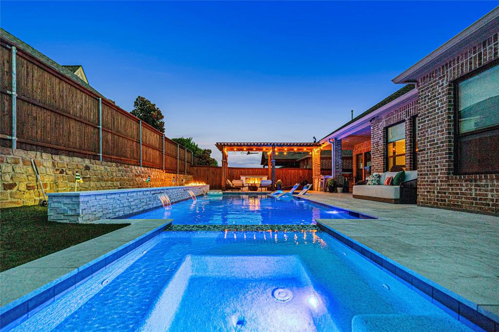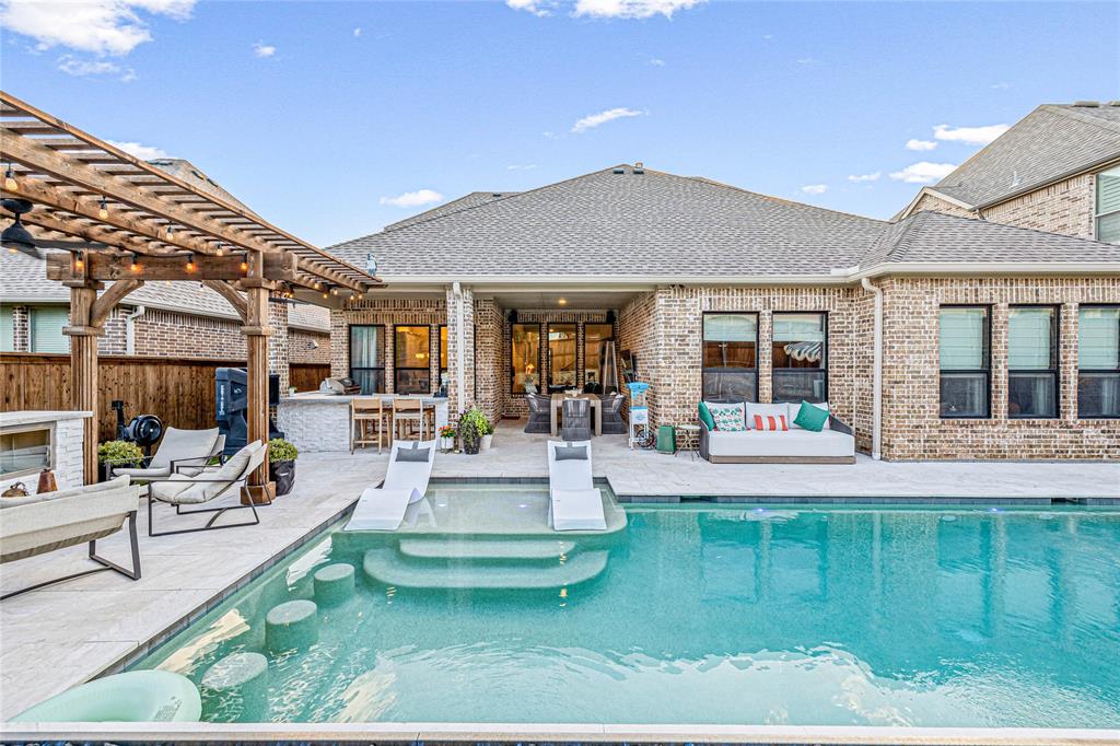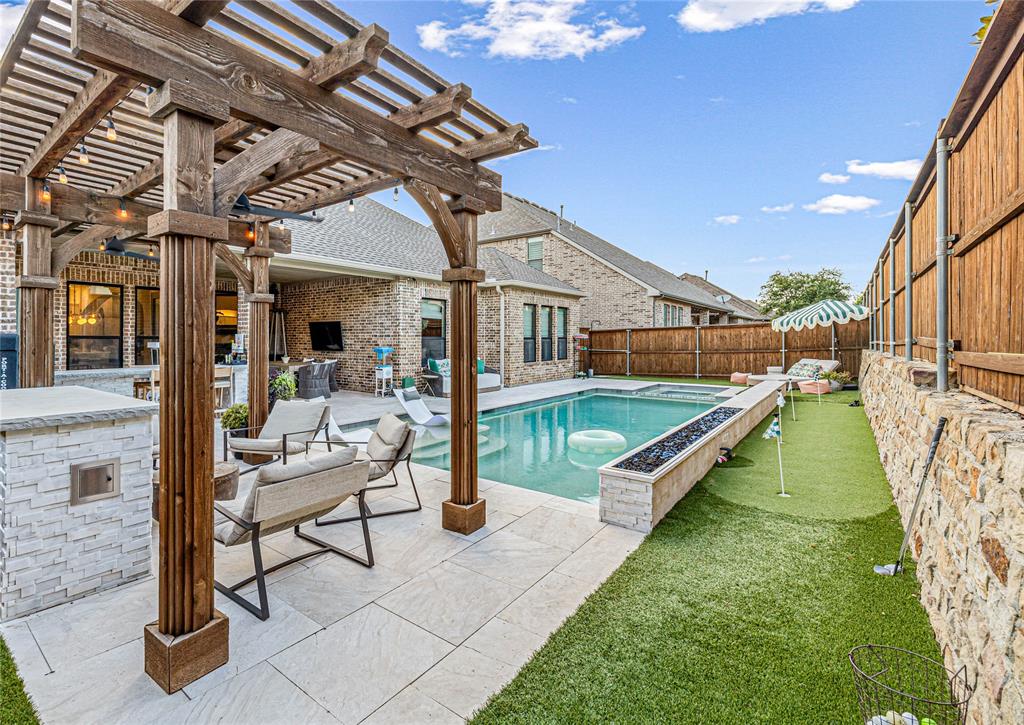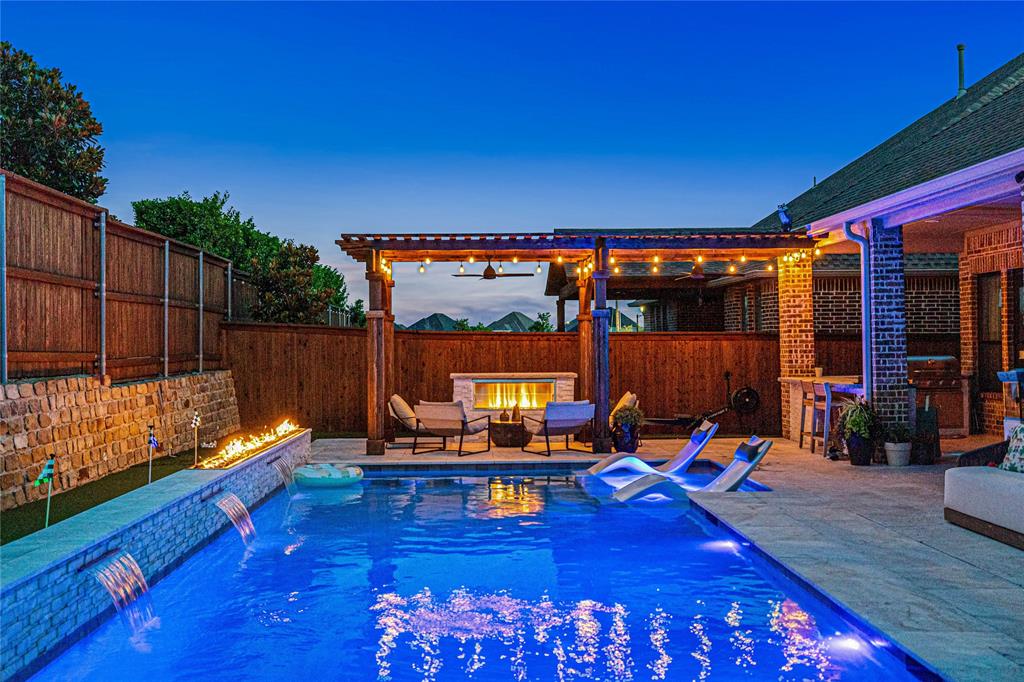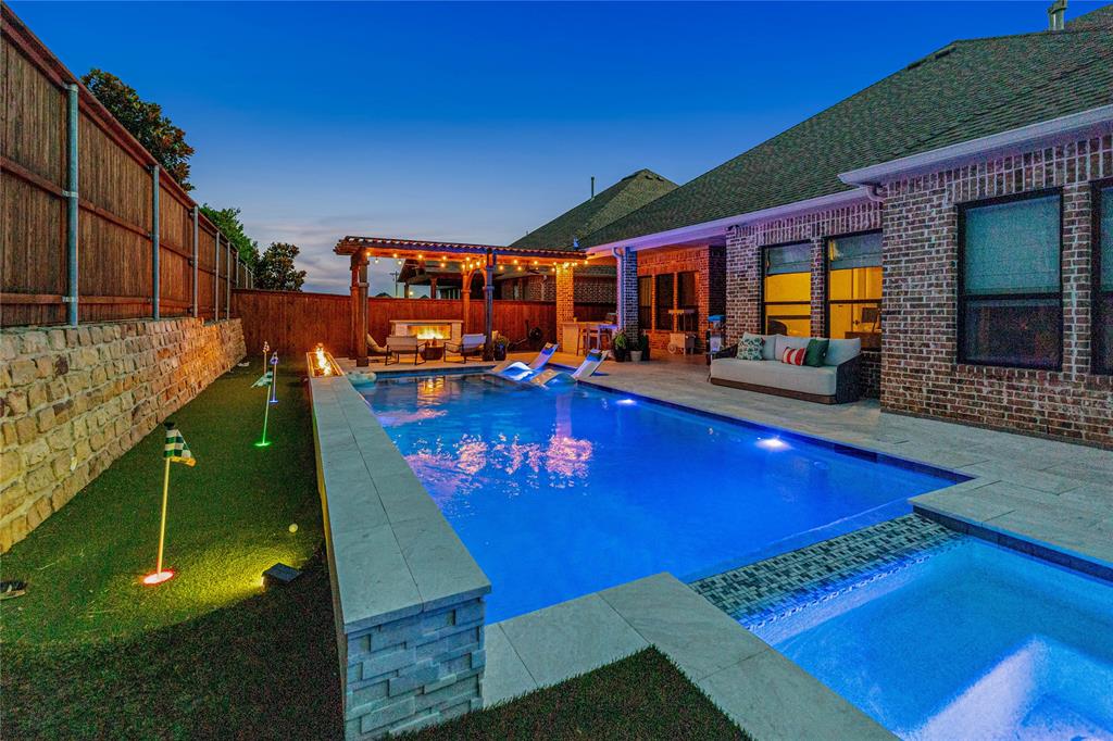 Step outside to a private backyard oasis designed for entertaining and relaxing, featuring a pool, outdoor kitchen, putting green, full turf landscaping, and two stunning fire features. Enjoy resort-style living in the heart of Light Farms, with access to top-tier amenities, parks, trails, pools, and award-winning Prosper ISD schools.