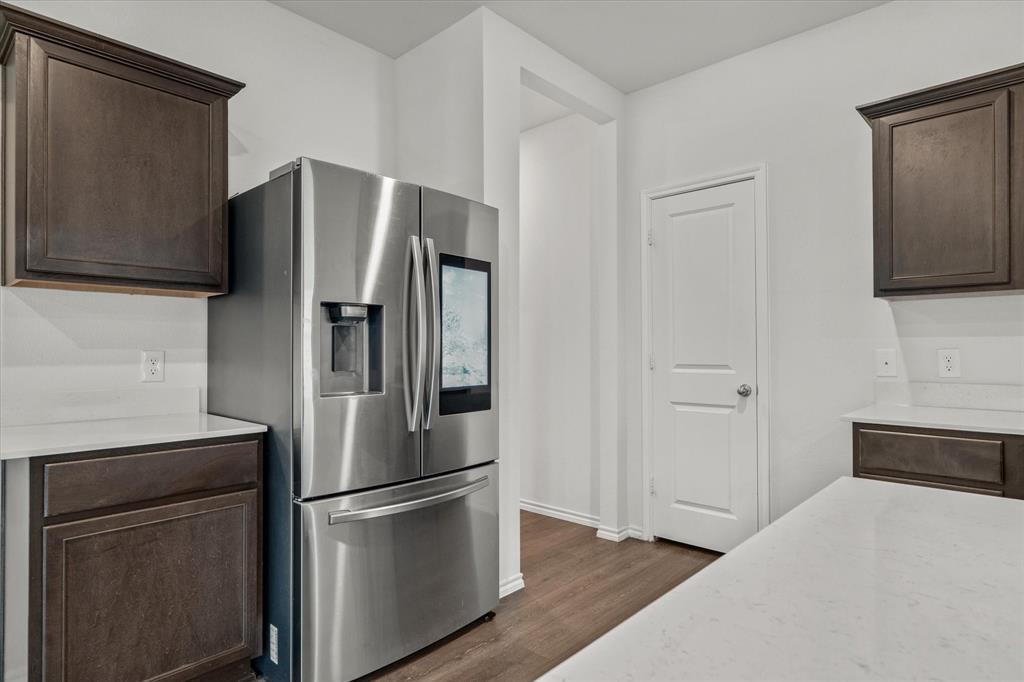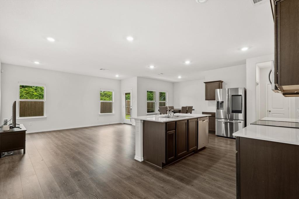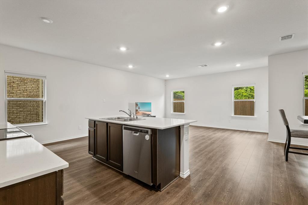 Designed for both everyday living and stylish entertaining, this open-concept floor plan is filled with natural light that highlights the inviting warmth of every space. Luxury vinyl plank flooring spans the main level, seamlessly connecting the spacious living area to a contemporary kitchen featuring sleek quartz countertops, a large center island, stainless steel appliances, and ample cabinet storage. Whether hosting a dinner party or enjoying a casual family night in, this kitchen is sure to impress and perform.