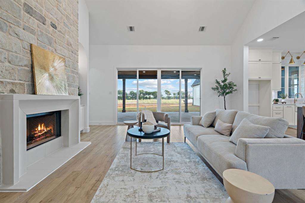 Welcome to your dream home, where modern luxury meets timeless farmhouse charm. This beautifully designed residence features soaring vaulted ceilings, warm wood beam accents, and a stunning floor-to-ceiling stone fireplace that serves as the centerpiece of the spacious living room.