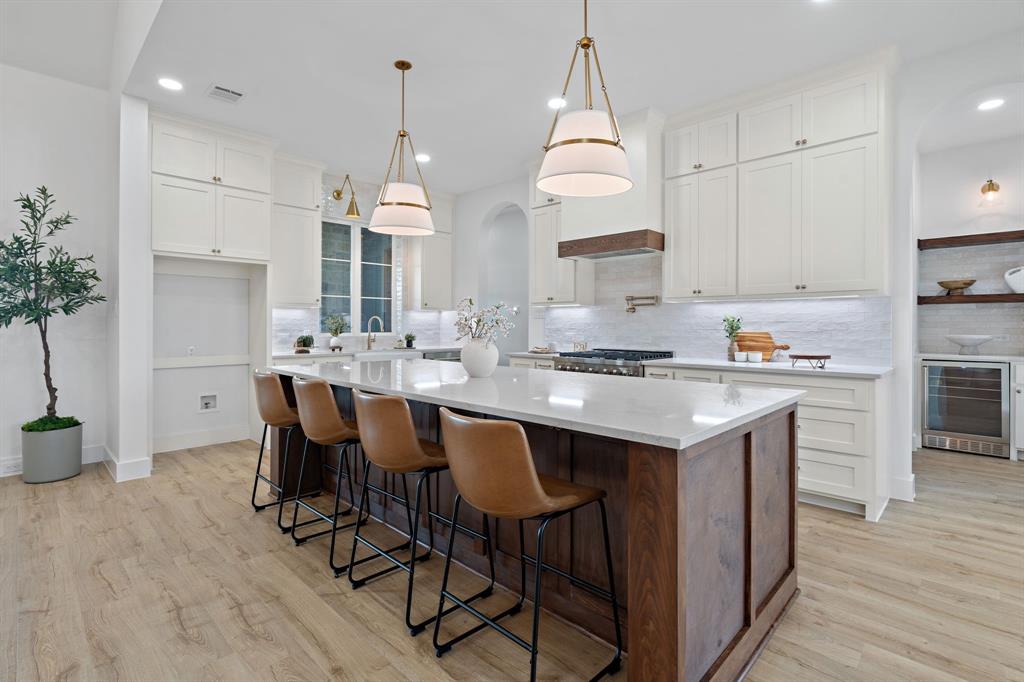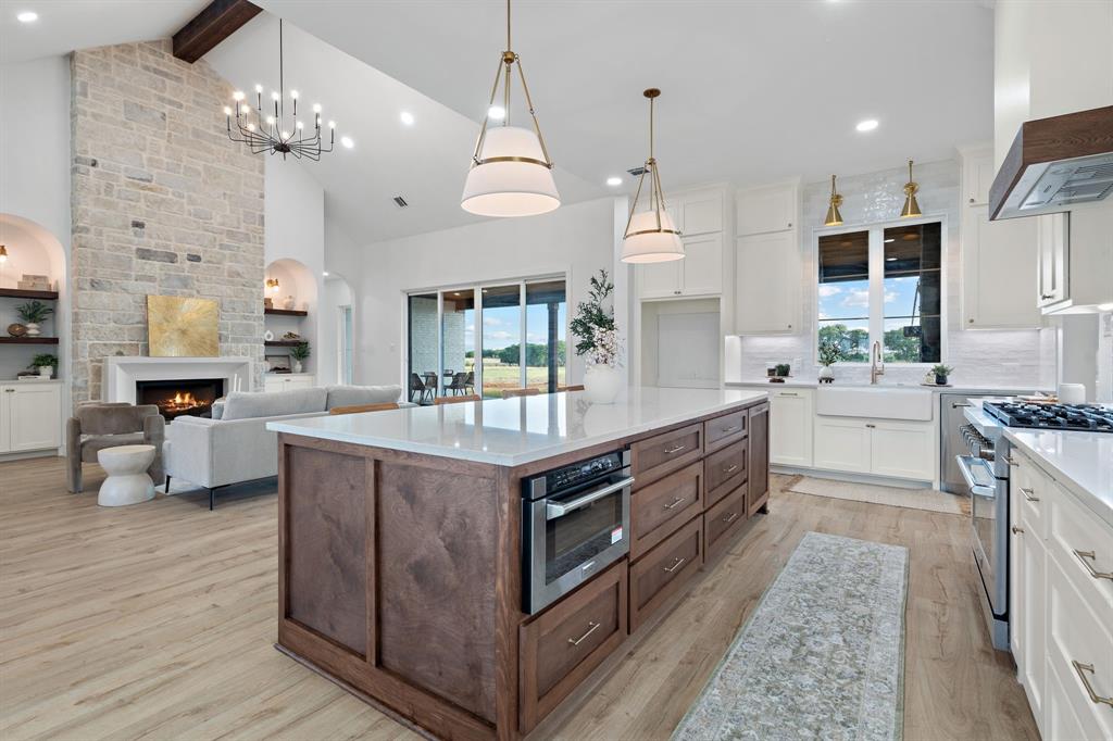 The open-concept layout seamlessly connects the gourmet kitchen complete with custom cabinetry, quartz countertops, high-end appliances, and oversized island seating, making it the perfect space for entertaining or relaxing with family.