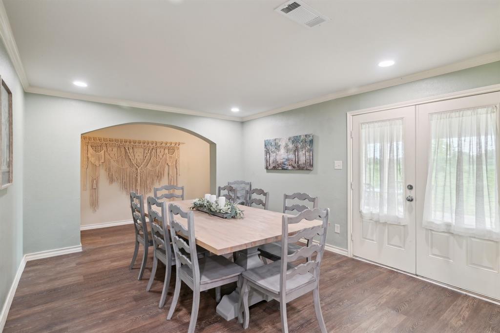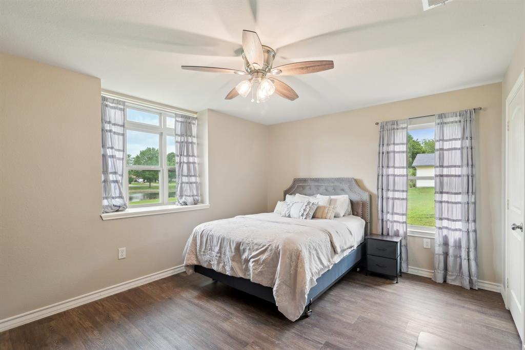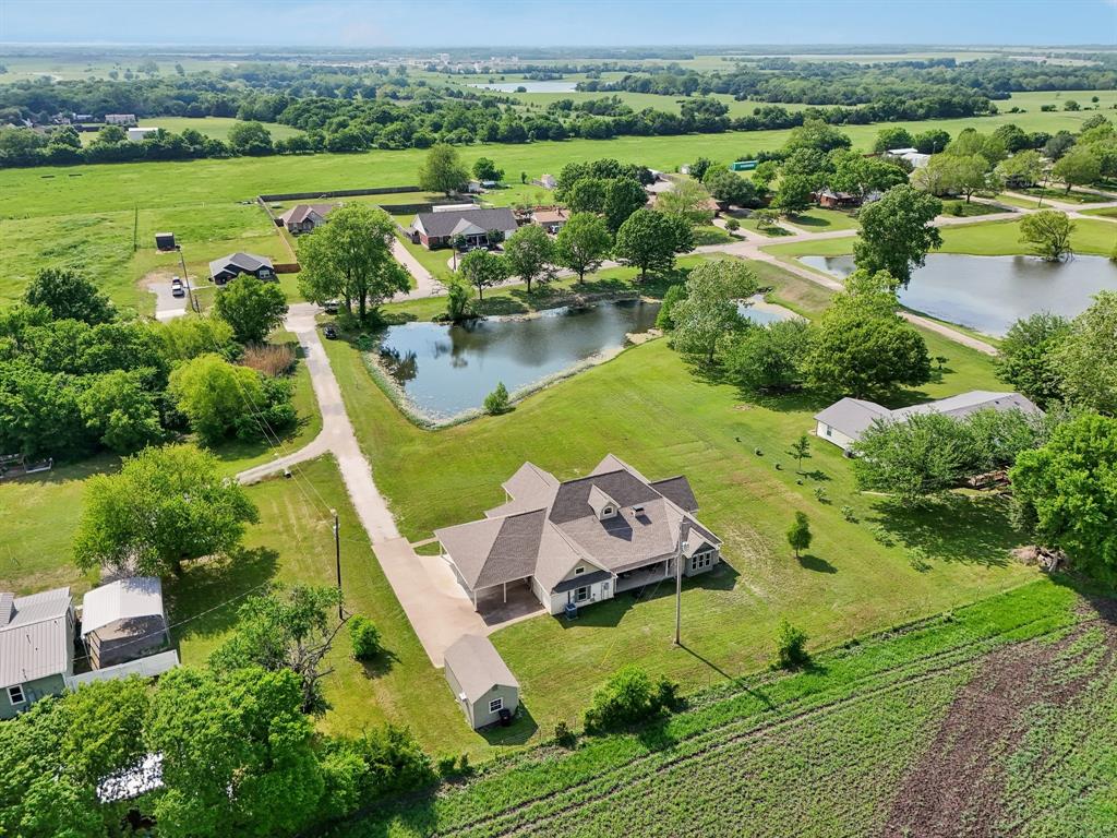 Welcome to your dream home nestled on 1.34 serene acres! This beautifully designed 5-bedroom, 3.5-bath property offers the perfect blend of function and charm with an open-concept layout and high-end finishes throughout. Featuring two primary suites—one ideal as an in-law suite—this home offers flexible living options for multi-generational families or guests. The gourmet kitchen is a showstopper with custom wood cabinetry, a farmhouse sink, a large island, and a premium 5-burner cooktop and convection double oven—perfect for hosting or everyday living. The main primary suite boasts a spa-like bathroom with a custom-tiled dual-head rainfall shower, deep soaking tub, pane glass windows, and stunning natural light. Enjoy practical touches like a spacious mudroom with a built-in desk, a well-appointed butler’s pantry, and easy-maintenance laminate wood flooring throughout. French doors lead to a large covered patio with a cozy fireplace and beadboard ceiling—ideal for relaxing or entertaining year-round. Outside, you'll find a peaceful pond in the front yard, a separate storage building, and plenty of space to roam, garden, or play. This property truly has it all—space, style, and smart design.