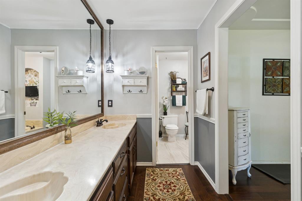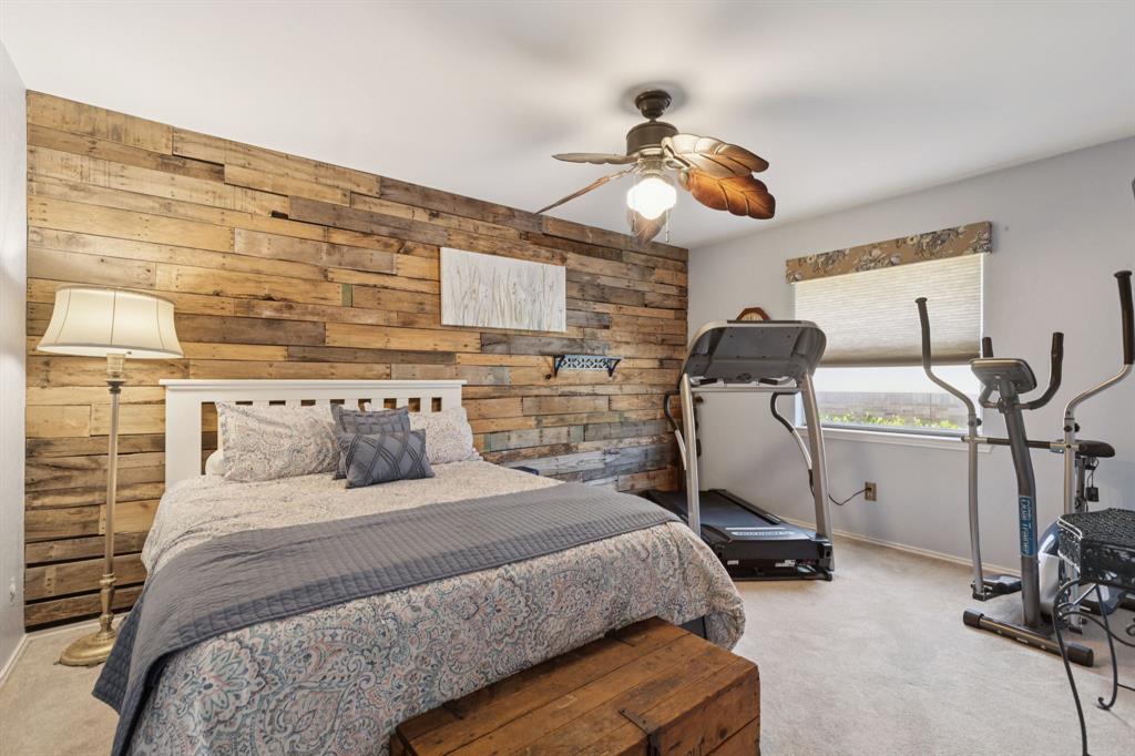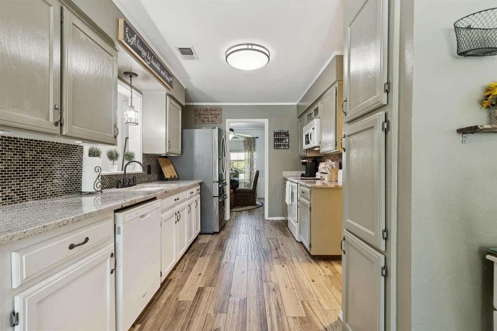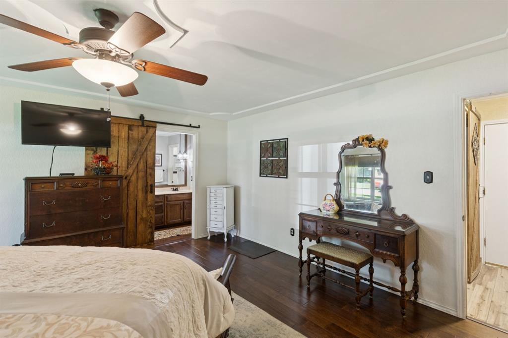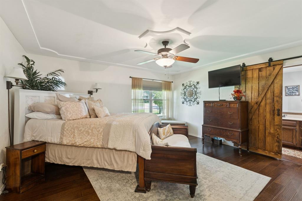 The oversized primary suite serves as a true retreat, featuring a sliding barn door that leads to a spa-like ensuite bathroom complete with a garden tub, separate shower, and an expansive walk-in closet. The split-bedroom floorplan provides privacy, with two additional bedrooms located on the opposite side of the home—each offering their own walk-in closets.