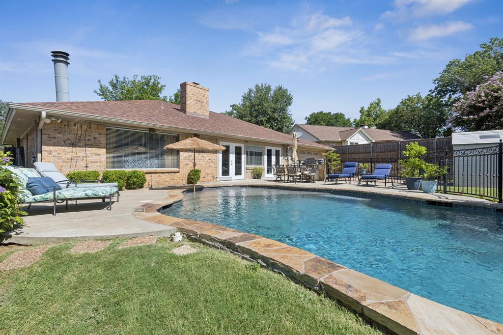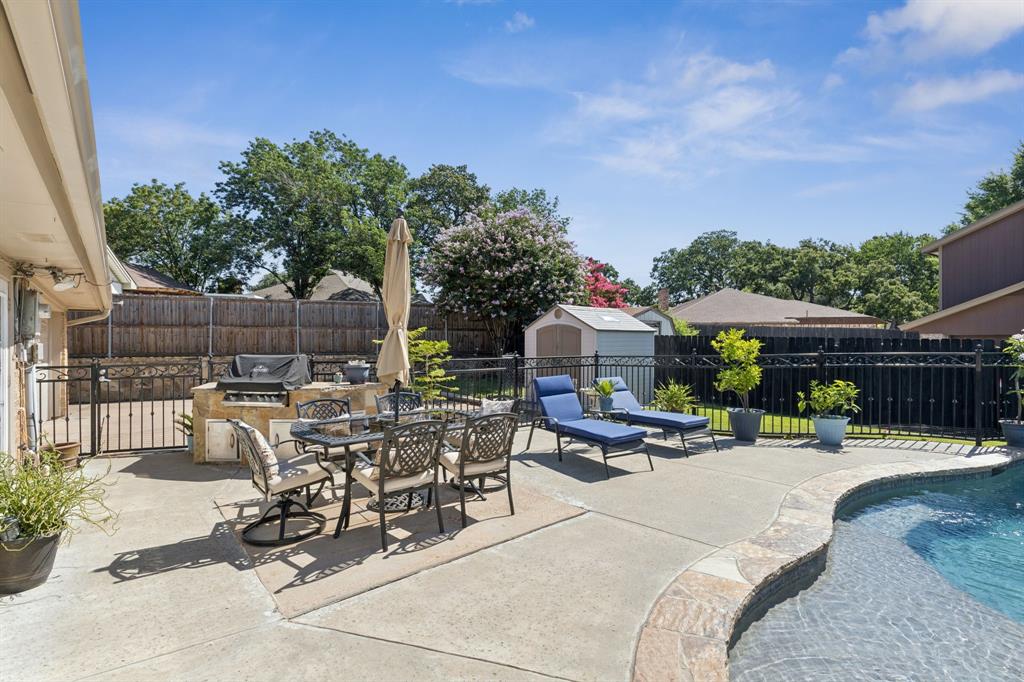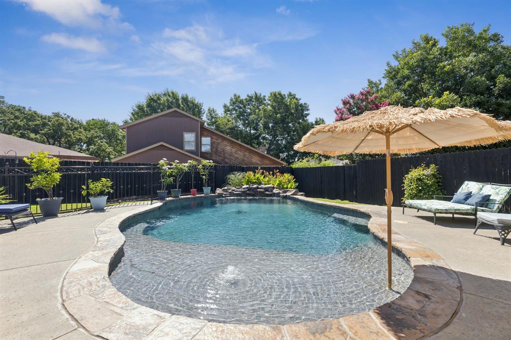 The backyard is an entertainer’s dream, showcasing a large pool perfect for swimming laps or playing games, a tranquil waterfall feature, a tanning ledge for lounging in the sun, and a built-in outdoor kitchen with a propane grill—all surrounded by plush, green landscaping.