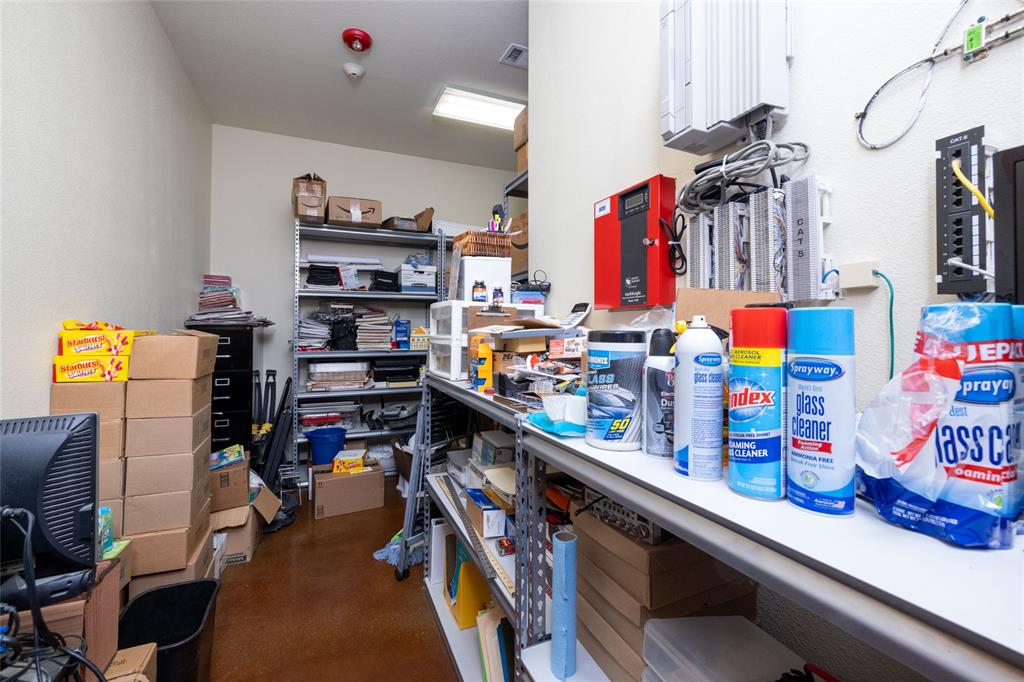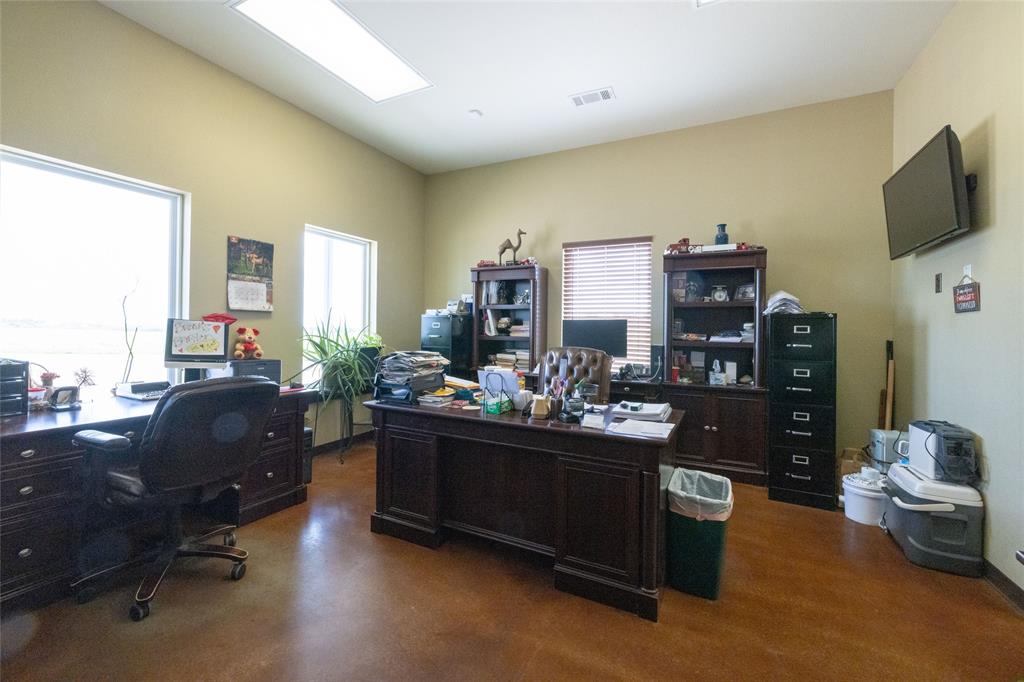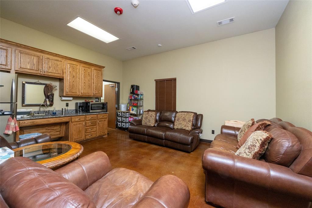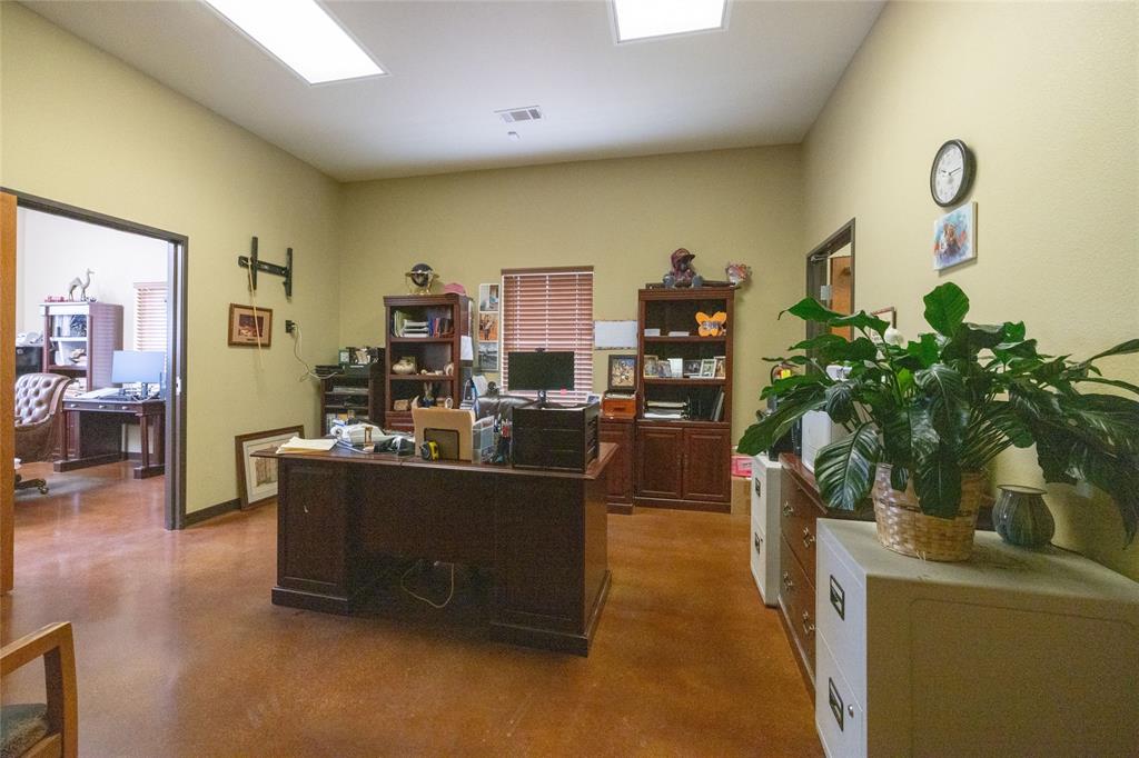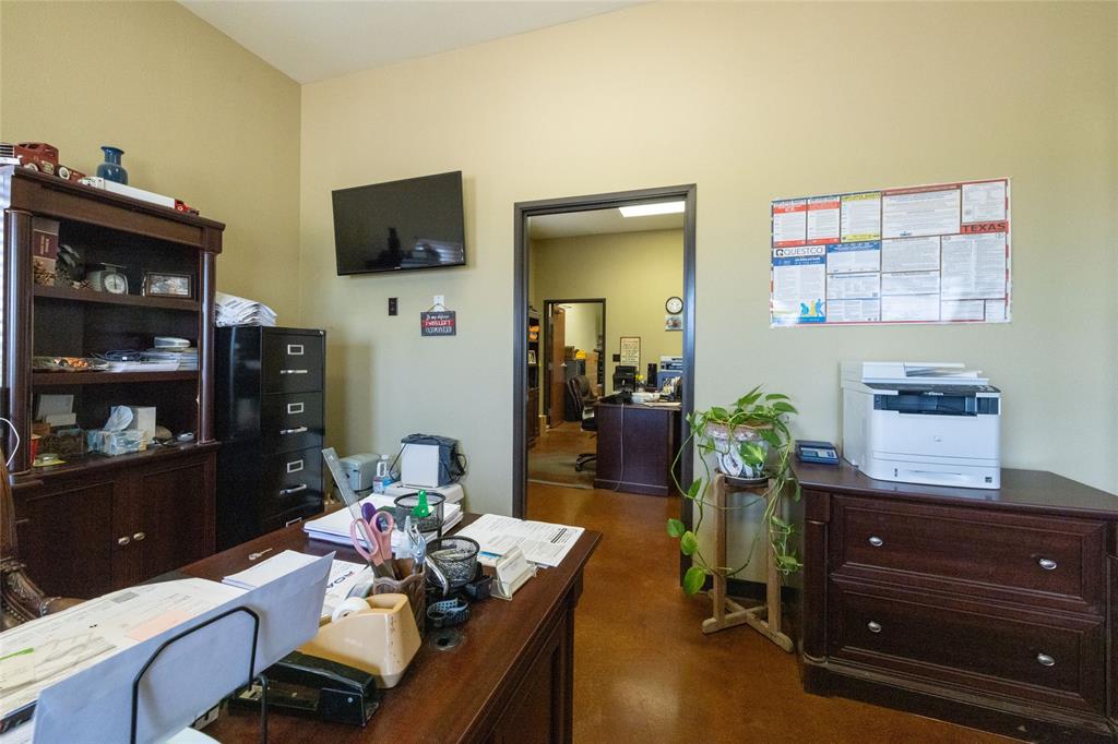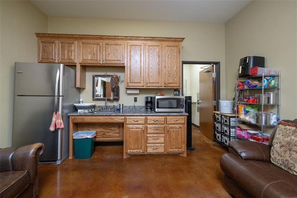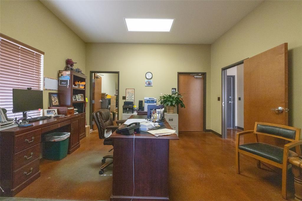 Office Space: Approximately 1,335 square feet of climate-controlled office space, configured with three private offices, one full bathroom, one half-bath, a utility storage area, and a spacious conference or commons area with a kitchenette.