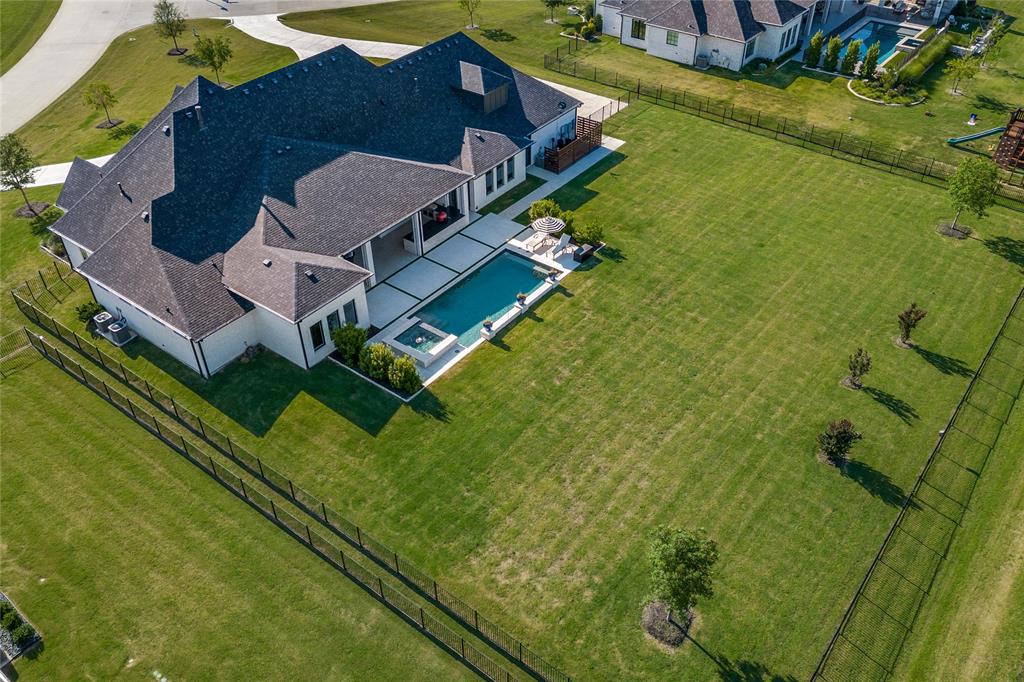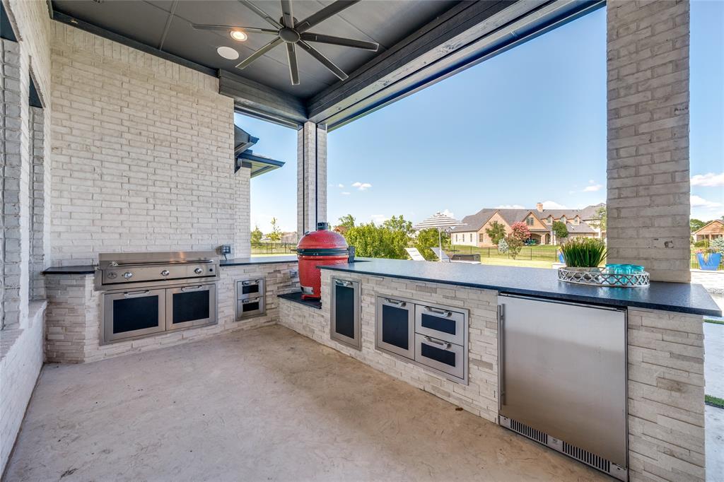 Additional highlights include a safe room-tornado shelter, dual utility rooms, server closet, motion lighting, 4-car garage with polyaspartic floors, and a full Texas attic with interior stair access. The backyard oasis features lush landscaping, Big Joe grill, griddle, bev fridge, security, automated shades, and dual fireplaces—ideal for year-round enjoyment.