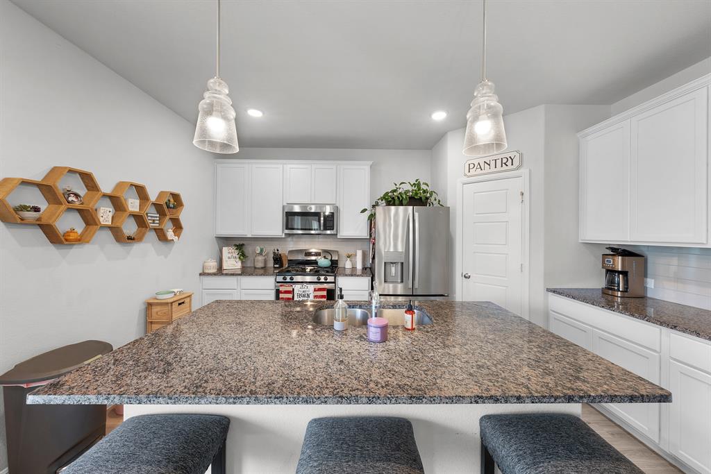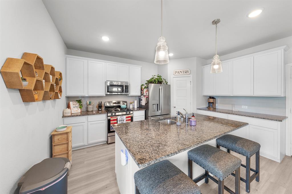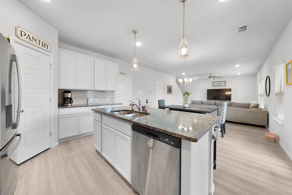 Downstairs, the open-concept living, dining, and kitchen layout is perfect for entertaining. The kitchen shines with granite counters, stainless appliances, large island seating, white cabinetry, and a walk-in pantry. A versatile front office is located next to the powder room—ideal for guests, remote work, or easily converted into a 4th bedroom.
