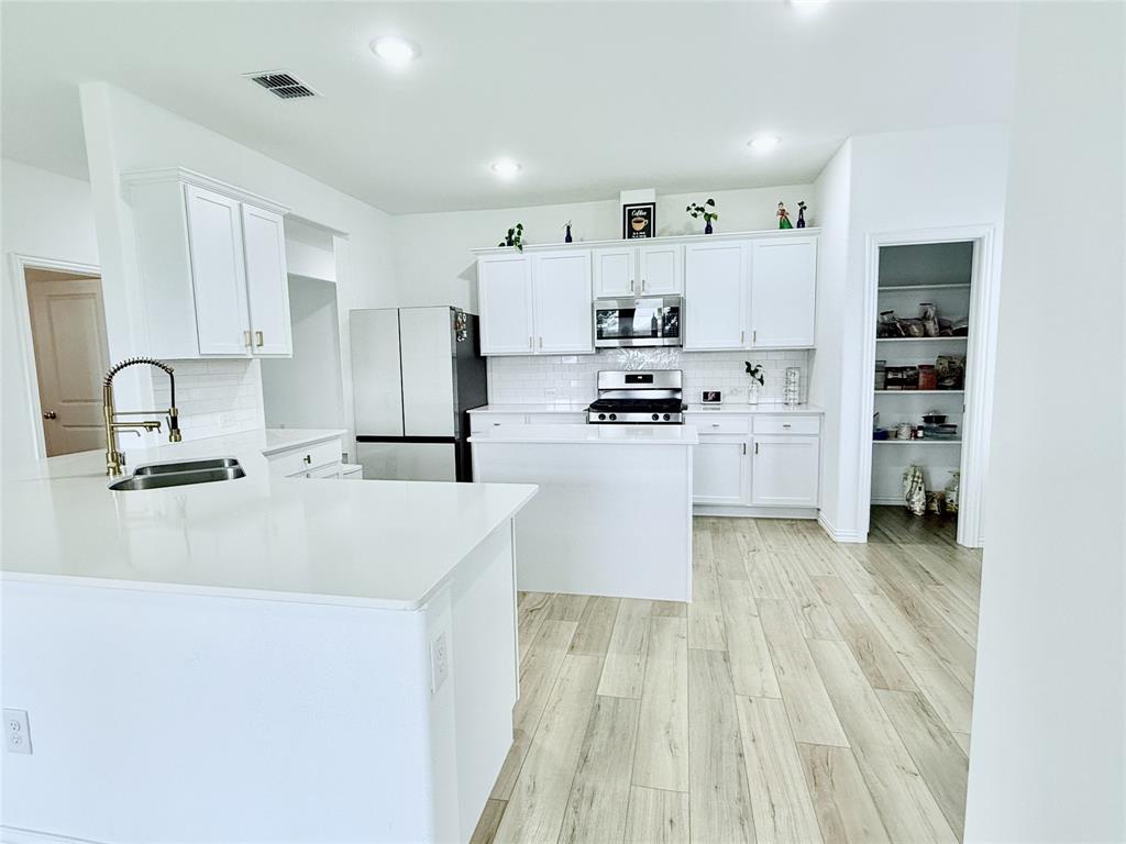 The inviting foyer leads into a spacious family room, seamlessly connected to the kitchen and breakfast nook, all opening up to the covered patio. The kitchen features stainless steel appliances, a large island, and ample counter space—ideal for gatherings with family and friends.