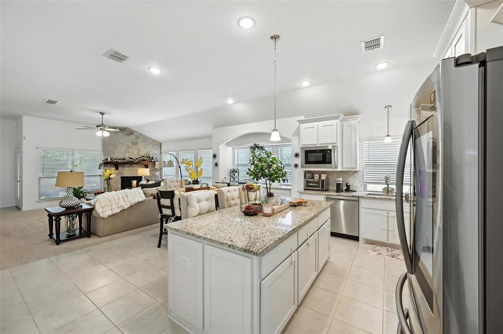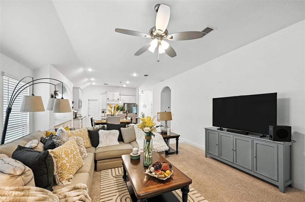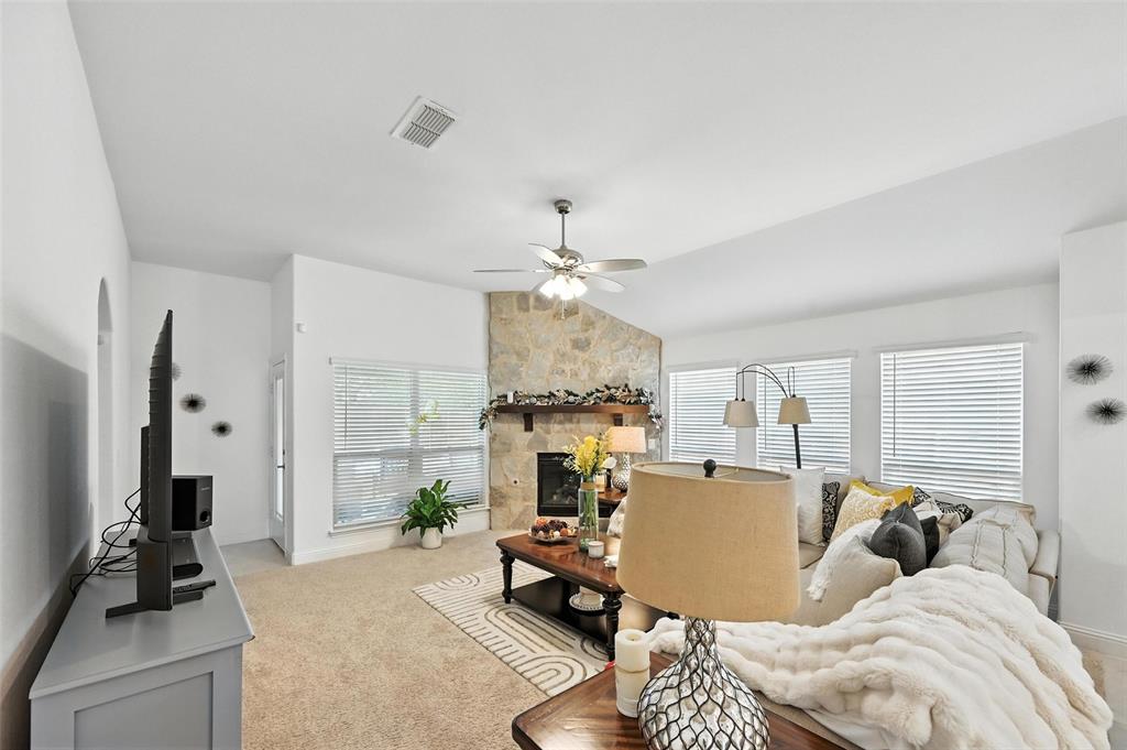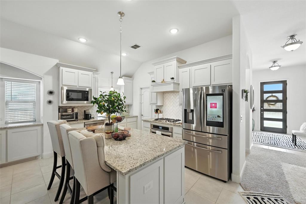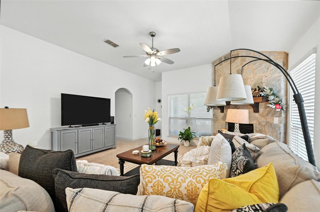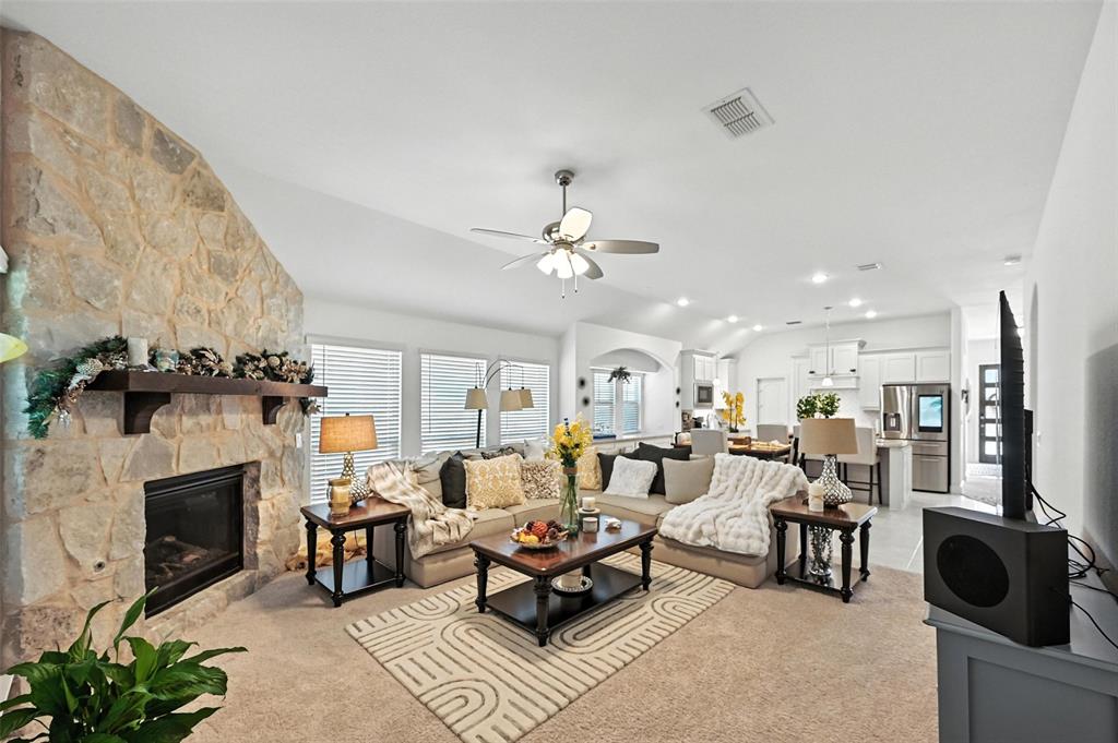 This spacious and beautifully designed home offers room for everyone with 4 bedrooms, 3.5 bathrooms, and a flexible layout perfect for modern living. The inviting exterior boasts stunning curb appeal, while inside, an open-concept floorplan creates a seamless flow between living spaces. The main living room features a striking stone fireplace, and the kitchen is equipped with a gas cooktop, island breakfast bar, stainless steel appliances, built-in microwave, and a custom built-in hutch in the dining area. An office is conveniently located near the front of the home. The primary suite is located downstairs and includes high ceilings, space for a sitting area, a large walk-in closet, and an ensuite bath with dual sinks, a soaking tub, and a separate shower. Two additional bedrooms downstairs offer flexibility for family or guests. Upstairs, you'll find a private bedroom, full bathroom, and a spacious family room—ideal for a guest suite or multigenerational living. Step outside to a large covered patio perfect for summer BBQs and a generous backyard with plenty of space for kids and pets to play. This home combines comfort, function, and charm—don’t miss your opportunity to make it yours!