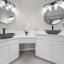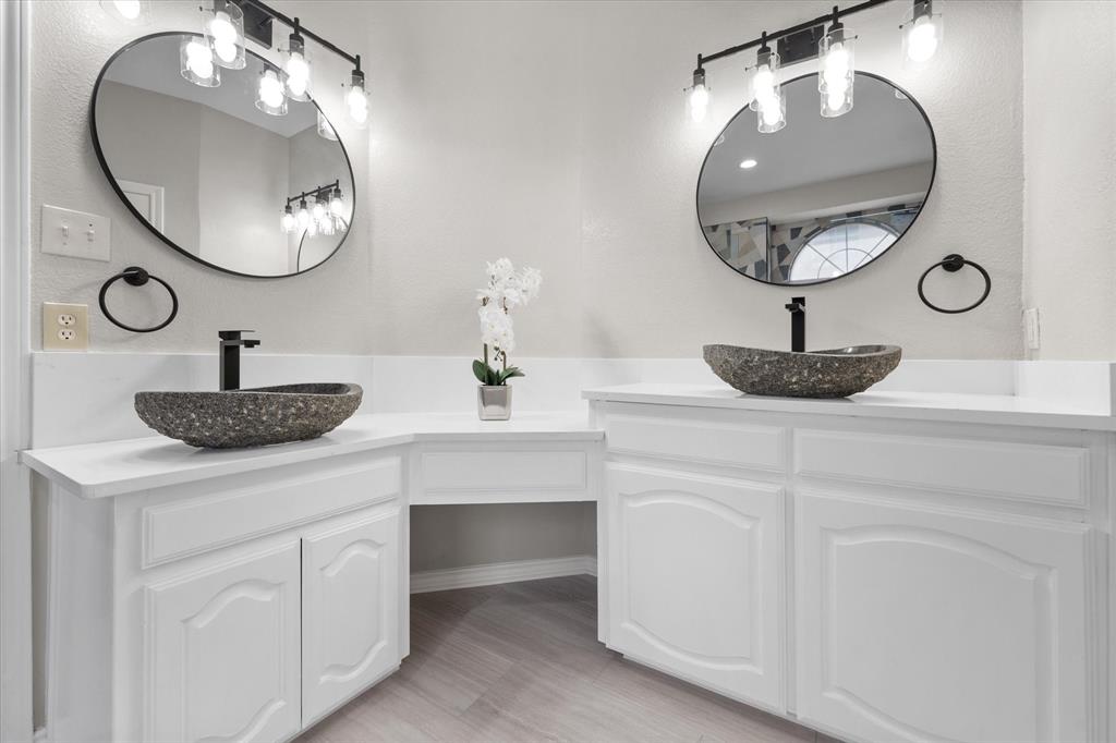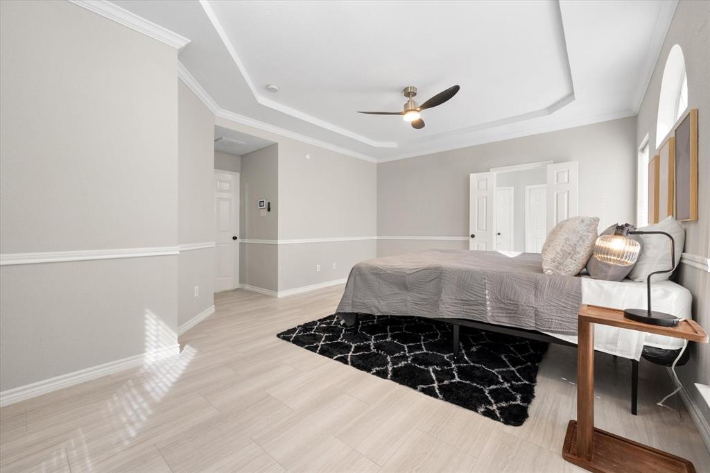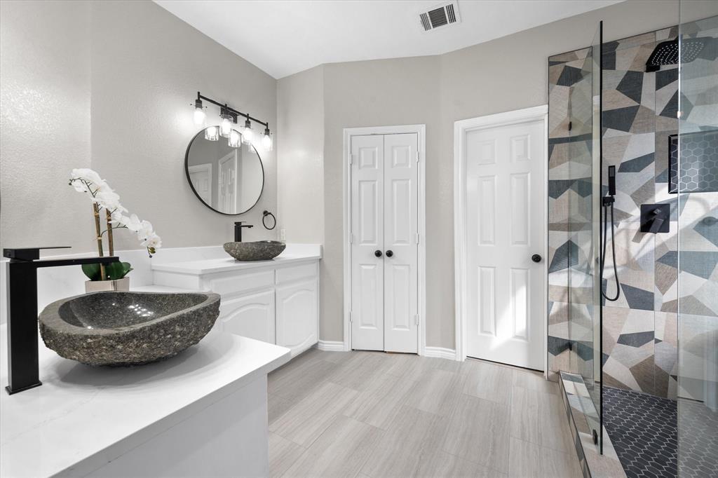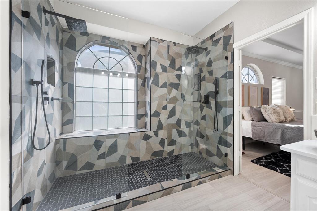 The primary suite is a true retreat, with room for a sitting area and a modernized bathroom featuring an oversized double shower, updated countertops, sinks, and fixtures.