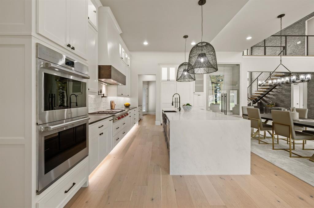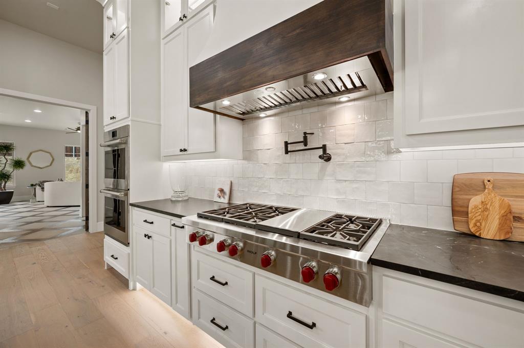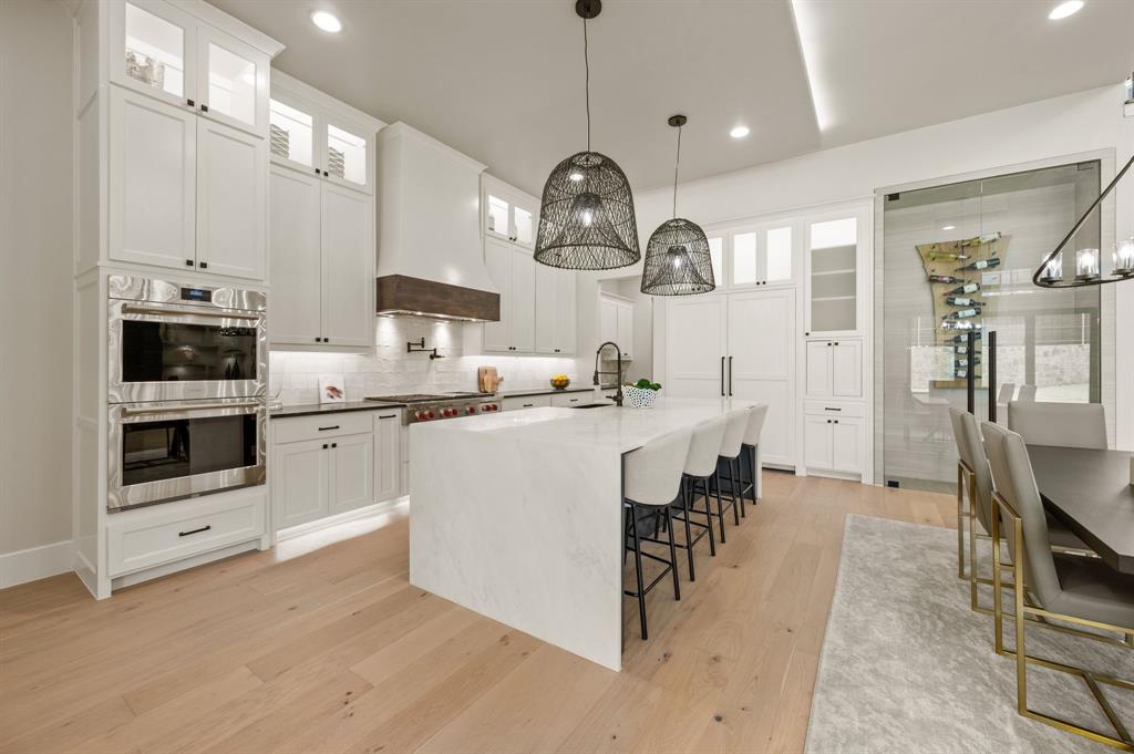 Designed for entertaining and everyday luxury, the chef’s kitchen showcases Wolf and Sub-Zero appliances, a striking waterfall quartzite island, and a fully equipped butler’s pantry—perfect for hosting with ease.