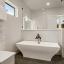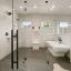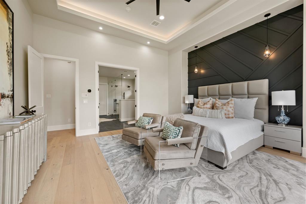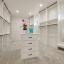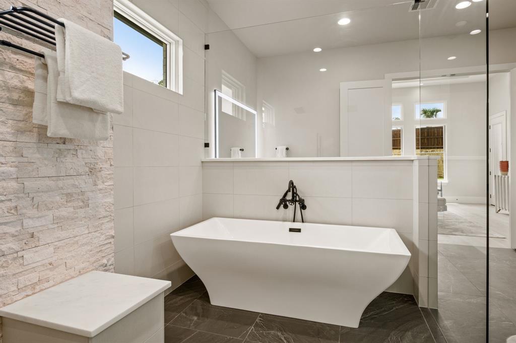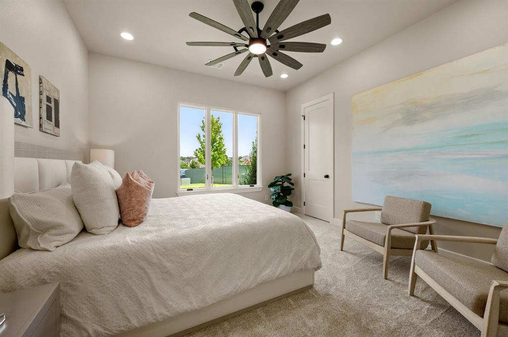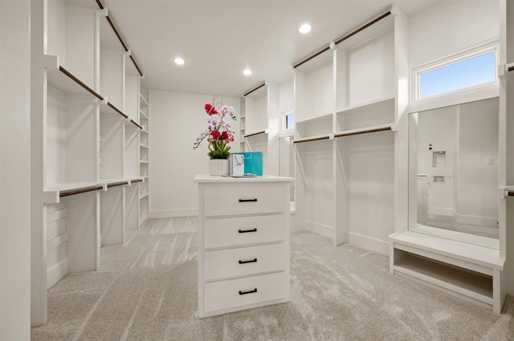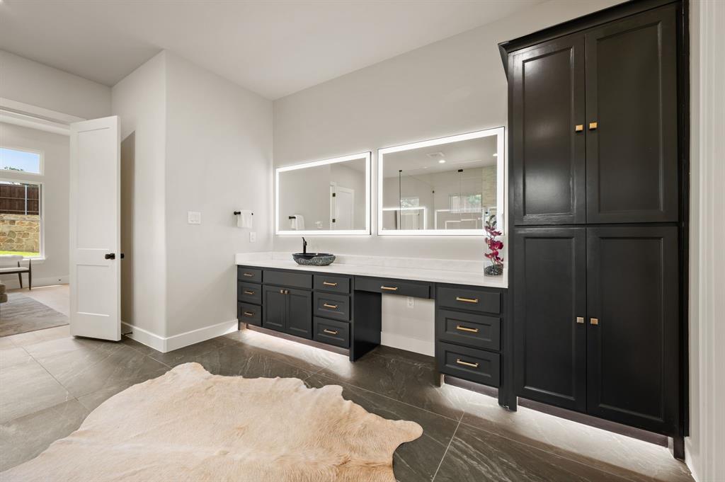 The spa-inspired primary bath offers a serene retreat, complete with a zero-entry wet room that seamlessly flows between the oversized shower and soaking tub. Dual handhelds and dry towel storage add convenience to this beautifully appointed space.