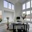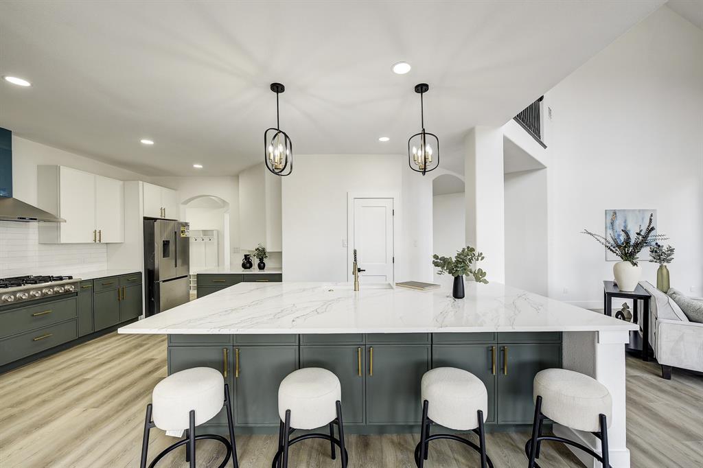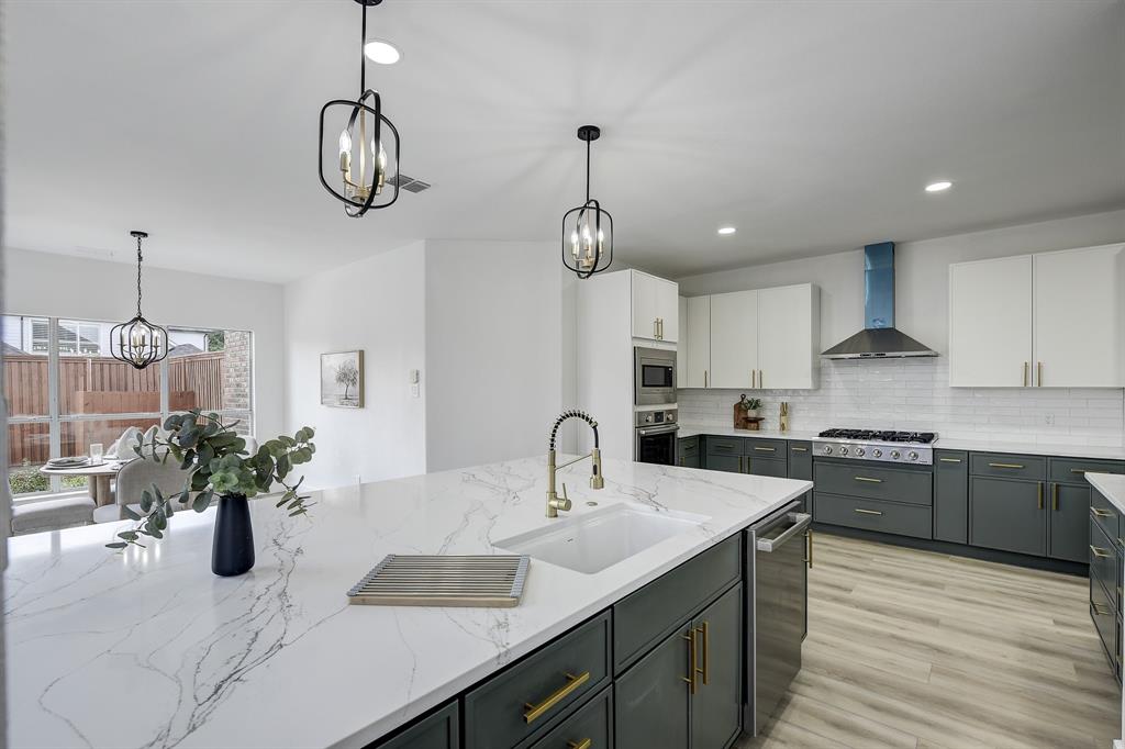 The heart of the home is the open-concept kitchen and living room, where towering windows flood the space with natural light and showcase a gorgeous view of the backyard. A striking fireplace serves as the focal point, perfect for cozy gatherings. The chef’s kitchen is designed to impress, featuring a massive marble island, designer lighting, six-burner cooktop, double ovens, premium appliances, a walk-in pantry, seamless access to the dining room, and an inviting eat-in breakfast nook for everyday dining.