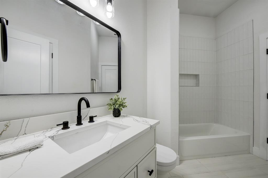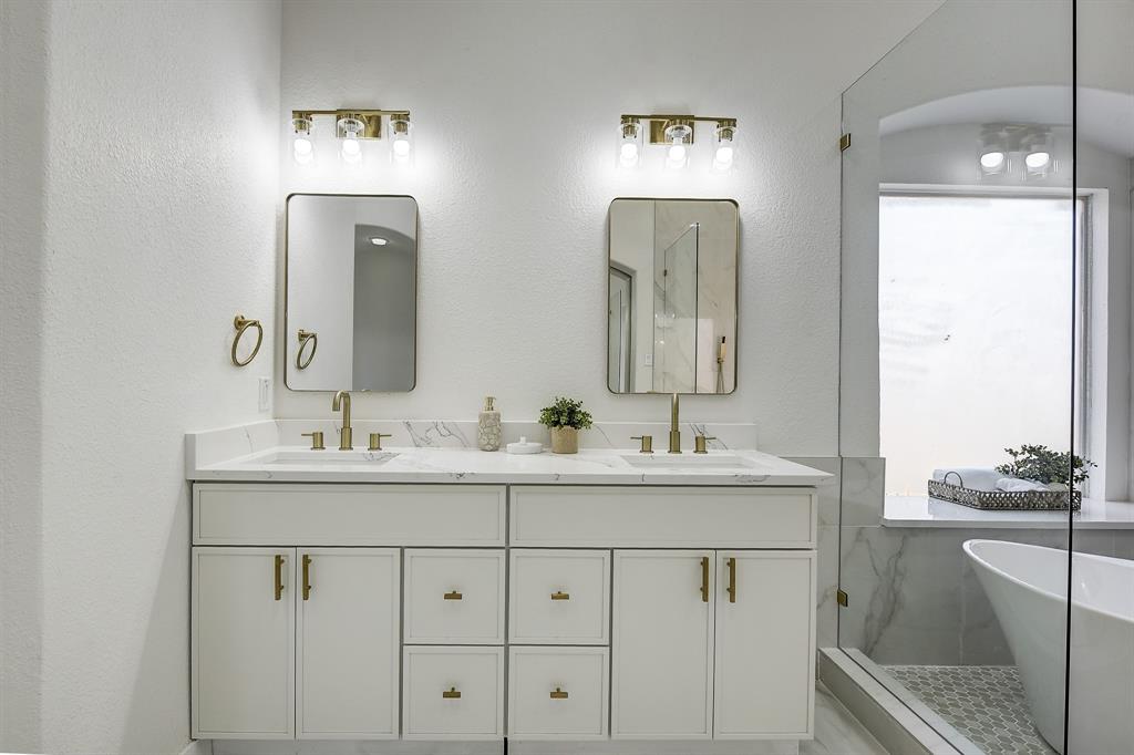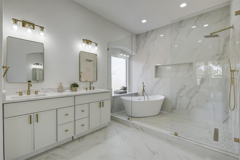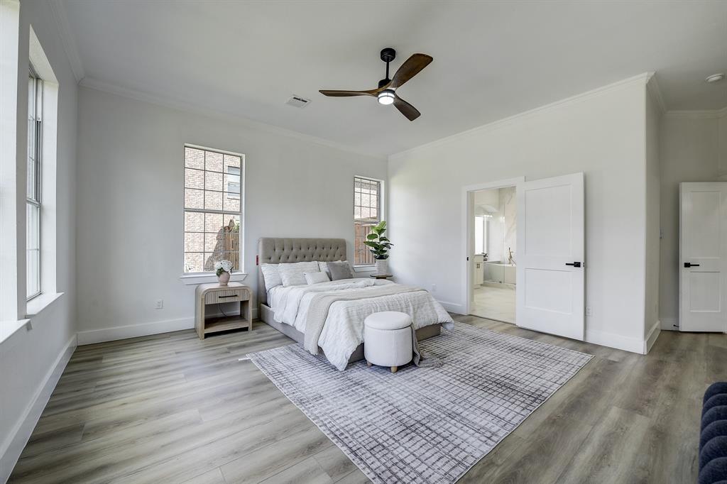 The luxurious primary suite is generously sized—offering room for a private seating area or office—while the spa-like bathroom retreat wows with a freestanding tub, walk-in shower, and dual walk-in closets.