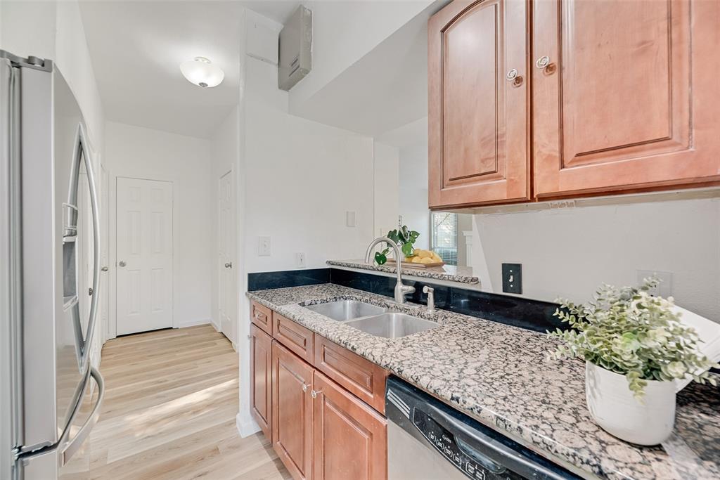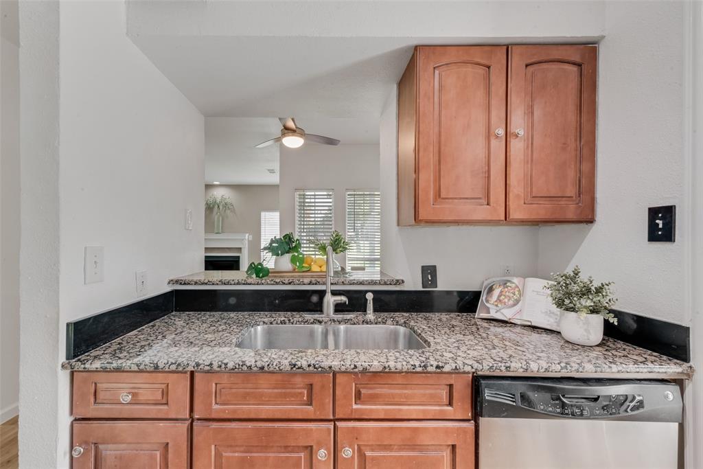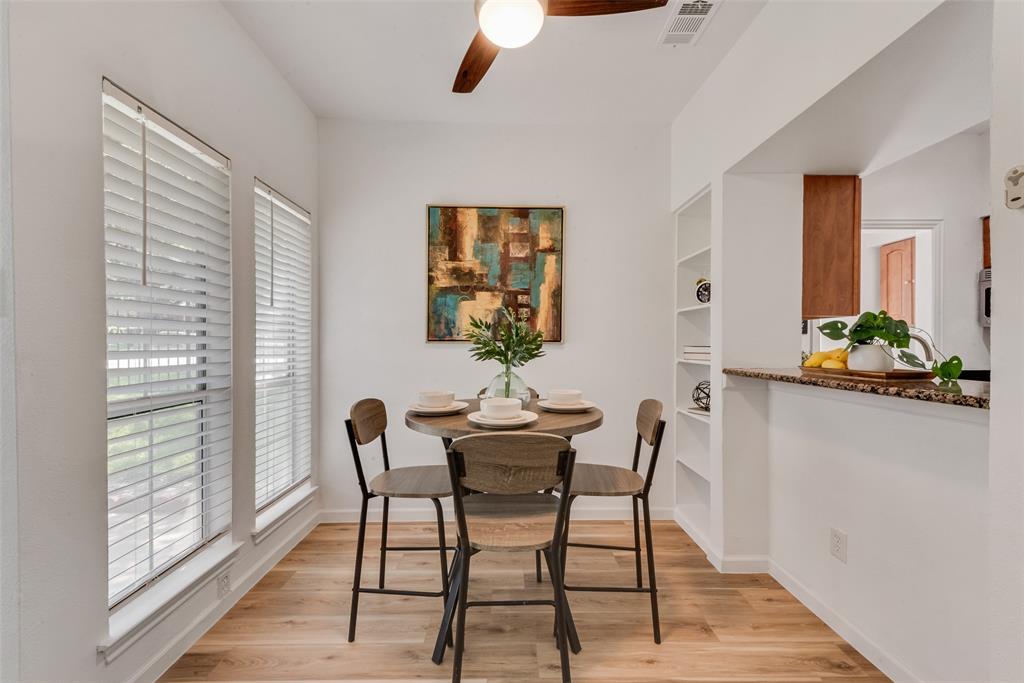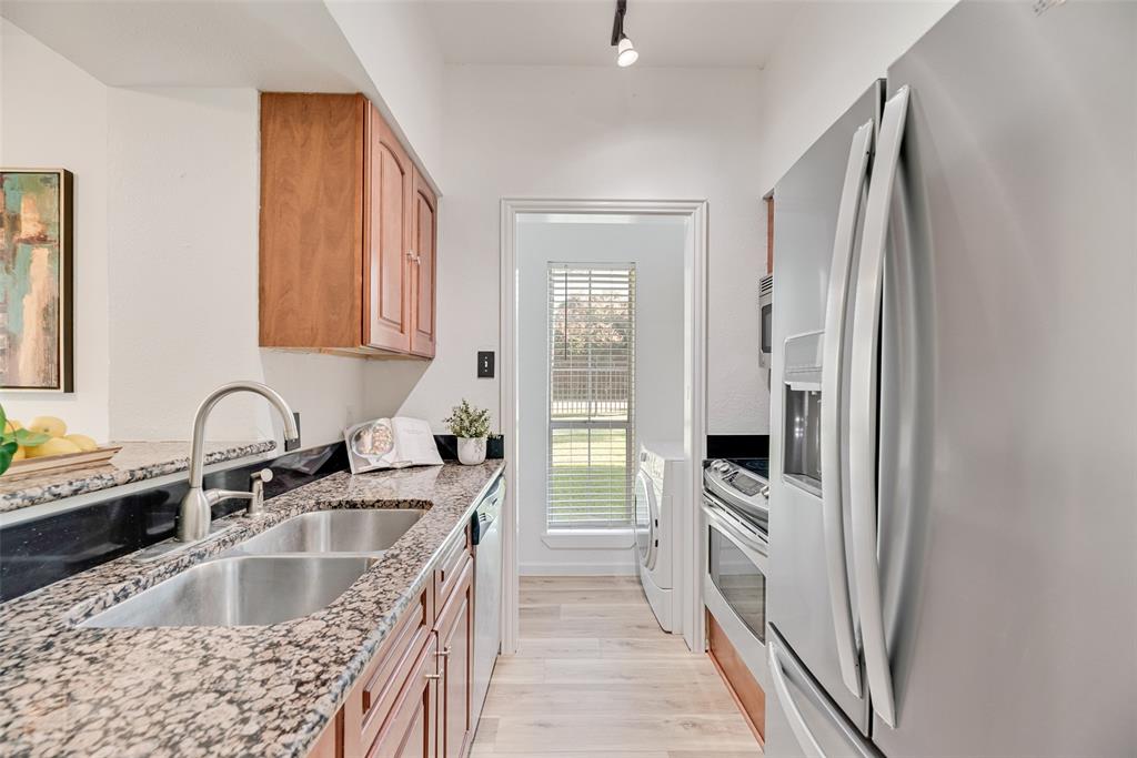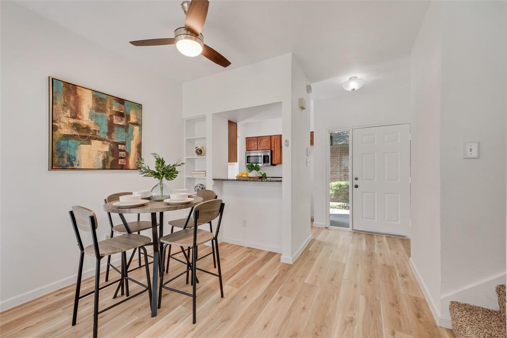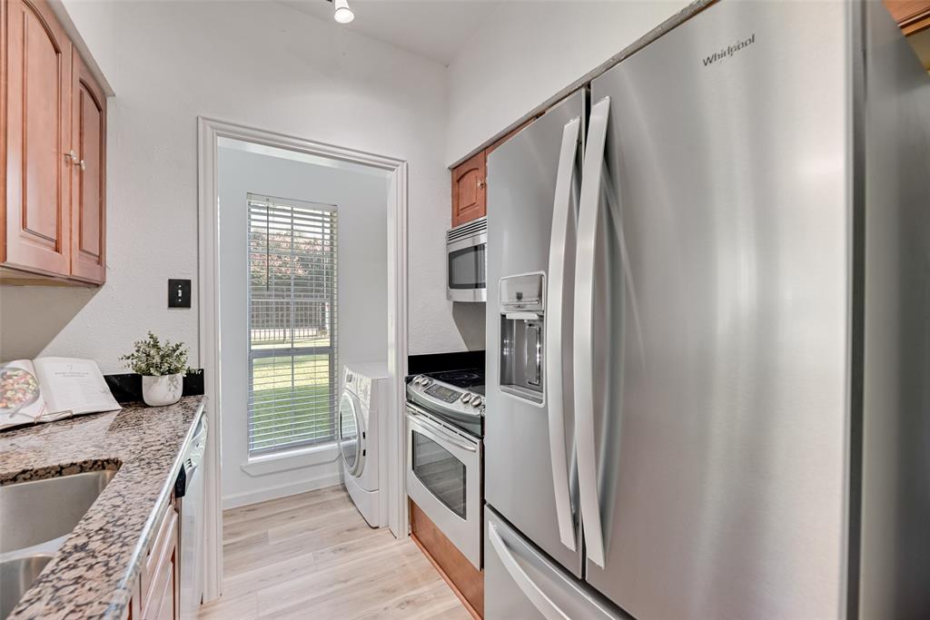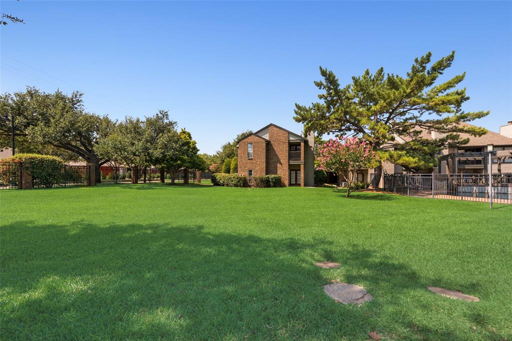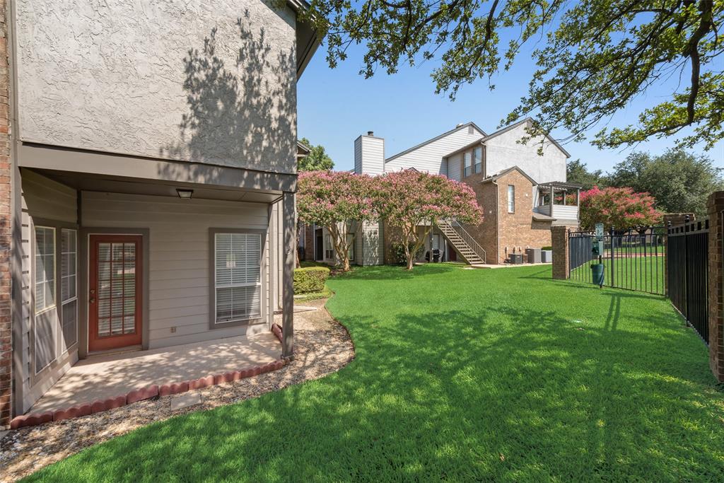SUPER CUTE and FULL OF UPDATES!! This beautifully updated condo in the heart of Addison features fresh paint, new carpet, and new light-colored luxury vinyl tile flooring... great for a touch of modern style and low maintenance. The open-concept living and dining areas offer recessed lighting, built-in bookshelves, a ceiling fan with remote and a cozy wood-burning fireplace with wood mantle. The kitchen shines with granite countertops, new black quartz backsplash, breakfast bar, stainless steel sink, built-in stainless microwave, and a BRAND NEW Whirlpool refrigerator with ice maker. A large kitchen pantry, extra storage closet, and laundry room with washer and dryer (included) add storage and functionality. Upstairs, two oversized bedrooms, each with walk-in closets. The primary suite has a vaulted ceiling with beautiful wood beam, ceiling fan, linen closet, and en-suite bath, while the second bedroom makes a perfect office or guest retreat. Relax on the covered patio overlooking the lush green lawn, ideal for your furry friends. The oversized one-car garage is just a few steps from the front door. There's plenty of storage space inside and a garage door opener for your convenience. The community pool is also just a few steps away. The complex itself is beautifully maintained with gorgeous mature trees and landscaping. Monthly HOA dues include your water, trash and sewer. For fitness enthusiasts, join the Addison Athletic Club where membership is available for $10 per mo. Convenient location close to all the restaurants and shopping in Addison and quick access to the DNT. This home also has an excellent rental appeal for investors who are looking for strong demand and low-maintenance ownership in a very desirable area. With all the modern updates, a one-car garage, a beautiful back yard and a fantastic location, this home is truly a MUST-SEE!