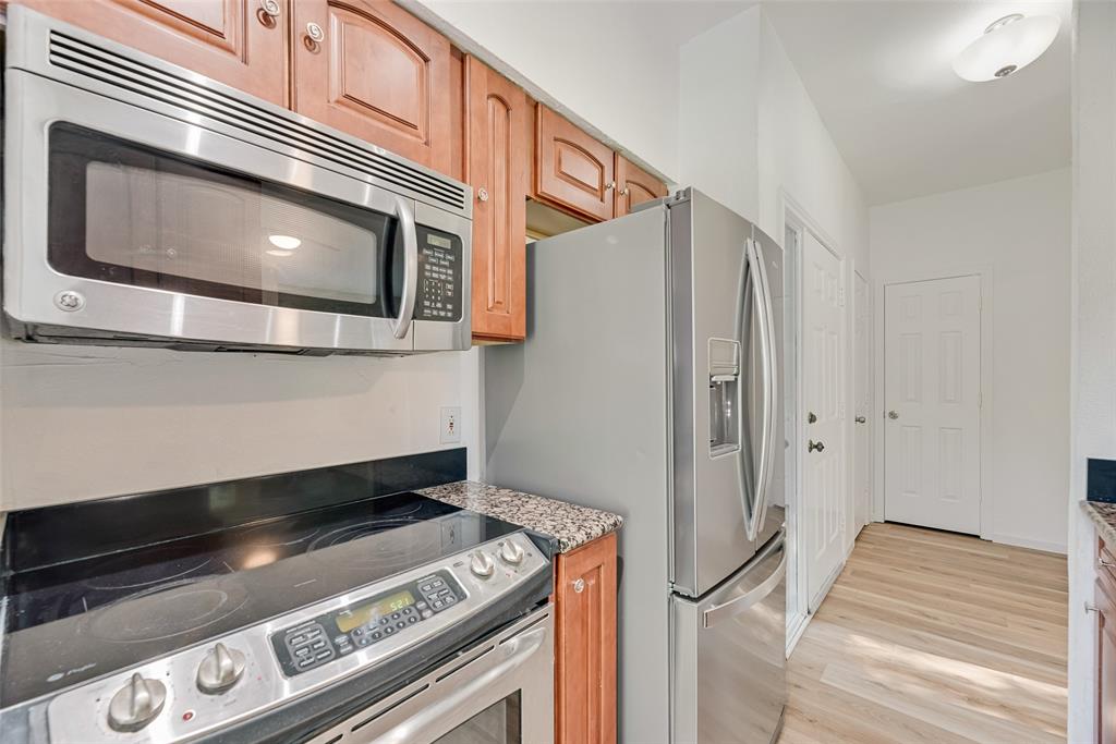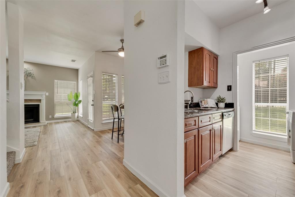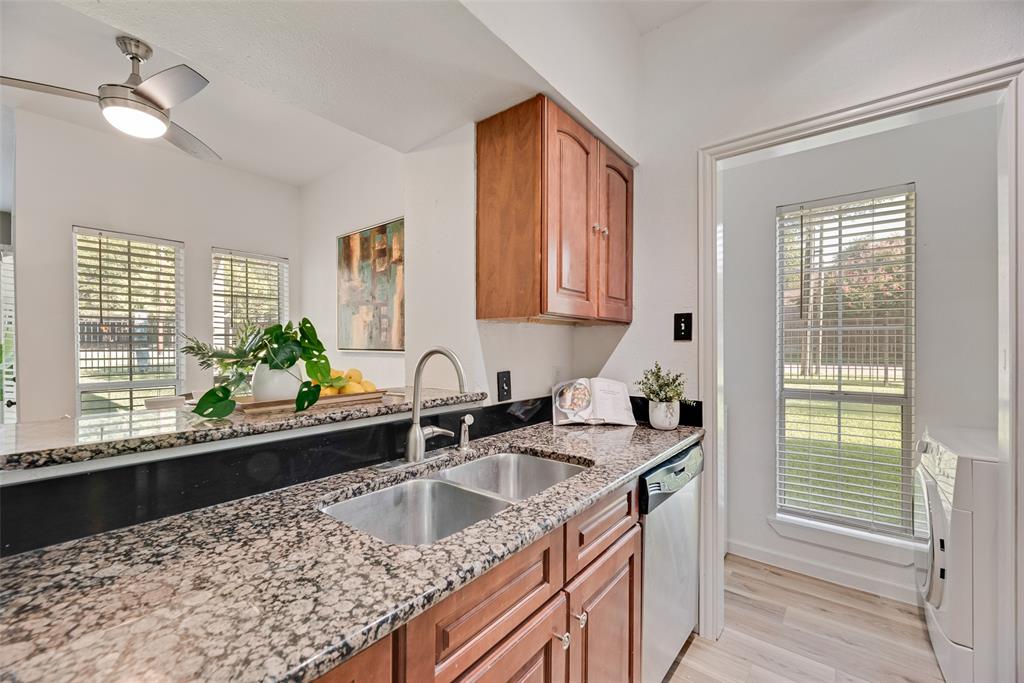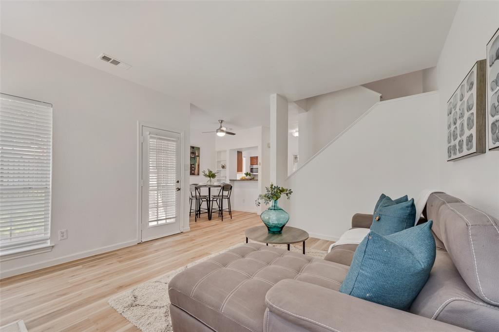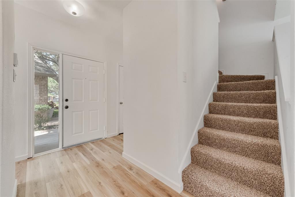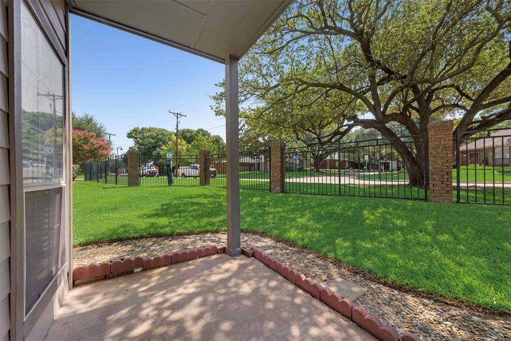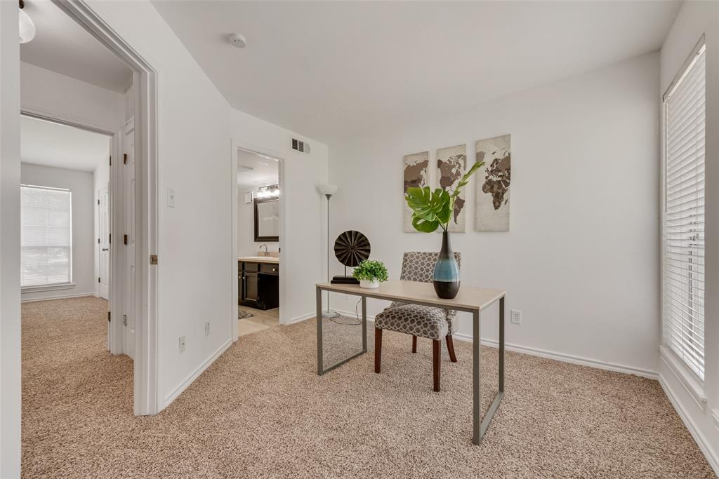 SUPER CUTE and FULL OF UPDATES!! This beautifully updated condo in the heart of Addison features fresh paint, new carpet, and new light-colored luxury vinyl tile flooring... great for a touch of modern style and low maintenance. The open-concept living and dining areas offer recessed lighting, built-in bookshelves, a ceiling fan with remote and a cozy wood-burning fireplace with wood mantle. The kitchen shines with granite countertops, new black quartz backsplash, breakfast bar, stainless steel sink, built-in stainless microwave, and a BRAND NEW Whirlpool refrigerator with ice maker. A large kitchen pantry, extra storage closet, and laundry room with washer and dryer (included) add storage and functionality. Upstairs, two oversized bedrooms, each with walk-in closets. The primary suite has a vaulted ceiling with beautiful wood beam, ceiling fan, linen closet, and en-suite bath, while the second bedroom makes a perfect office or guest retreat. Relax on the covered patio overlooking the lush green lawn, ideal for your furry friends. The oversized one-car garage is just a few steps from the front door. There's plenty of storage space inside and a garage door opener for your convenience. The community pool is also just a few steps away. The complex itself is beautifully maintained with gorgeous mature trees and landscaping. Monthly HOA dues include your water, trash and sewer. For fitness enthusiasts, join the Addison Athletic Club where membership is available for $10 per mo. Convenient location close to all the restaurants and shopping in Addison and quick access to the DNT. This home also has an excellent rental appeal for investors who are looking for strong demand and low-maintenance ownership in a very desirable area. With all the modern updates, a one-car garage, a beautiful back yard and a fantastic location, this home is truly a MUST-SEE!