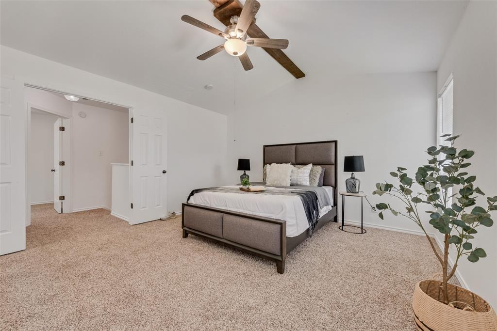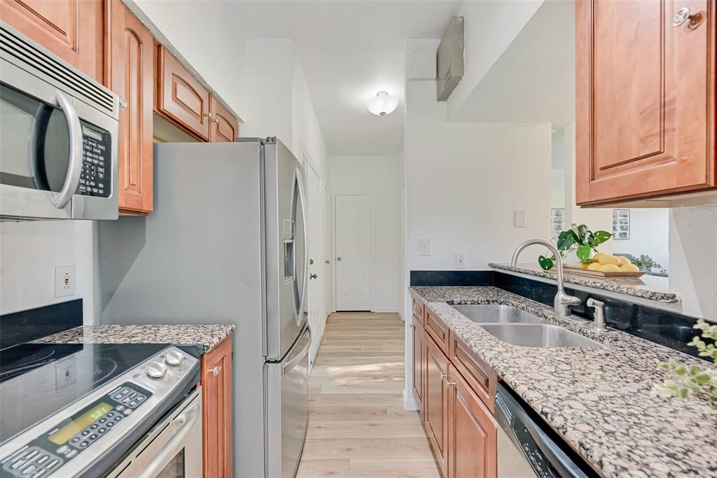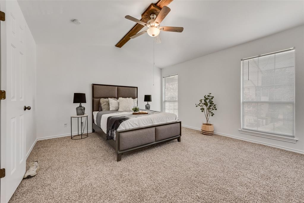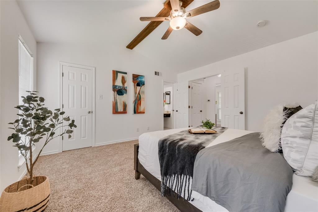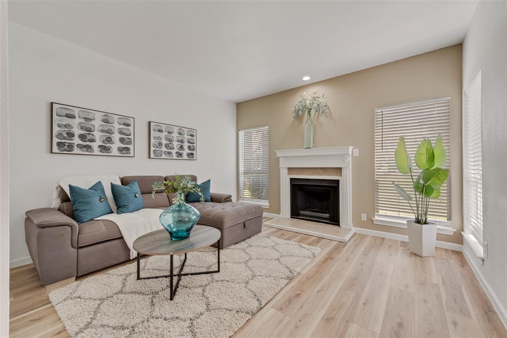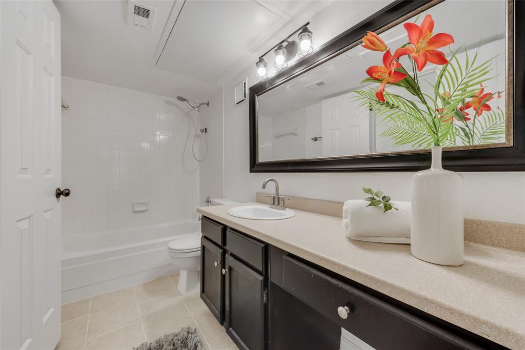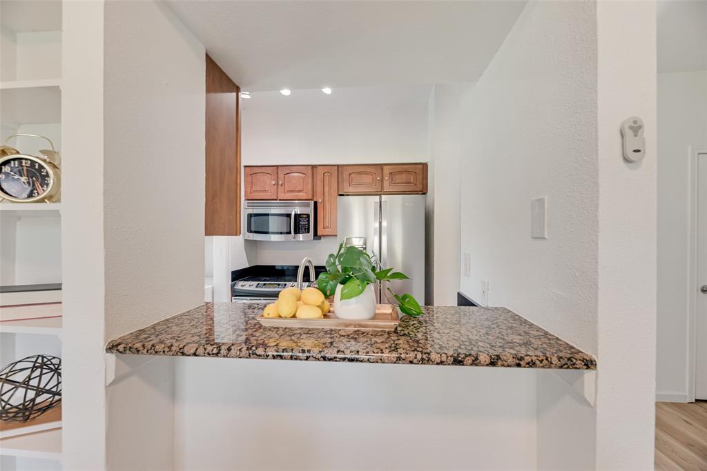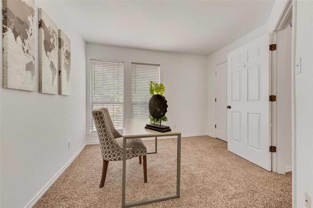 SUPER CUTE and FULL OF UPDATES!! This beautifully updated condo in the heart of Addison features fresh paint, new carpet, and new light-colored luxury vinyl tile flooring... great for a touch of modern style and low maintenance. The open-concept living and dining areas offer recessed lighting, built-in bookshelves, a ceiling fan with remote and a cozy wood-burning fireplace with wood mantle. The kitchen shines with granite countertops, new black quartz backsplash, breakfast bar, stainless steel sink, built-in stainless microwave, and a BRAND NEW Whirlpool refrigerator with ice maker. A large kitchen pantry, extra storage closet, and laundry room with washer and dryer (included) add storage and functionality. Upstairs, two oversized bedrooms, each with walk-in closets. The primary suite has a vaulted ceiling with beautiful wood beam, ceiling fan, linen closet, and en-suite bath, while the second bedroom makes a perfect office or guest retreat. Relax on the covered patio overlooking the lush green lawn, ideal for your furry friends. The oversized one-car garage is just a few steps from the front door. There's plenty of storage space inside and a garage door opener for your convenience. The community pool is also just a few steps away. The complex itself is beautifully maintained with gorgeous mature trees and landscaping. Monthly HOA dues include your water, trash and sewer. For fitness enthusiasts, join the Addison Athletic Club where membership is available for $10 per mo. Convenient location close to all the restaurants and shopping in Addison and quick access to the DNT. This home also has an excellent rental appeal for investors who are looking for strong demand and low-maintenance ownership in a very desirable area. With all the modern updates, a one-car garage, a beautiful back yard and a fantastic location, this home is truly a MUST-SEE!