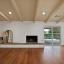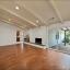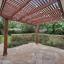A large family room with vaulted ceilings and French doors leads out to a pergola-covered flagstone patio, providing a perfect setting for outdoor dining and entertaining. The lush, landscaped backyard is fully fenced and shaded by mature trees for added privacy and serenity.