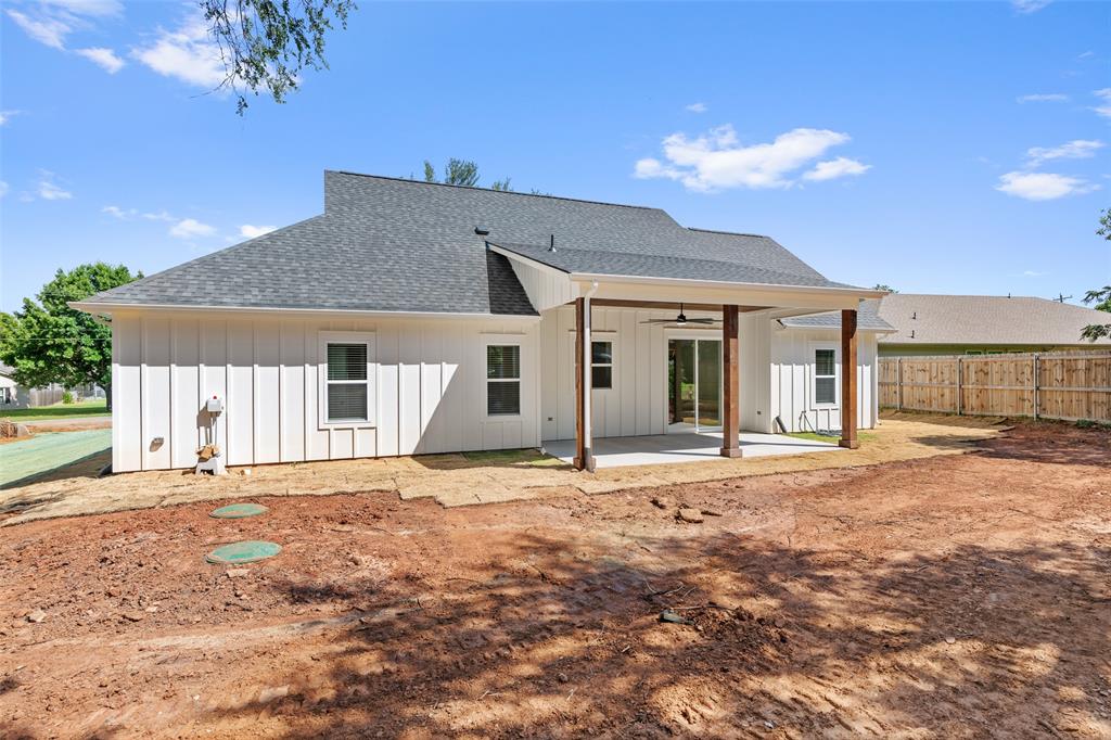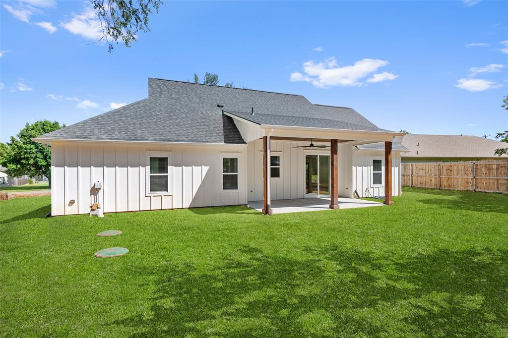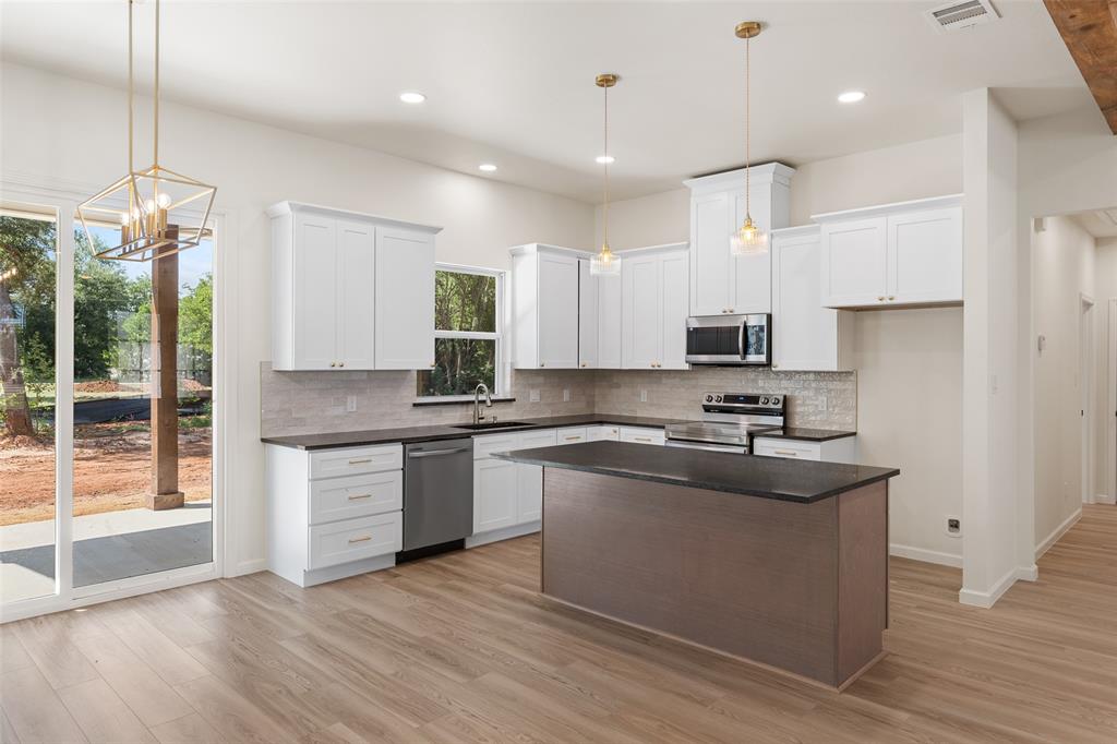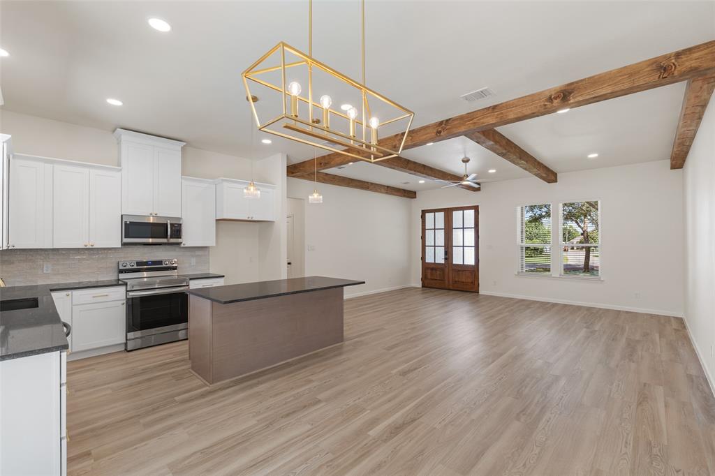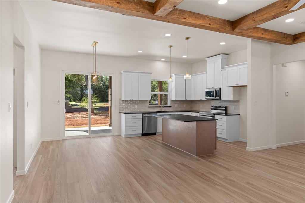 Step into modern elegance with this brand-new construction home, offering a perfect blend of style, comfort, and functionality. Featuring 3 spacious bedrooms, 2 beautifully appointed bathrooms, and a 2-car garage, this home is designed with thoughtful details throughout. The elegant double entry doors create a grand first impression, welcoming you into a home that feels both inviting and upscale. The heart of the home is the open-concept living area, where decorative ceiling beams add architectural charm and warmth. Golden light fixtures offer a modern touch, while sleek black countertops provide striking contrast in the kitchen. Whether you're entertaining or enjoying a quiet evening, the layout offers the ideal balance of openness and privacy. The primary suite is a true retreat, complete with an ensuite bathroom that includes separate vanities, a standalone soaking tub, and a luxurious walk-in shower. A barn door opens to a spacious walk-in closet, offering both charm and ample storage.