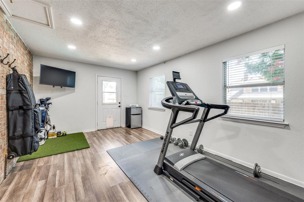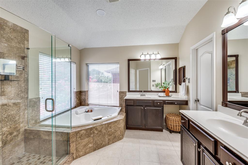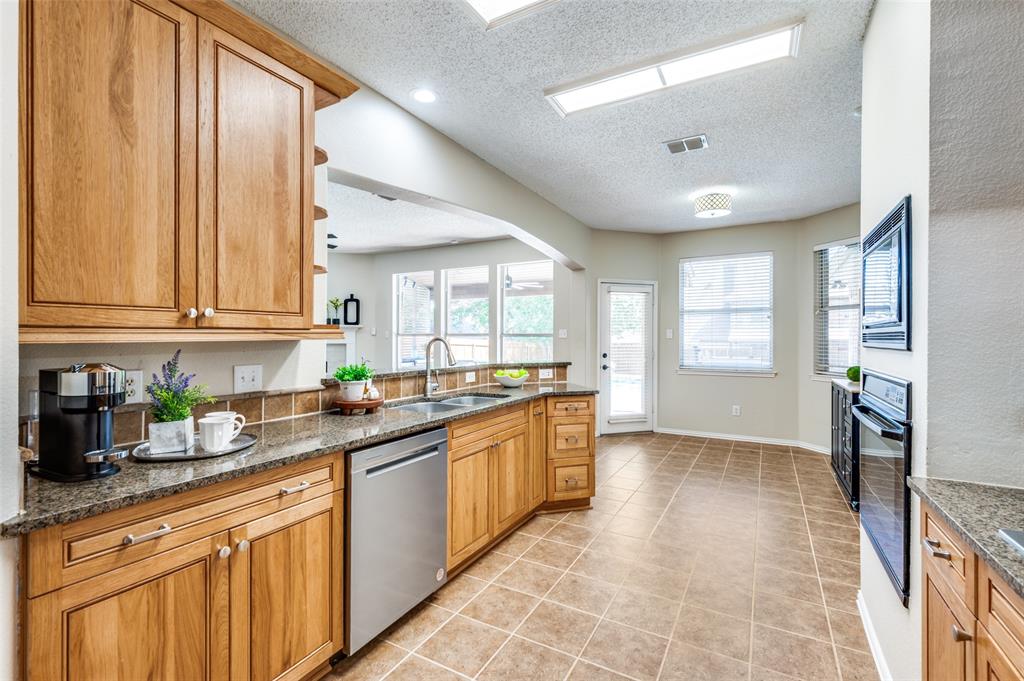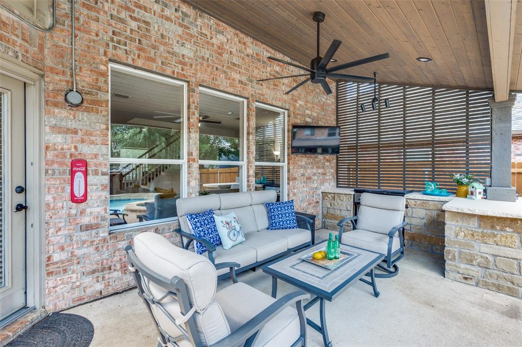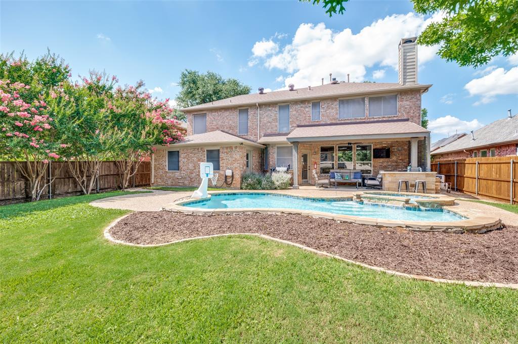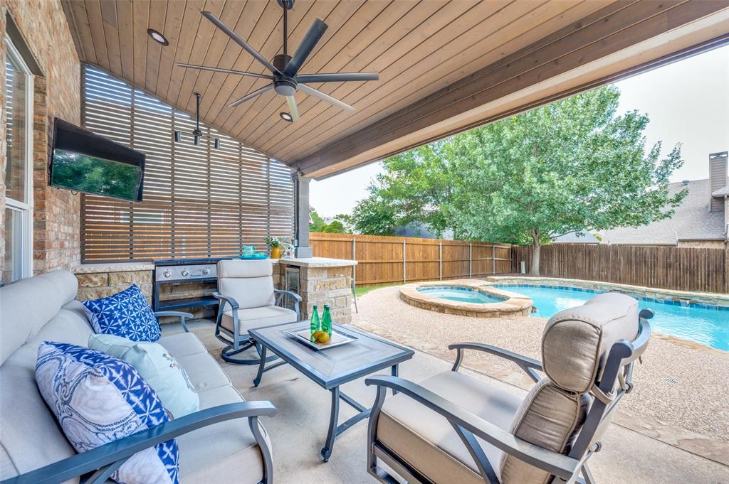 Welcome to 2701 Timberhill, where elegance and comfort embrace beneath the shade of mature trees and blooming Crepe Myrtles. Nestled in the highly sought after Towne of Flower Mound, known for its strong sense of community, extensive parkland, trail systems and yes Bluebonnets! As you drive up to the property, curb appeal greets you with a lush landscape and the undeniable charm of a home that’s been deeply loved and meticulously cared for, with nearly $72K in recent updates and upgrades. Pride of ownership shines through every detail. Step inside to find beautiful amenities, spacious rooms, fresh paint, new carpet, new energy-efficient windows, that invite a cascade of natural light into every corner and the list goes on. The charm of the home flows effortlessly outdoors, where a beautifully designed custom outdoor kitchen and living area invites you to relax and enjoy. With its elegant tongue-and-groove half-pitch roofline, built-in grill, custom countertops, soft recessed lighting, and convenient electrical and gas hookups, it’s the perfect place to unwind at the end of the day. Whether you're enjoying a quiet evening under the stars or gathering with friends by the sparkling pool and peaceful water features, this space offers comfort, style, and serenity.
