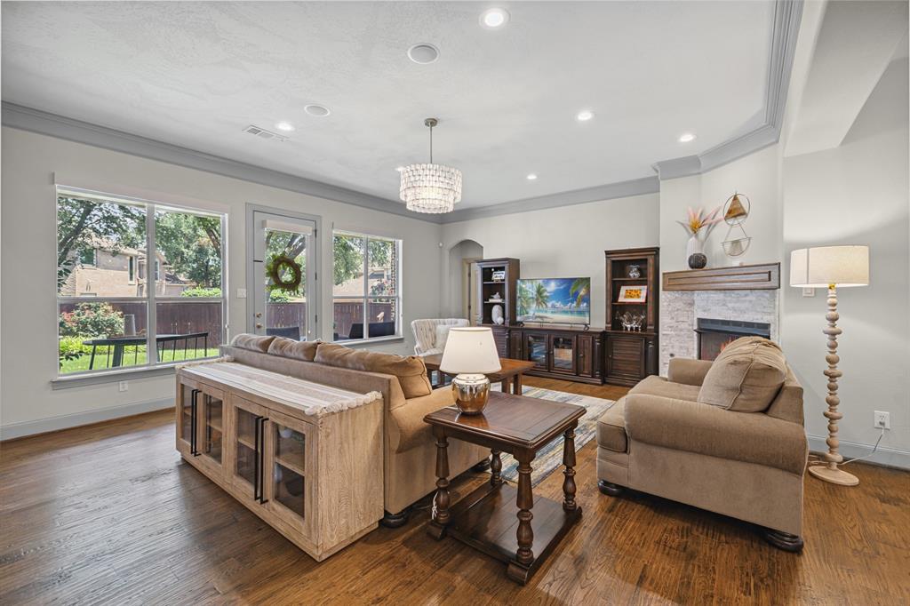 The open-concept layout includes two living areas and two dining spaces, ideal for both entertaining and daily living. A 2021 renovation transformed the kitchen, with custom cabinetry, quartz countertops, a large island, and premium appliances, including a Monogram gas range and KitchenAid suite. Rich wood floors flow through the main level, complementing the bespoke wet bar and reimagined fireplace. The guest and powder baths have been fully updated.