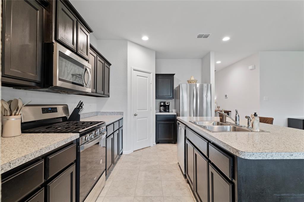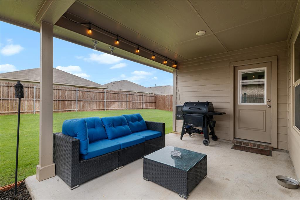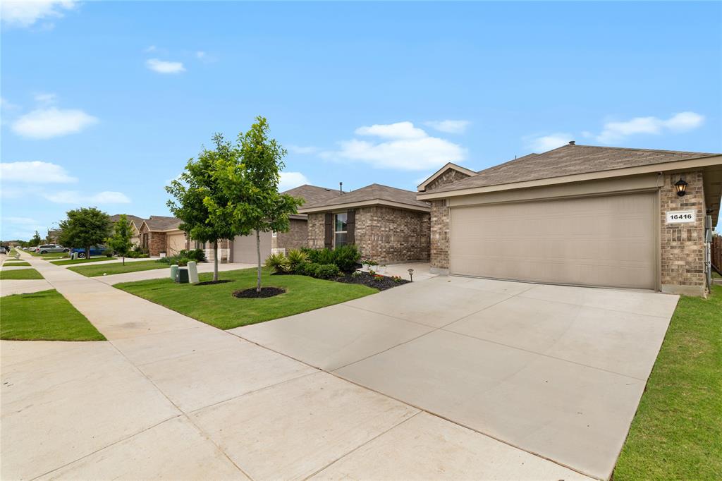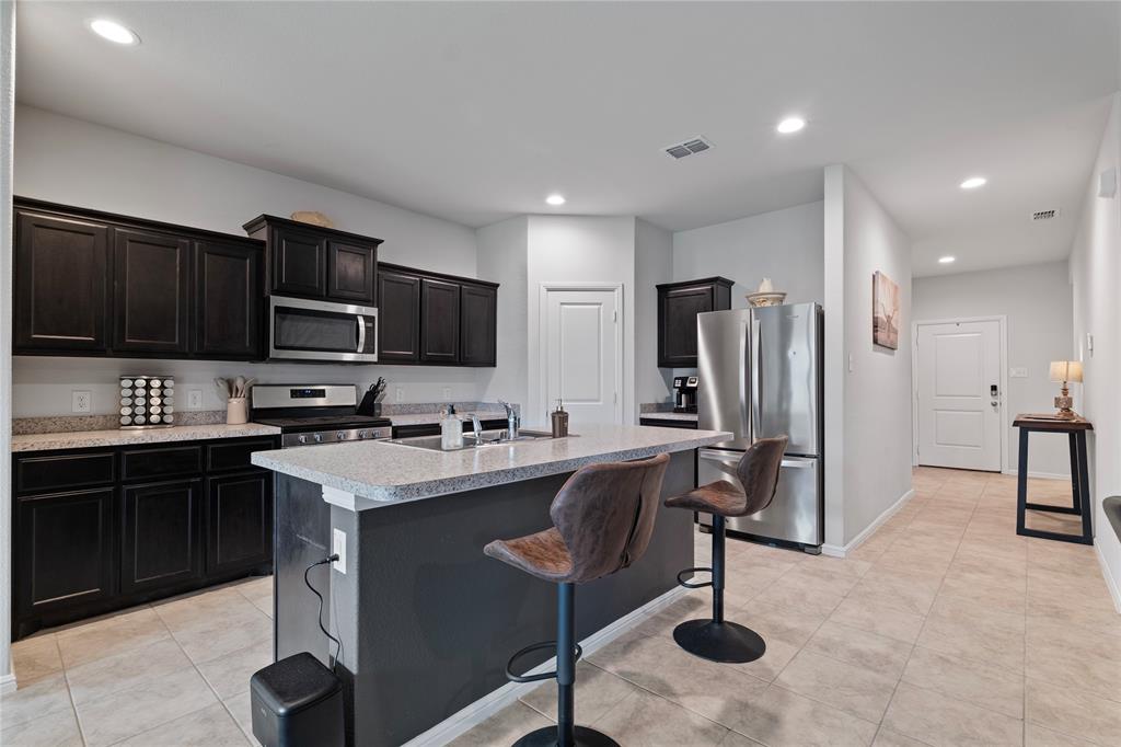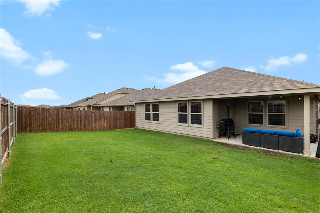 A well maintained home and recently built DR Horton single story home that offers 4 bedrooms, 2 bathrooms and an open floor plan. As you enter the foyer, you'll pass two secondary bedrooms with the spacious secondary bathroom shared between them. A short hallway off the foyer leads to the utility room and the fourth secondary bedroom.. The foyer leads to a grand, open-concept living room, kitchen, and dining room. The kitchen features stainless steel appliances with electric cooking range, granite countertops, a corner walk-in pantry, and a large kitchen island overlooking the living room. A large covered patio is located off the dining room, perfect for entertaining. The private main bedroom suite is located off the dining room and features a huge walk-in closet, separate water closet and a large walk-in shower with ceramic tile surround. Liberty Trails has much to enjoy for family fun and entertainment such as a club house, dog park, community pond with sidewalks surrounding, and a pool with a kids splash pad. WASHER, DRYER, REFRIGERATOR will convey with the home. Garage floor has an epoxy treatment! Home faces the southwest direction