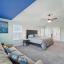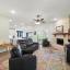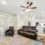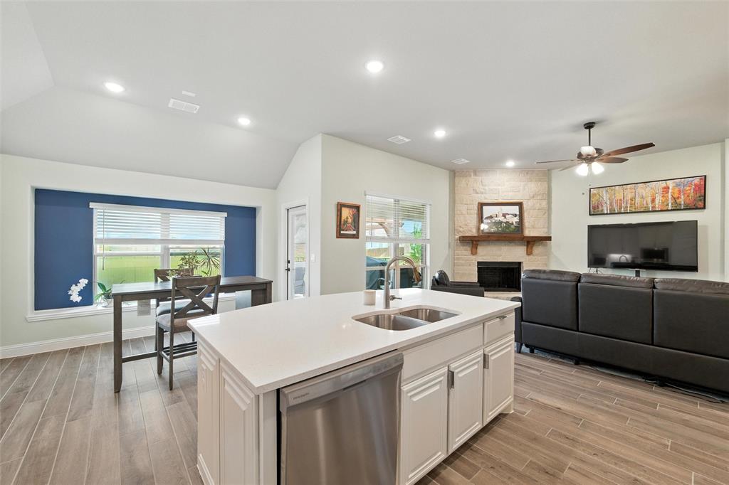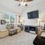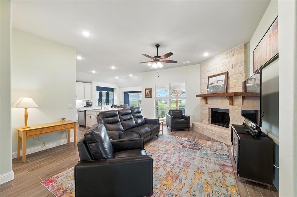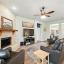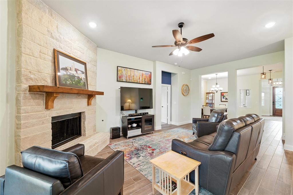 The living room makes a statement with a striking floor-to-ceiling Austin stone fireplace, perfect for cozy evenings or entertaining guests.