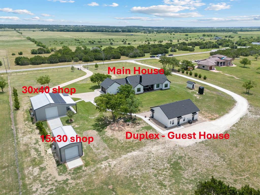 Modern Farmhouse Retreat with Newly completed in 2024 Guest Duplex & Dual Workshops. Welcome to your dream retreat, blending modern farmhouse charm with functionality and comfort. This open-concept residence boasts soaring ceilings and a thoughtful layout featuring 3 bedrooms plus a private office, offering ideal privacy for family, guests, or work-from-home needs. The chef’s kitchen is a standout with quartz countertops, elegant tall cabinetry including upper-lit display cabinets, a high-end gas range, and a sleek stainless-steel vent hood—perfect for everyday meals or entertaining. Step outside to find not one, but two climate-controlled workshops: a 30x40 fully insulated shop with bathroom and laundry facilities, and a 15x30 shop, both offering heating and air conditioning. Whether you're a hobbyist, entrepreneur, or need extra storage, these spaces are ready for anything. In addition, a newly constructed duplex guest house provides 3 bedrooms and 2 full baths combined—ideal for extended family, rental income, or private visitors. Additional upgrades include a premium water filtration system, a 3,500-gallon water tank, and numerous interior and exterior enhancements too extensive to list. All this just 20 minutes south of Glen Rose and 5 minutes from Rough Creek Lodge—perfectly positioned for privacy, convenience, and the peace of country living. A truly rare and versatile property