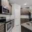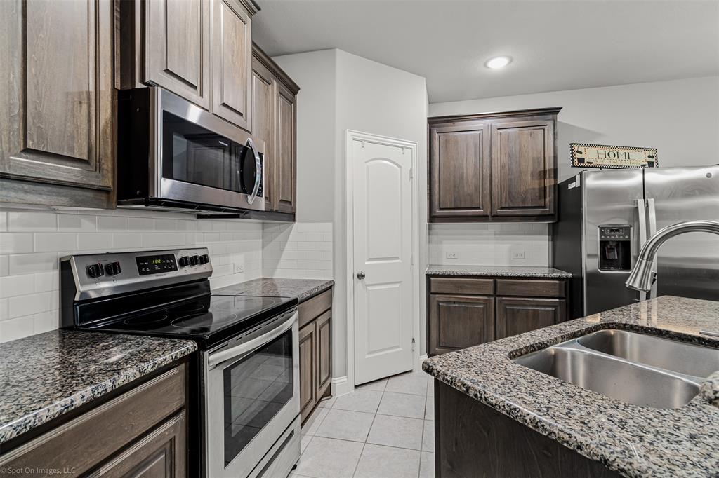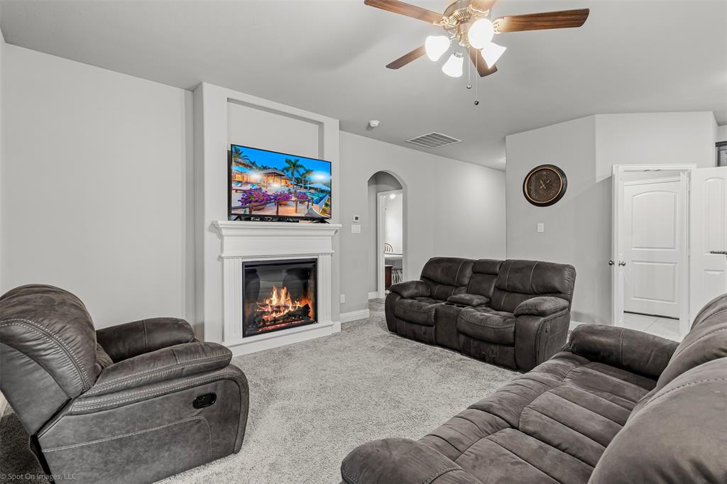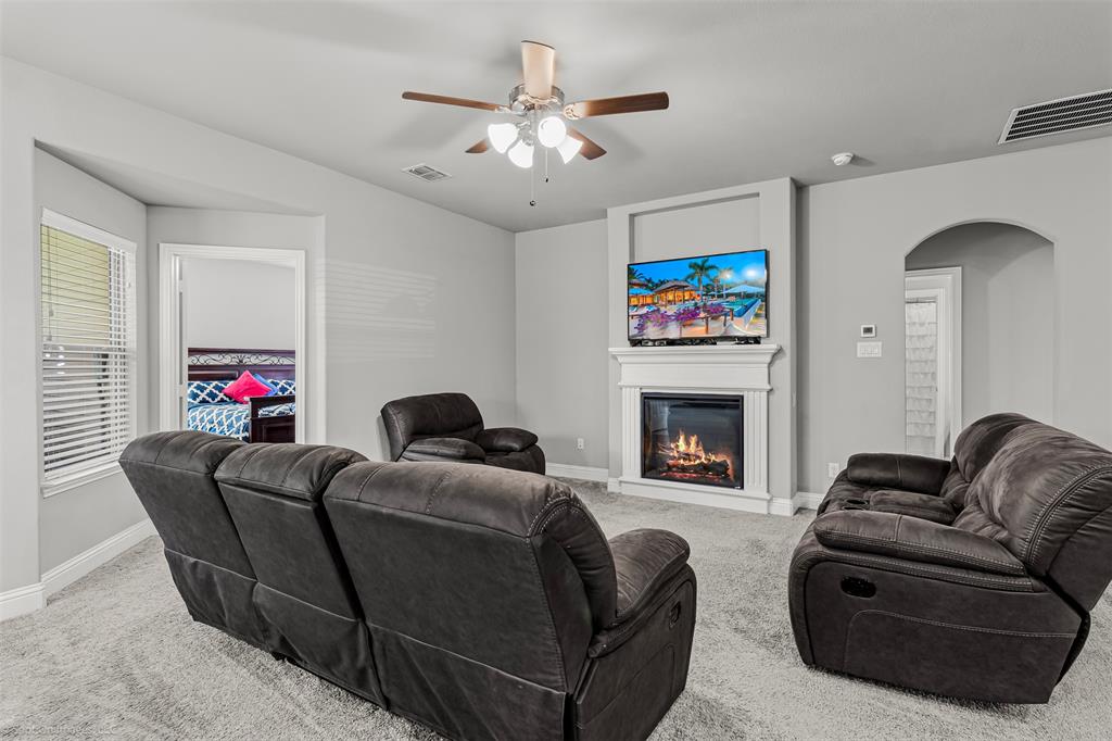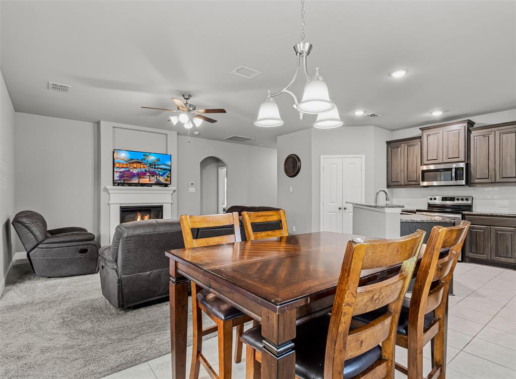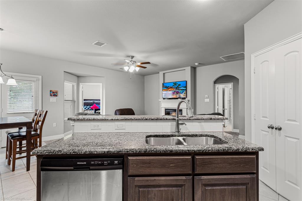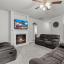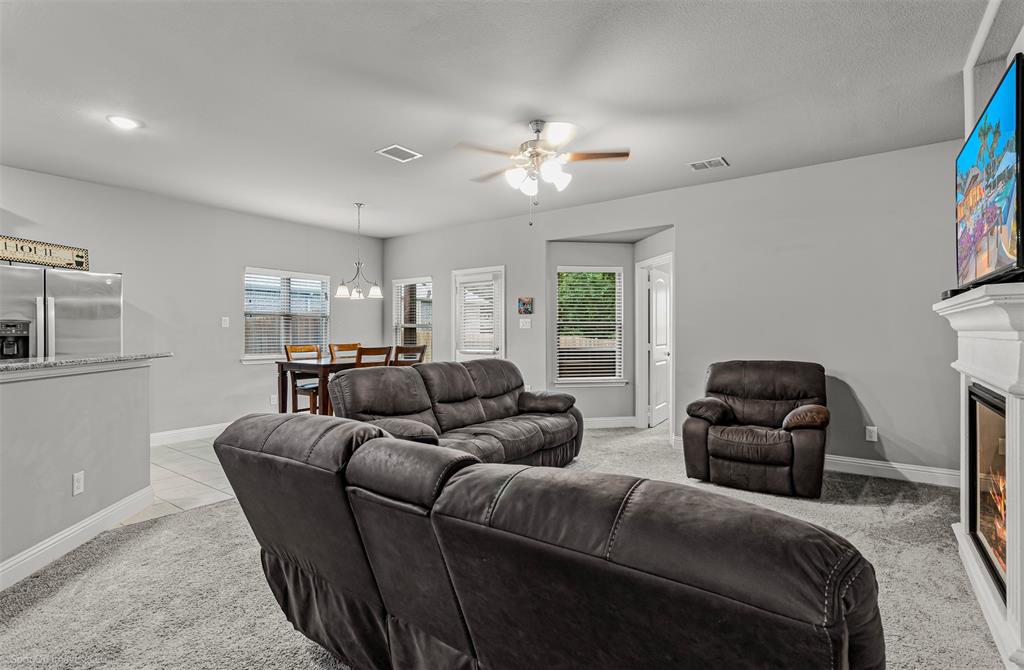 Designed for both everyday living and entertaining, the open-concept kitchen and living area showcases an electric fireplace and a large island that’s perfect for gatherings with family and friends.