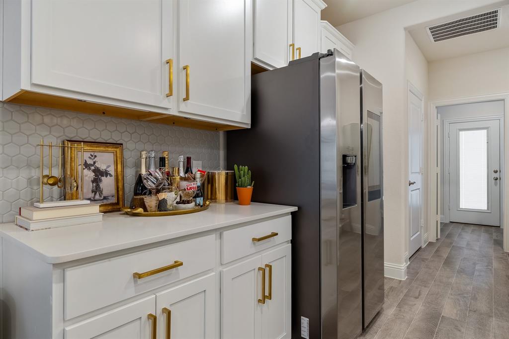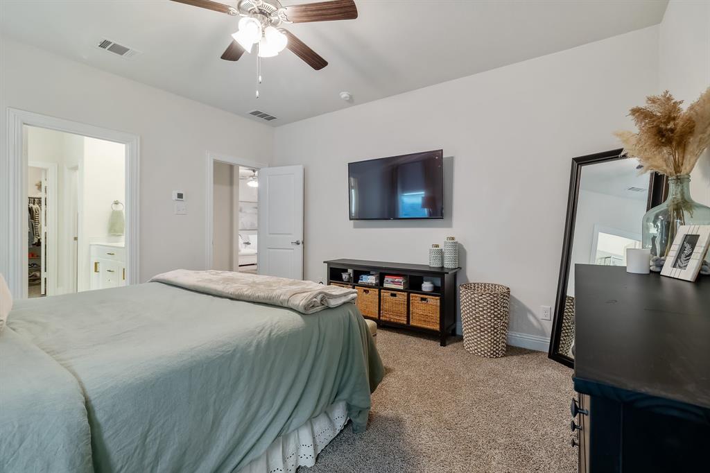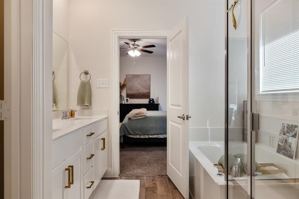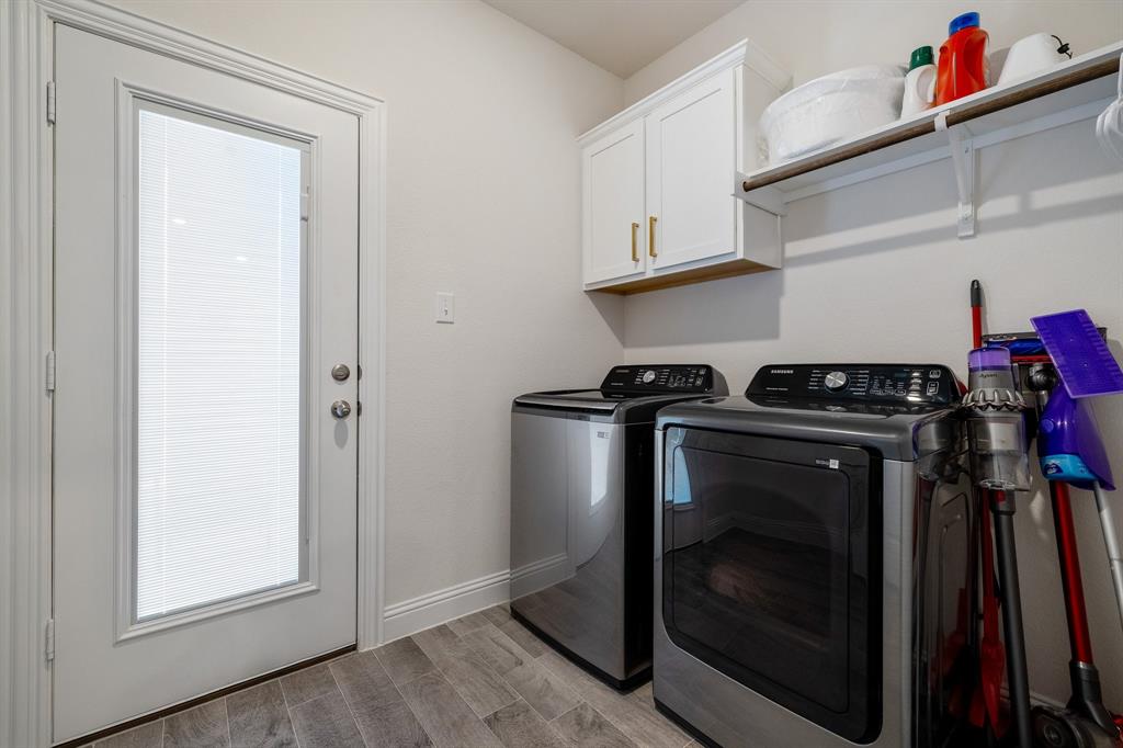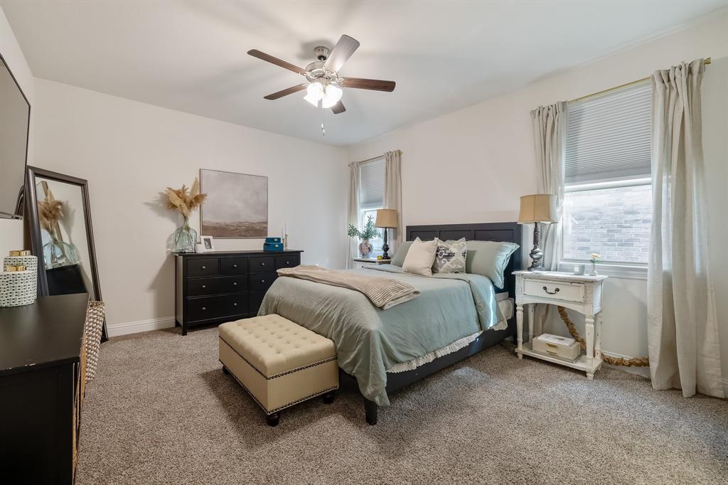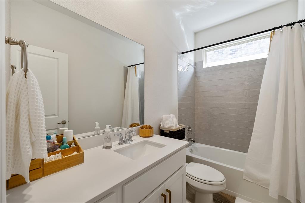 The private primary suite is a true retreat, featuring dual vanities, a walk-in shower, a luxurious garden tub, and a generous walk-in closet. Secondary bedrooms are comfortably sized, and the laundry room includes built-in cabinets for extra storage and convenience.