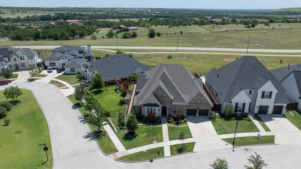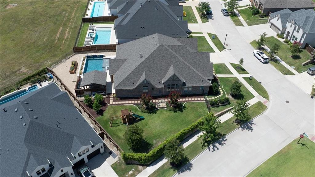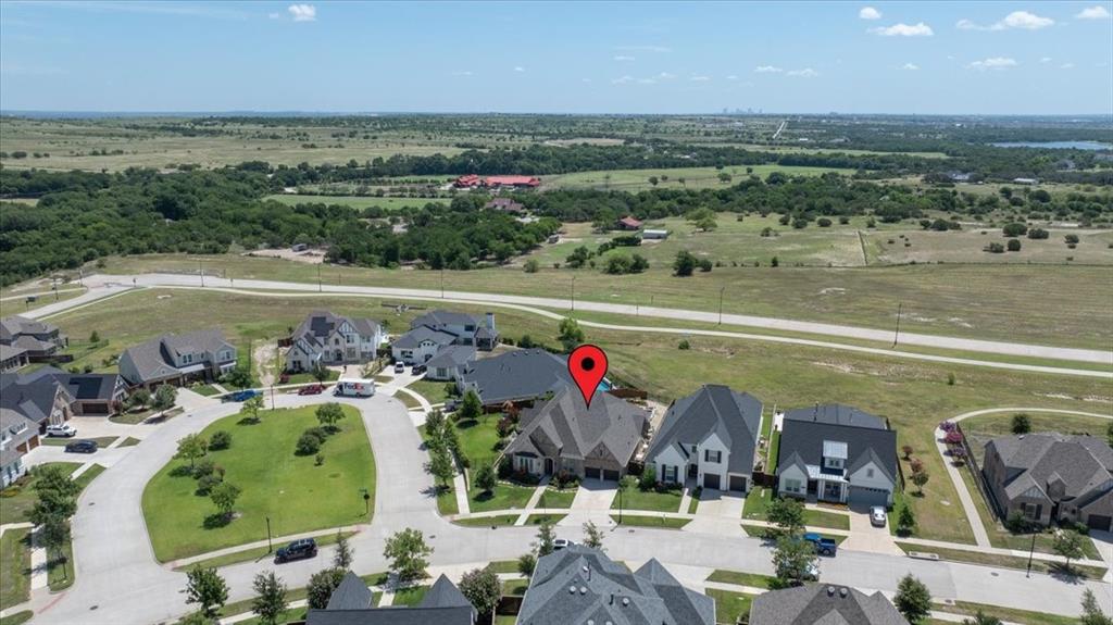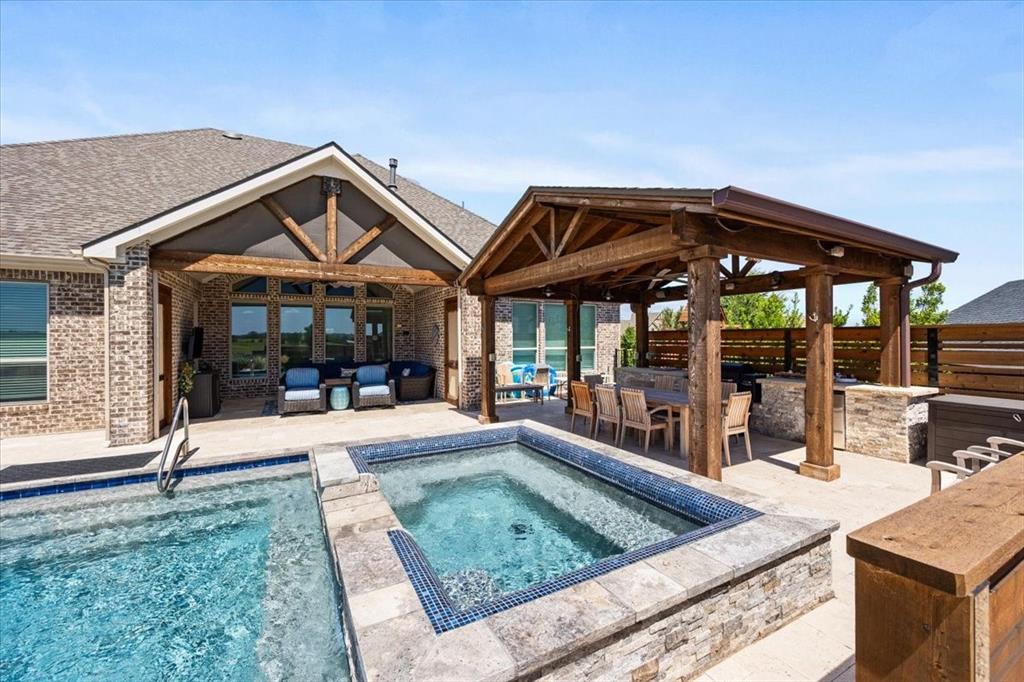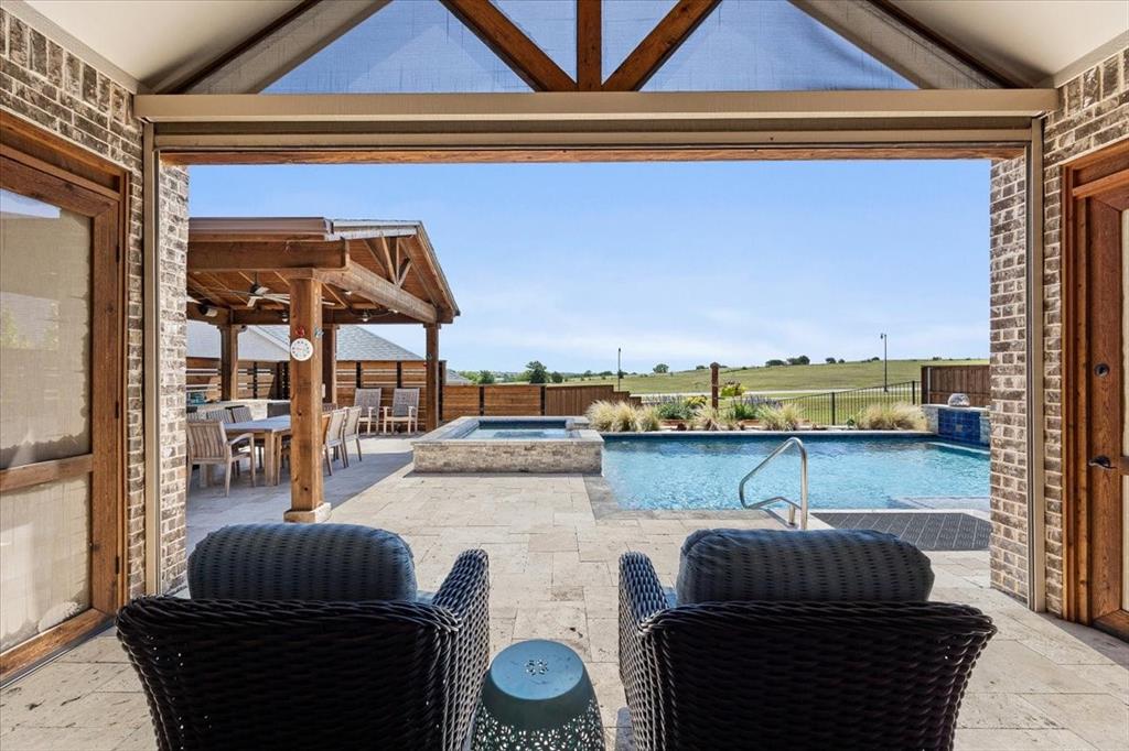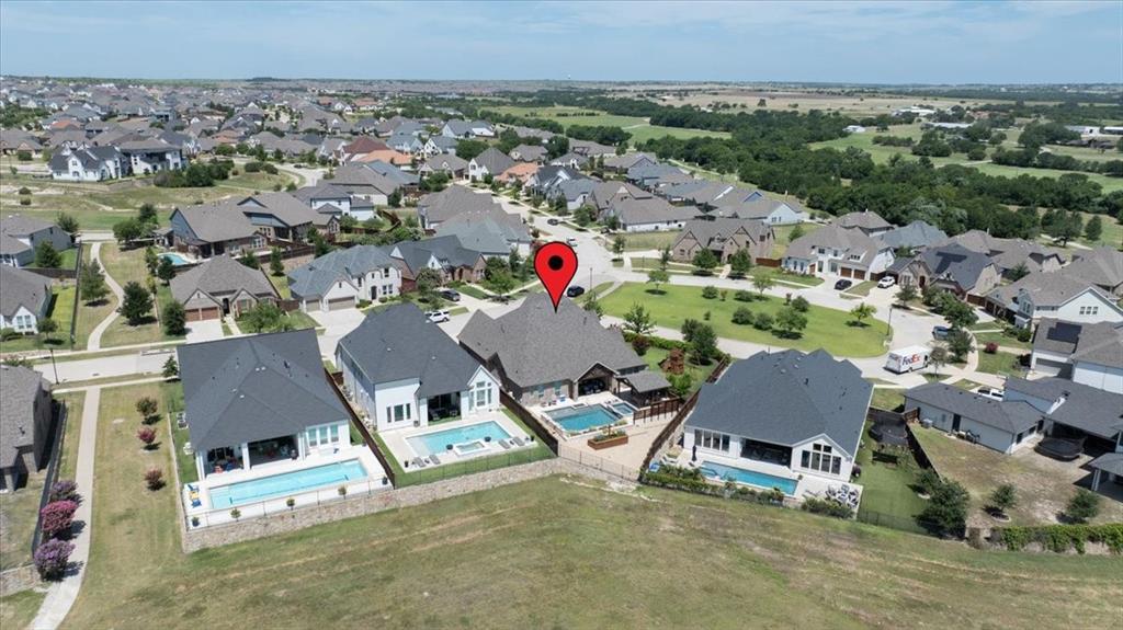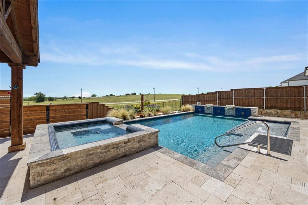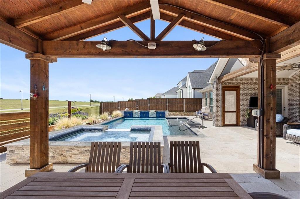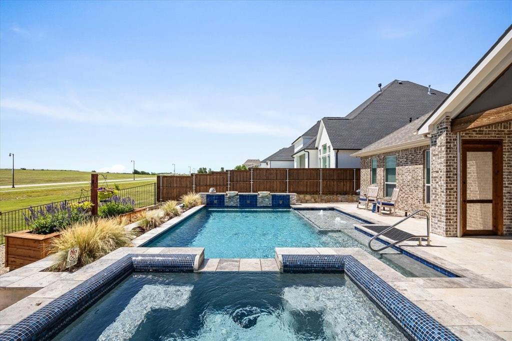 An opportunity to own one of the best properties in the Walsh community. Built by Britton Homes with 4 bedrooms, 4 and half bathrooms, private study, media room, formal dining room, open living, dining and kitchen, this home has so many upgrades and designer features inside and out. The beautifully landscaped corner lot with additional green space and trees welcomes you into the spacious entry with an elevated ceiling feature and additional lights. The private study with a wood board accent wall and designer light fixtures. The media room or additional family space and formal dining room are upgraded with a wooden ceiling. The stone to ceiling fireplace in the open living and kitchen along with wooden ceiling beams give the space a grand feel. Your attention is immediately drawn to the open pasture beyond the outdoor living space and salt water pool. WHAT A VIEW! This outdoor space is top notch with surround sound, water features, outdoor kitchen and dining area just to name a a few. The kitchen is a chef's dream! With double ovens, over sized island with one solid granite piece, gas range, wine fridge and additional china cabinet. Additional windows and fireplace to the primary suite give it a true retreat feel. New carpet just installed in bedrooms, roof upgraded in 2024, Generac Generator connected to house gas line, storm shelter closet. Enjoy all the amenities Walsh has to offer to include pools. tennis, makers space, gym, convenience store, community events and more!