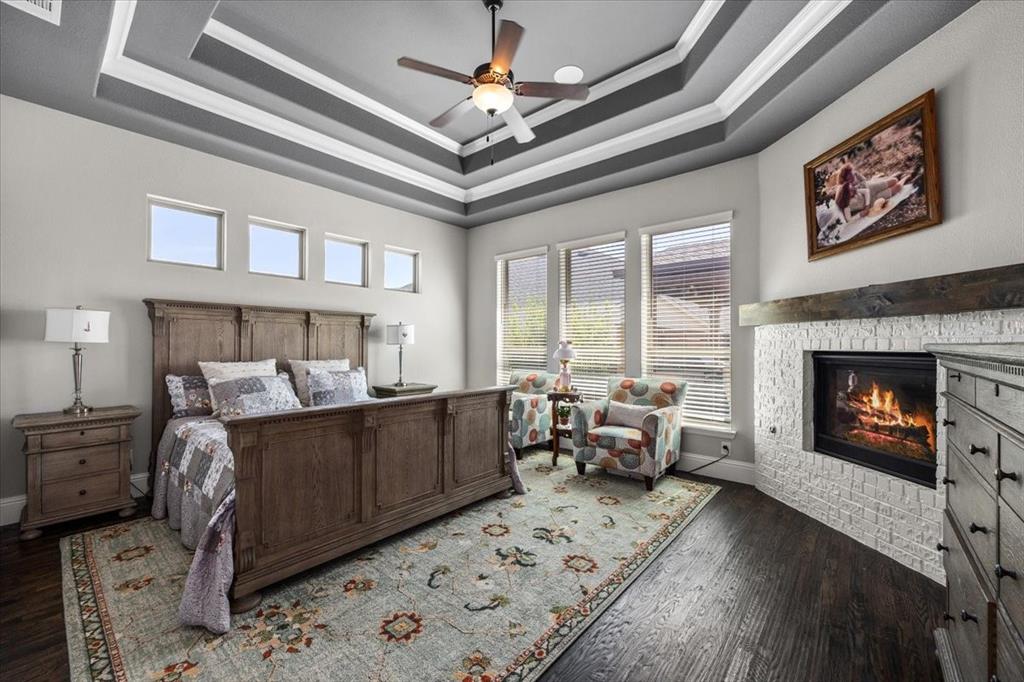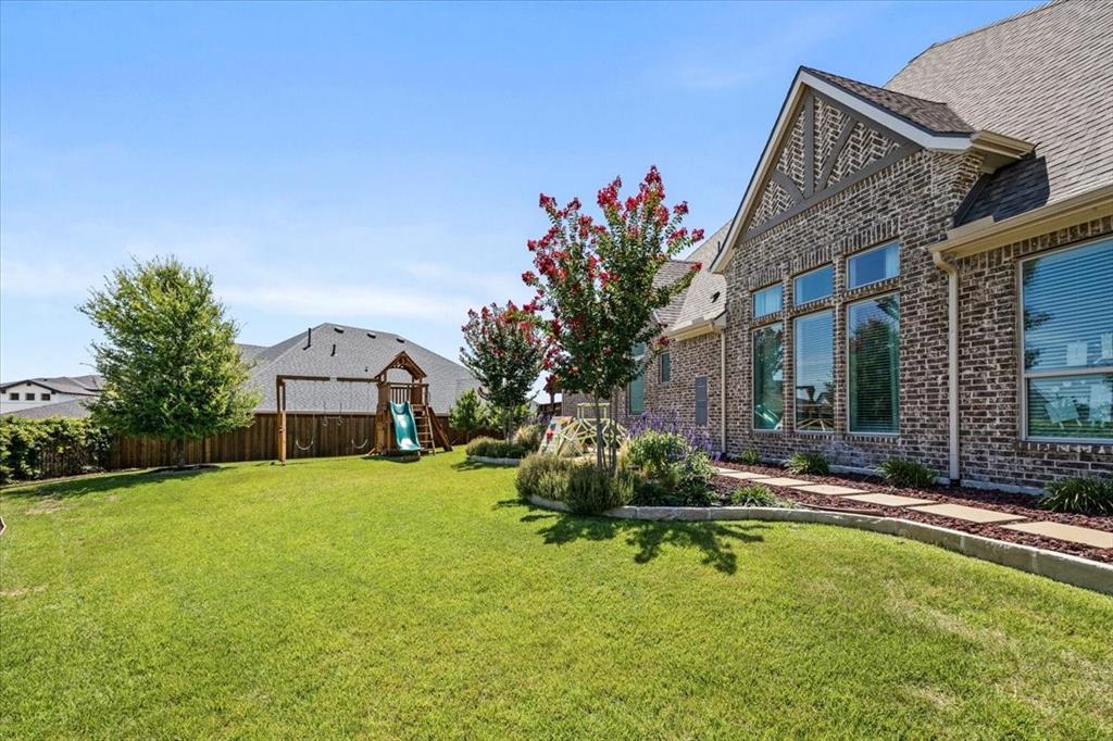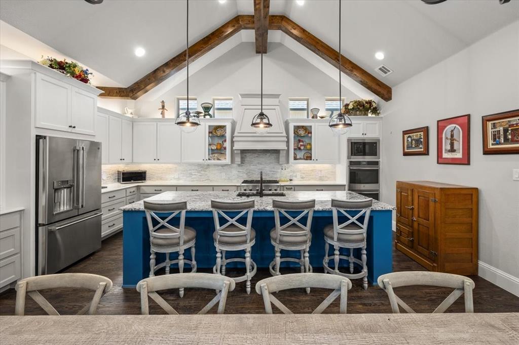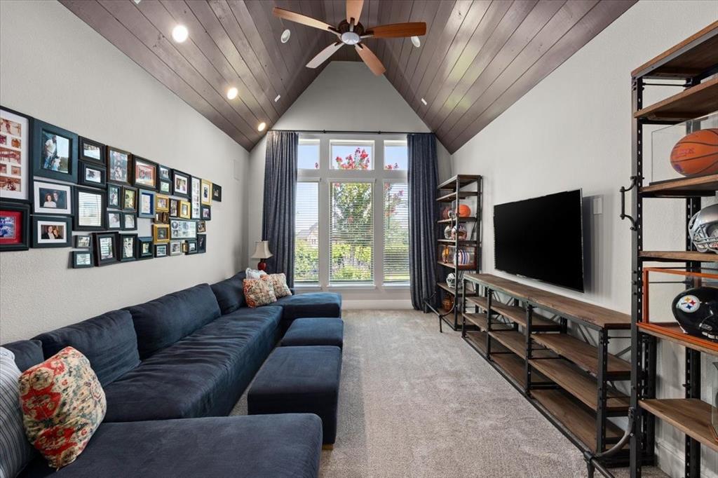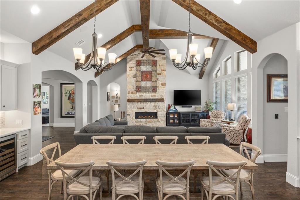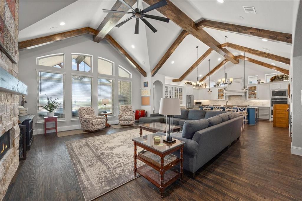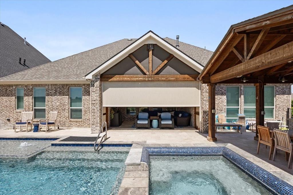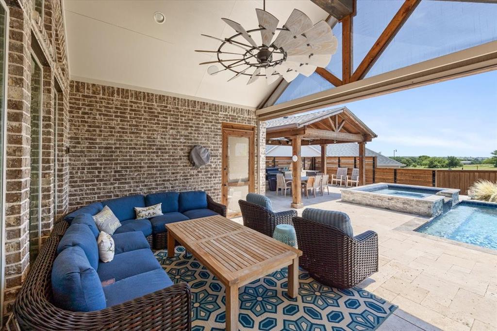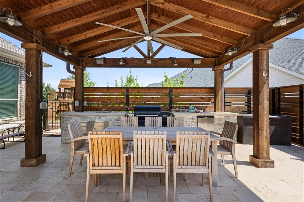 An opportunity to own one of the best properties in the Walsh community. Built by Britton Homes with 4 bedrooms, 4 and half bathrooms, private study, media room, formal dining room, open living, dining and kitchen, this home has so many upgrades and designer features inside and out. The beautifully landscaped corner lot with additional green space and trees welcomes you into the spacious entry with an elevated ceiling feature and additional lights. The private study with a wood board accent wall and designer light fixtures. The media room or additional family space and formal dining room are upgraded with a wooden ceiling. The stone to ceiling fireplace in the open living and kitchen along with wooden ceiling beams give the space a grand feel. Your attention is immediately drawn to the open pasture beyond the outdoor living space and salt water pool. WHAT A VIEW! This outdoor space is top notch with surround sound, water features, outdoor kitchen and dining area just to name a a few. The kitchen is a chef's dream! With double ovens, over sized island with one solid granite piece, gas range, wine fridge and additional china cabinet. Additional windows and fireplace to the primary suite give it a true retreat feel. New carpet just installed in bedrooms, roof upgraded in 2024, Generac Generator connected to house gas line, storm shelter closet. Enjoy all the amenities Walsh has to offer to include pools. tennis, makers space, gym, convenience store, community events and more!