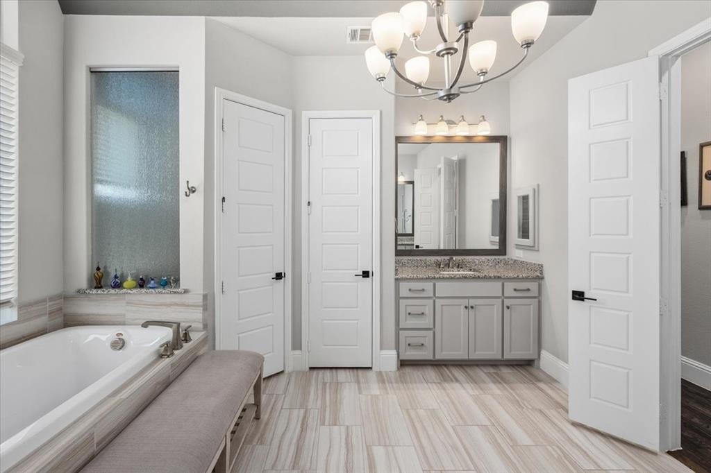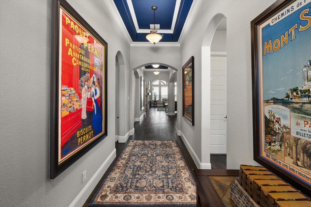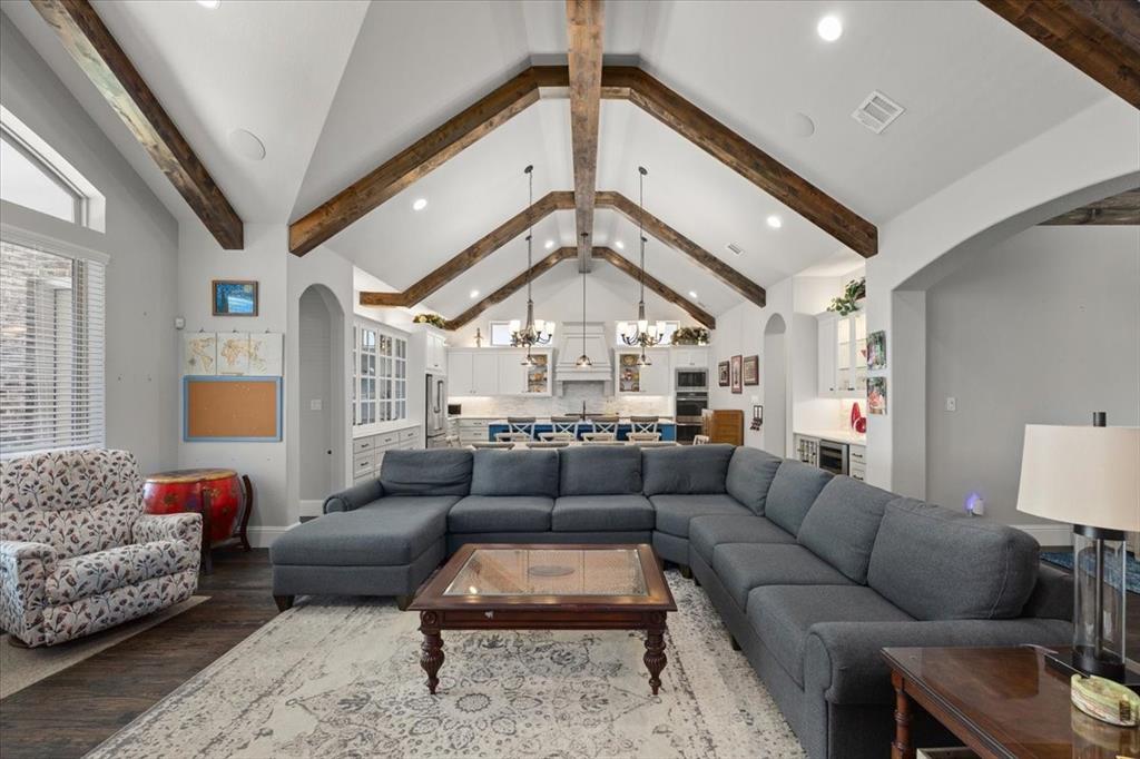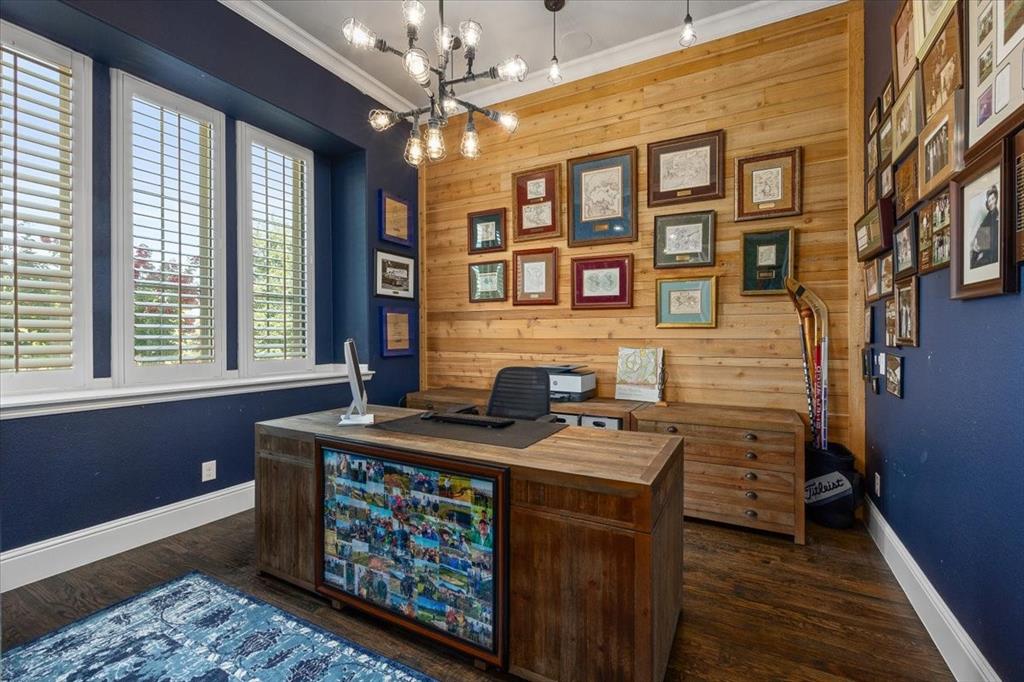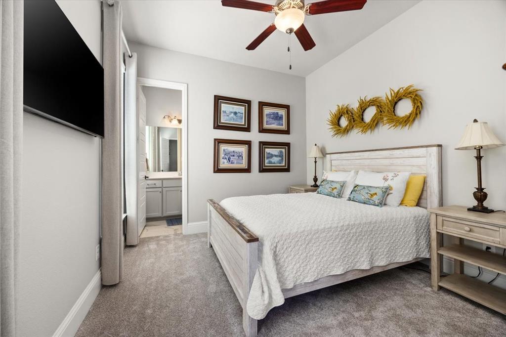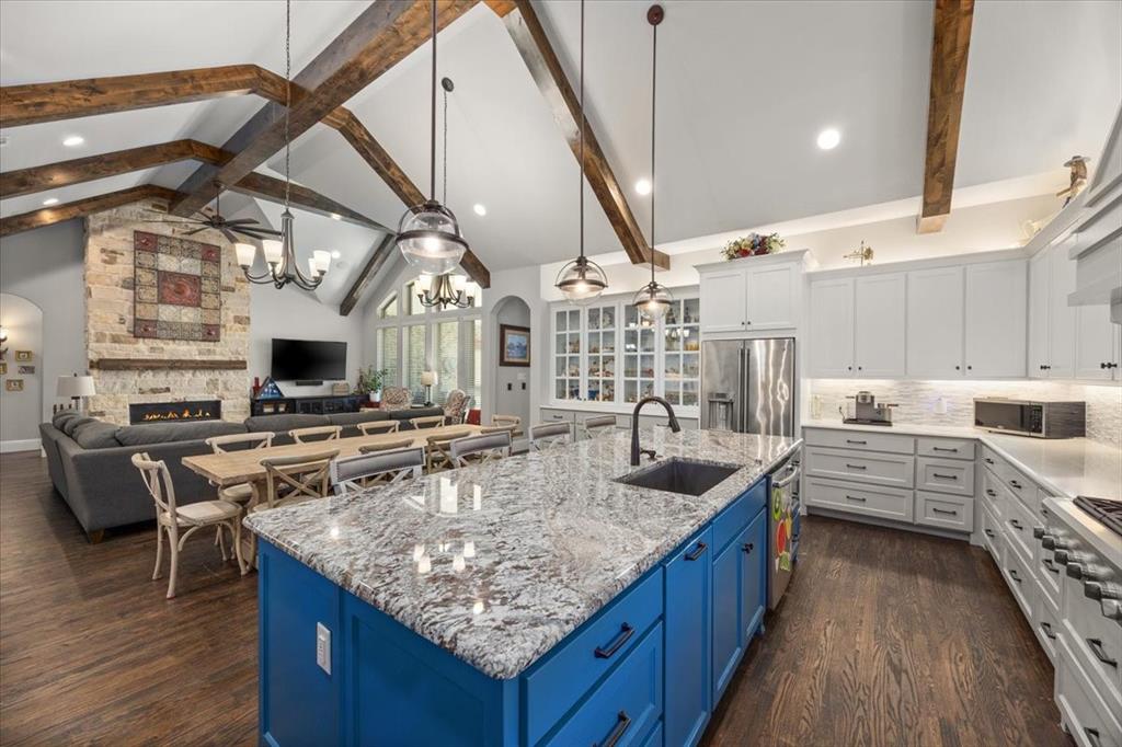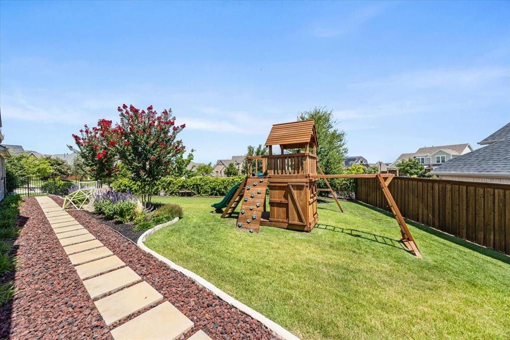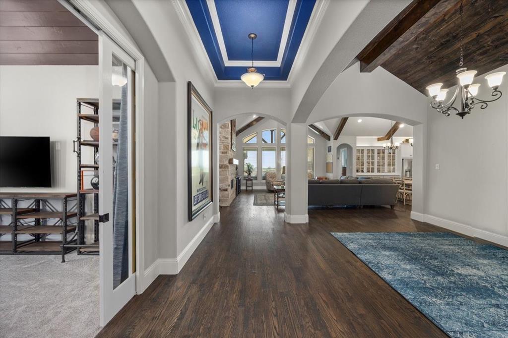 An opportunity to own one of the best properties in the Walsh community. Built by Britton Homes with 4 bedrooms, 4 and half bathrooms, private study, media room, formal dining room, open living, dining and kitchen, this home has so many upgrades and designer features inside and out. The beautifully landscaped corner lot with additional green space and trees welcomes you into the spacious entry with an elevated ceiling feature and additional lights. The private study with a wood board accent wall and designer light fixtures. The media room or additional family space and formal dining room are upgraded with a wooden ceiling. The stone to ceiling fireplace in the open living and kitchen along with wooden ceiling beams give the space a grand feel. Your attention is immediately drawn to the open pasture beyond the outdoor living space and salt water pool. WHAT A VIEW! This outdoor space is top notch with surround sound, water features, outdoor kitchen and dining area just to name a a few. The kitchen is a chef's dream! With double ovens, over sized island with one solid granite piece, gas range, wine fridge and additional china cabinet. Additional windows and fireplace to the primary suite give it a true retreat feel. New carpet just installed in bedrooms, roof upgraded in 2024, Generac Generator connected to house gas line, storm shelter closet. Enjoy all the amenities Walsh has to offer to include pools. tennis, makers space, gym, convenience store, community events and more!