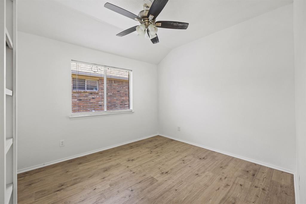 The private primary suite offers a peaceful retreat with high ceilings, a large garden tub, separate shower, dual sinks, and a generous walk-in closet. Two additional split bedrooms provide plenty of closet space and storage for both family and guests. Both bathrooms feature updated vanities, and window blinds are installed throughout the home.