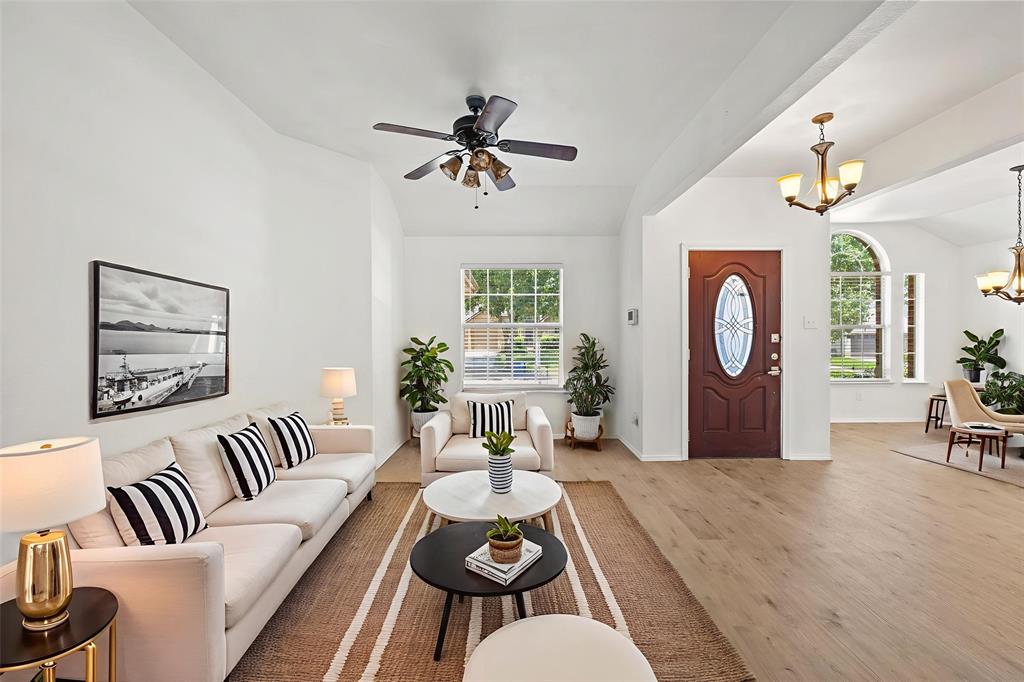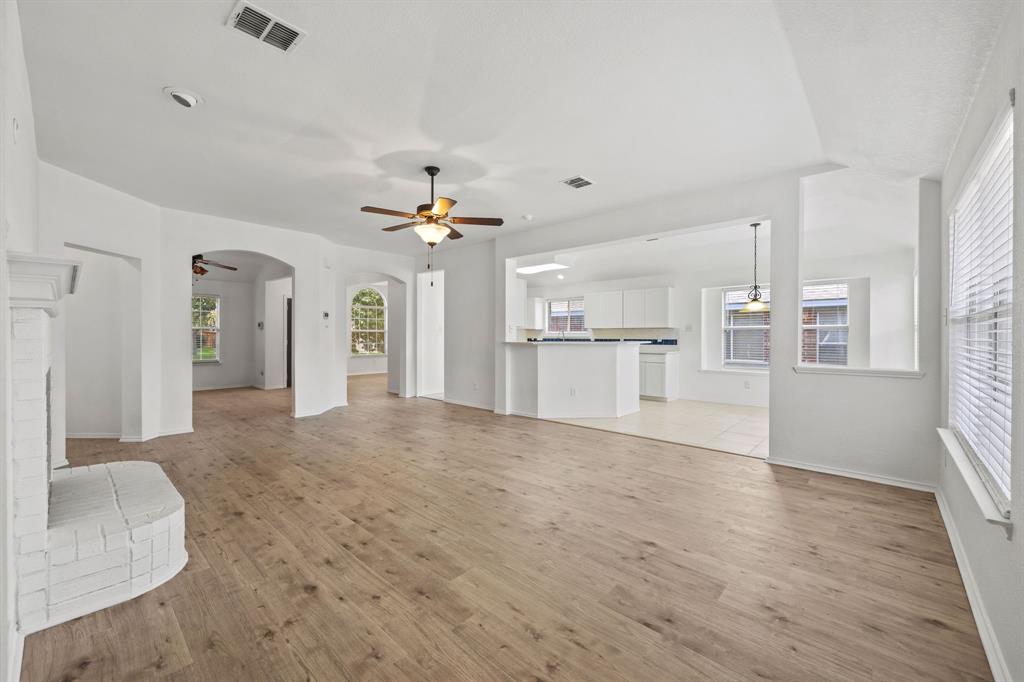 Step inside to brand-new Pergo flooring and fresh neutral paint that flow seamlessly through the entire home. The spacious, light-filled layout is highlighted by arched doorways and a wall of windows that bathe the living areas in natural light. The inviting family room, complete with a charming brick fireplace, opens to the kitchen and dining spaces—perfect for entertaining.