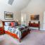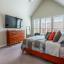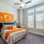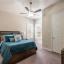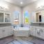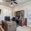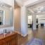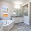 The primary suite features vaulted ceilings, neutral tones, and plantation shutters. Its spa-inspired bath includes separate vanities, framed mirrors, a soaking tub framed by dual windows with double shades, an oversized marble-look tiled shower, and a spacious walk-in closet. The fourth bedroom has upgraded hardwood flooring and French doors—ideal as a guest room or office.