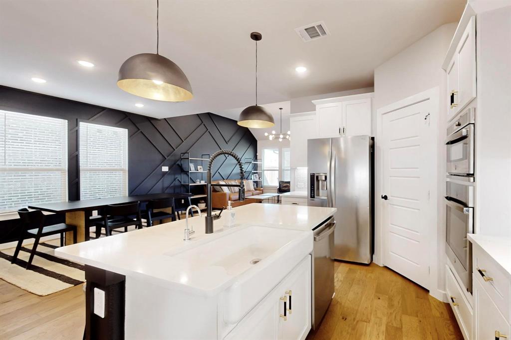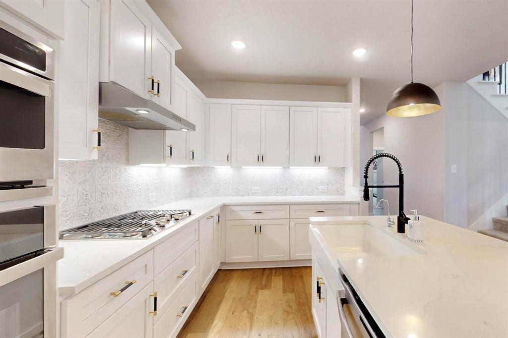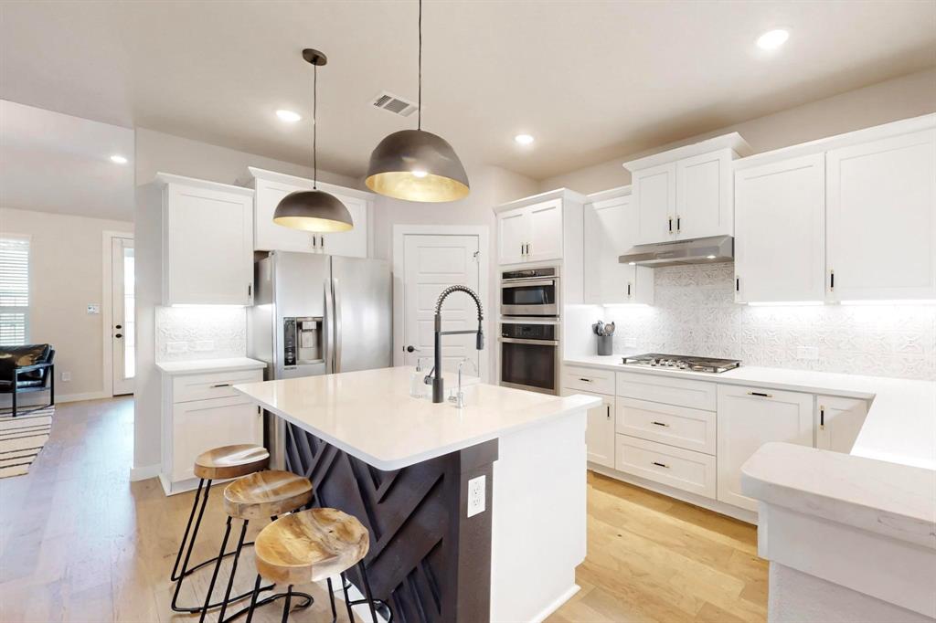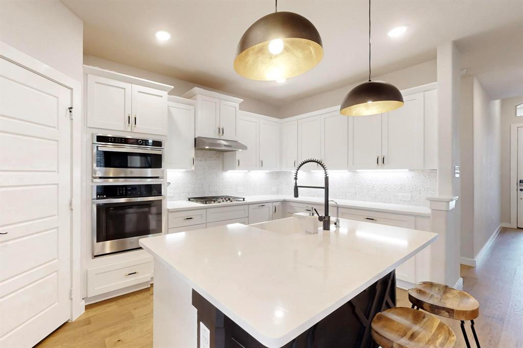 The heart of the home is the open-concept kitchen, complete with quartz countertops, designer backsplash, gas cooktop, wall oven, microwave, and walk-in pantry. Overlooking the dining and living areas, it’s the perfect space to gather with family and friends.