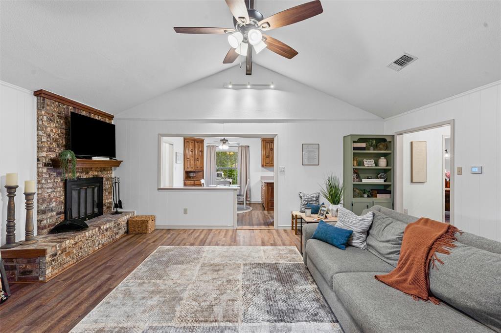 Step inside to find a spacious living room accentuated by a vaulted ceiling and a cozy wood-burning fireplace — ideal for family gatherings or quiet evenings. New vinyl plank flooring and plush carpet flow seamlessly throughout the home, reflecting quality craftsmanship. Freshly painted walls in a neutral palette enhance the sense of space and light, creating an inviting atmosphere.