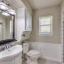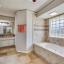 The spacious primary suite includes a luxurious Hollywood-style bathroom with separate his-and-hers sinks and closets, a walk-in shower, and a large jetted tub surrounded by elegant marble flooring and accents.