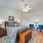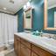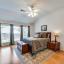 The split bedroom layout offers privacy, with the primary suite tucked away at the back of the home. A wall of windows fills the bedroom with soft natural light. The ensuite bath includes a garden tub with a large opaque window above, separate shower, private toilet room, walk-in closet, and dual sinks. The guest bathroom also features double sinks, Corian countertops, dual mirrors, and a stylish custom color finish.