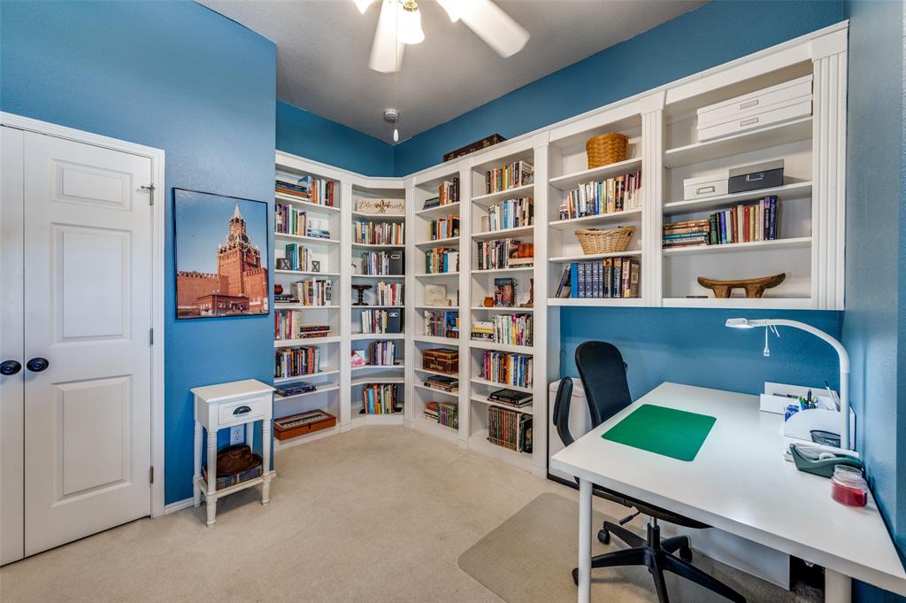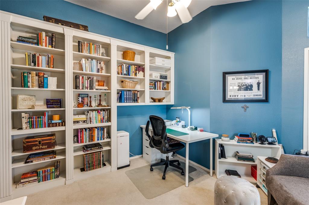 From the moment you step through the large formal entry, you are welcomed by graceful design and abundant natural light. The formal living and dining rooms are elegantly appointed with plantation shutters and offer the perfect setting for entertaining. To the right, the fourth bedroom doubles as a home office, complete with French doors, custom built-in shelves, and a full closet.