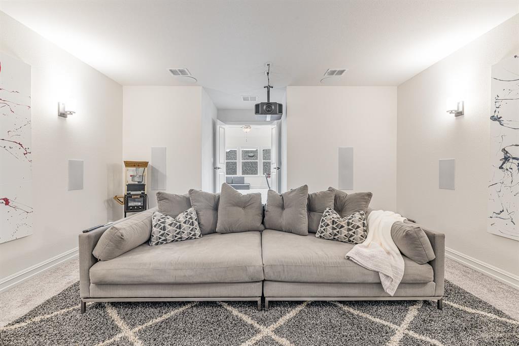 Designed for the tech-savvy and entertainer alike, the entire home is pre-wired for a full AV rack—including built-in speaker wiring in the kitchen, living, primary bedroom, bath, patio, media room, and even the landscape perimeter. Christmas light outlets are tied to interior switches, and network access points are prewired throughout. Outdoors, enjoy a covered patio with gas line for grilling and a large landscaped yard. Laundry room includes built-in sink. The primary suite features a tray ceiling and a spa-style bath with an oversized walk-in shower, dual vanities, and a spacious walk-in closet. Located on a landscaped interior lot, just minutes from top-rated Denton ISD schools and close enough to the fire station for utility priority—this one truly has it all.
