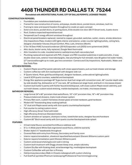 Experience the epitome of luxury in Dallas’ coveted Private School Corridor just minutes away from top-tier schools, upscale shopping, fine dining, golf and major highways. 4408 Thunder Rd perfectly sits on a 0.35-acre pool-sized corner lot with beautiful mature trees. Fully renovated and thoughtfully remodeled with designer features that WOW, the home’s modern design and upgrades provide luxury, comfort and high-end functionality. This STUNNING- Like New, Move-In Ready remodel exudes an open-floor plan with redefined spaces that complement daily living, entertainment, and work for busy professionals. Natural light emits gracefully through the double iron doors while white oak floors and designer tiles seamlessly align. A sleek matte fireplace and dry bar with wine frig complete the modern family room. Custom millwork, marble, and quartz compliment designer fixtures that flow throughout. The gourmet kitchen comes complete with custom cabinetry, under-cabinet lighting, an 8 burner- 48” gas range, custom vent hood, side-by-side frig, dishwasher, coffee bar, quartz backsplash and a 9’ waterfall island. The home's working walk-in pantry equipped with an ice maker, microwave drawer, trash bin and sink are ideal for meal prep or hosting. Three spacious-ensuite baths, an additional secondary bath and separate in-law suite provide both convenience and functionality. The spacious owner-suite offers direct access to the covered patio and encompasses its own coffee-tea bar with pot filler, sitting area, and custom closet. Double doors open to the spa-like bath embodied by large format floor-to-ceiling tiles, dual sinks, smart bidet toilet, freestanding tub, triple mode shower system, and a generous secondary walk-in closet with a full length dressing mirror. Got furry friends, the mudroom-drop zone houses a dog wash, eat and sleep area. The home’s stucco and brick exterior boast a timeless curb appeal while the elongated drive allows ample parking. Welcome home!