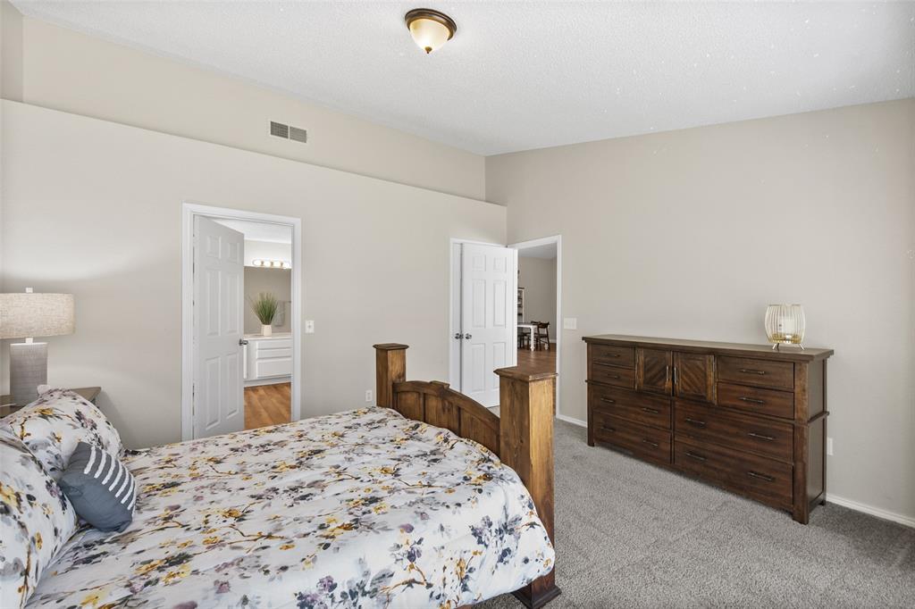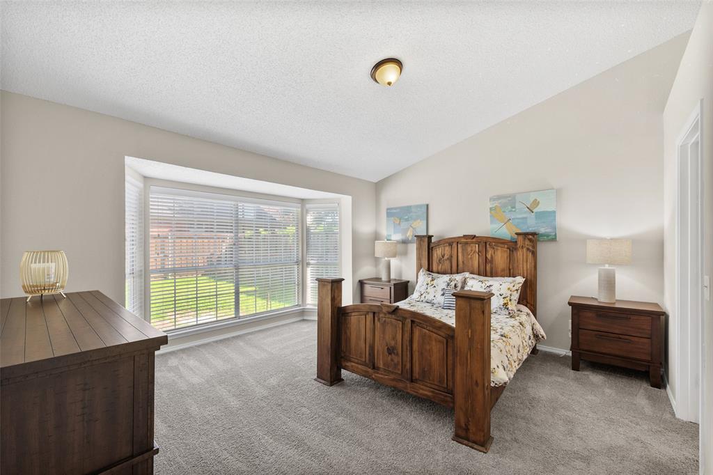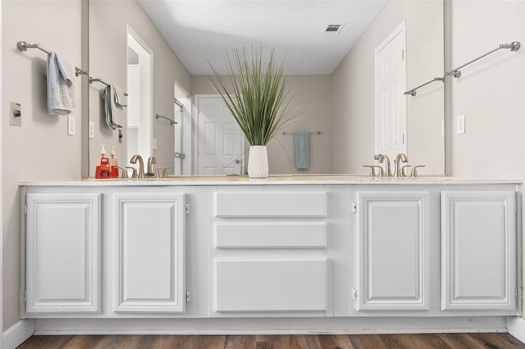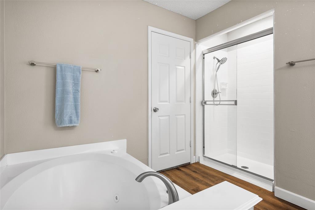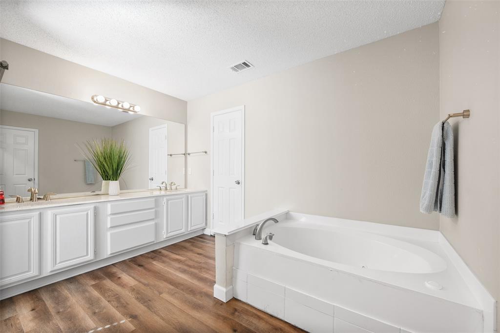 The spacious kitchen offers ample counter space, a breakfast bar, and open sight lines to the family room, making it easy to stay connected while cooking. The split-bedroom floor plan ensures privacy for the primary suite, which features a large walk-in closet, framed mirror, Jacuzzi soaking tub, and separate shower—a perfect retreat at the end of the day.