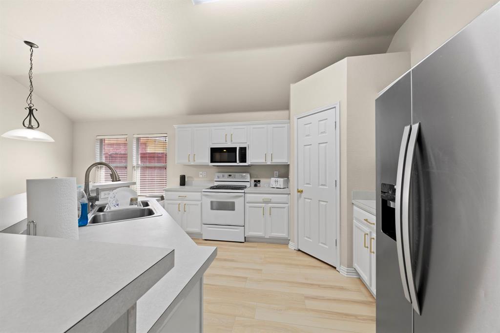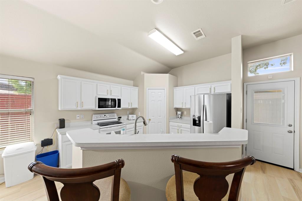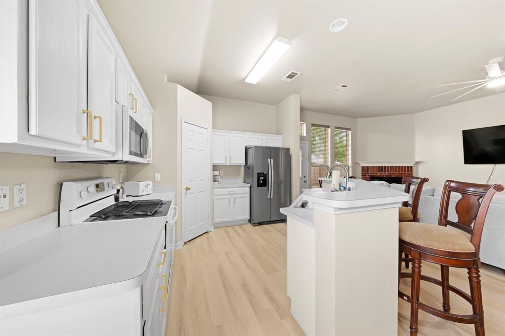 Spacious kitchen with abundant cabinet space and breakfast bar. Split-bedroom layout with large walk-in closets.